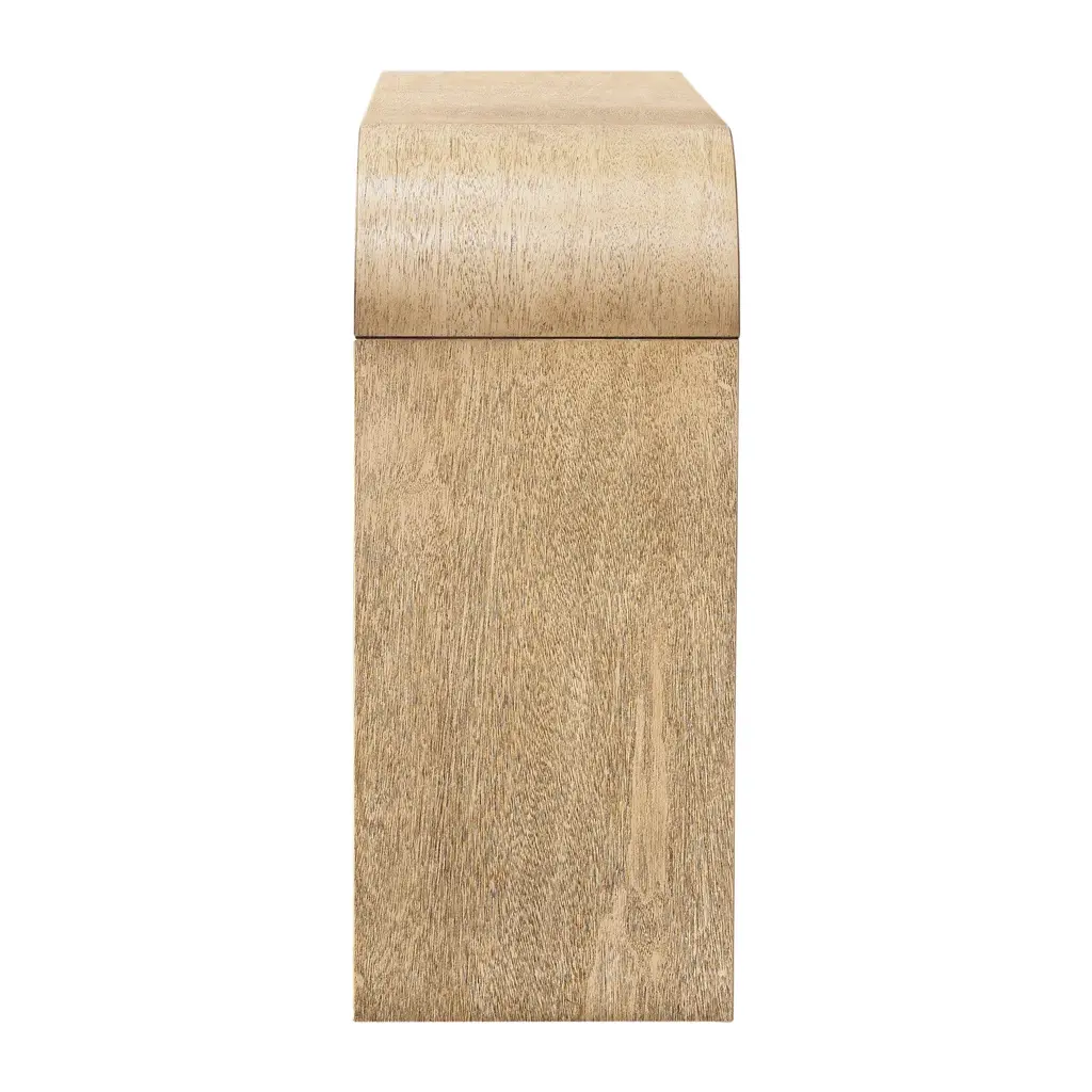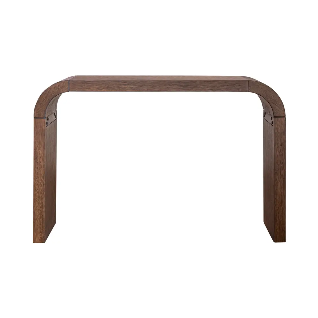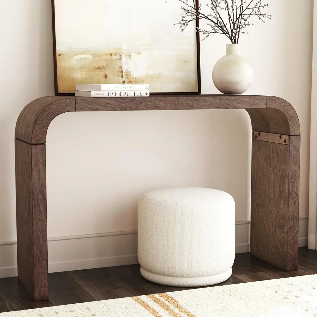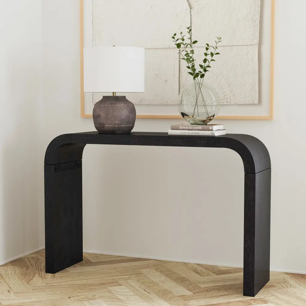 An ultramodern design with organic arched form reflects a postmodern influence reminiscent of minimalist 80s style. This console table, with its round, curved silhouette and linear simplicity, embodies contemporary sophistication, making it a perfect addition to any modern or eclectic living room or dining space. The slim profile, at just 15" deep, is ideal to add function to small areas like a narrow entryway or at the back of a couch.