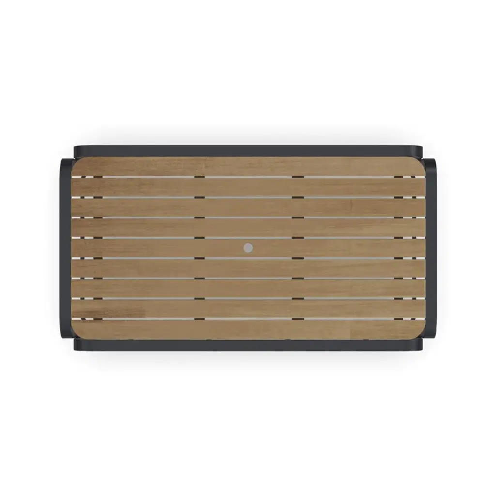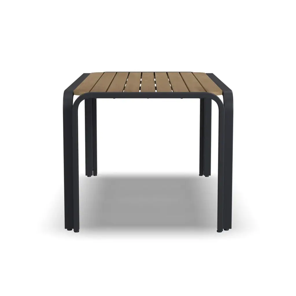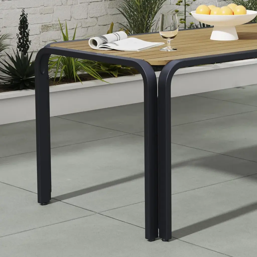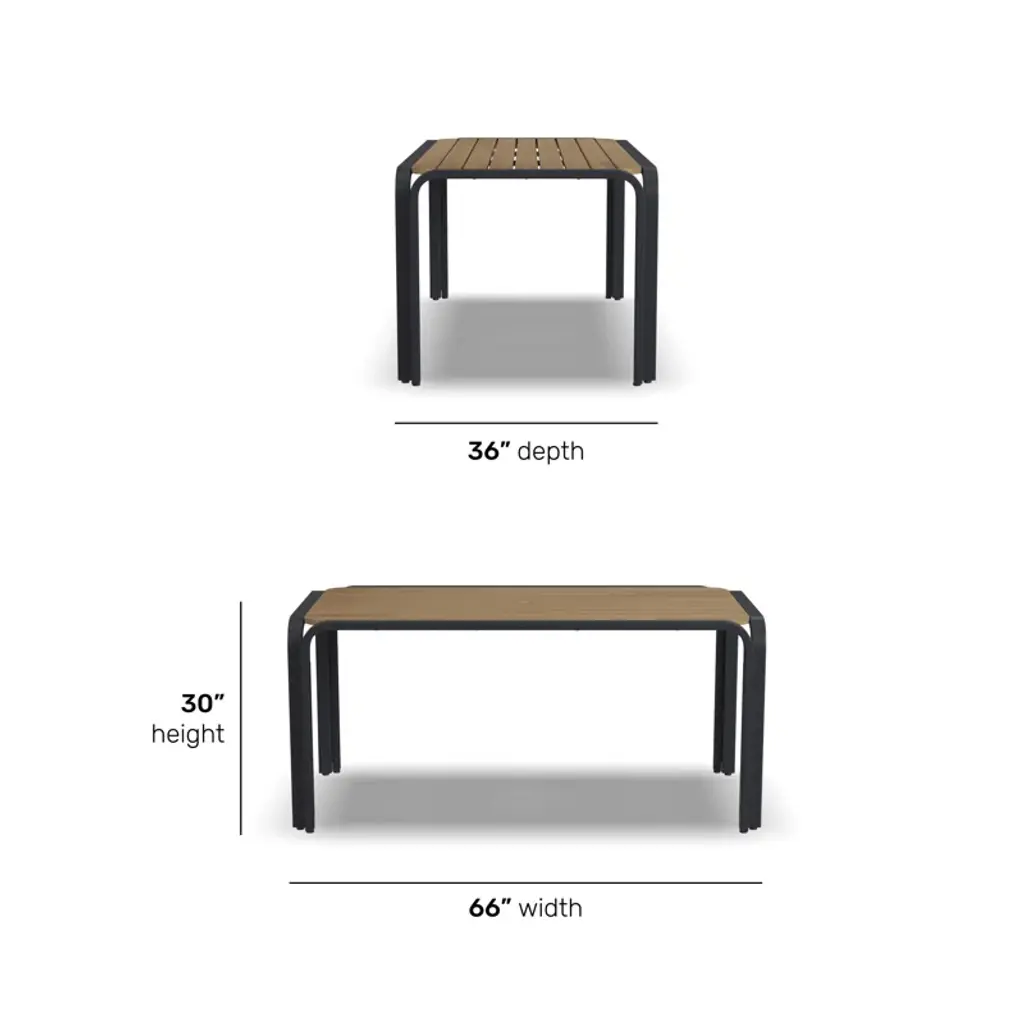 Elevate your outdoor entertaining with a laid-back, luxe look. Offering ample space for sharing meals with up to six people, this rectangular dining table is crafted with a recycled black aluminum frame that's lightweight yet remarkably sturdy, and a planked eucalyptus wood top that offers exceptional resistance against the elements. This two-tone, mixed-material design makes for a striking addition to any outdoor space.