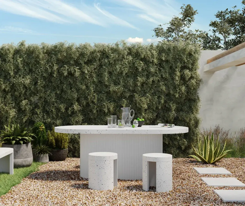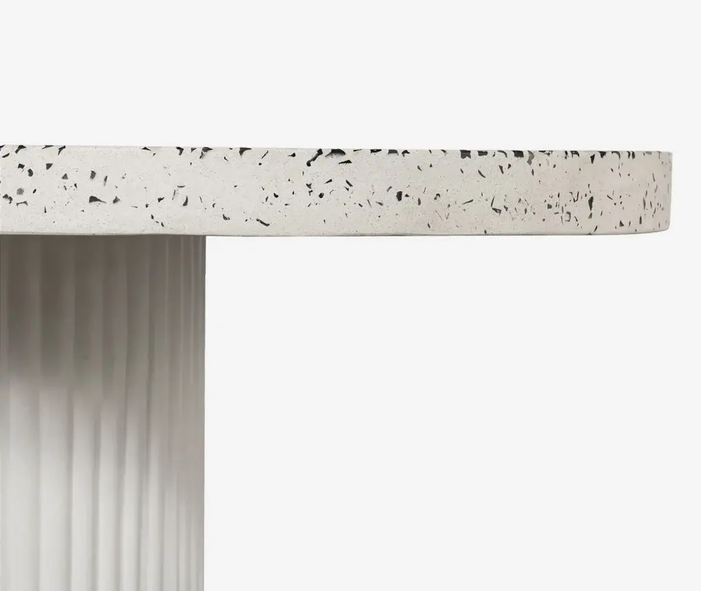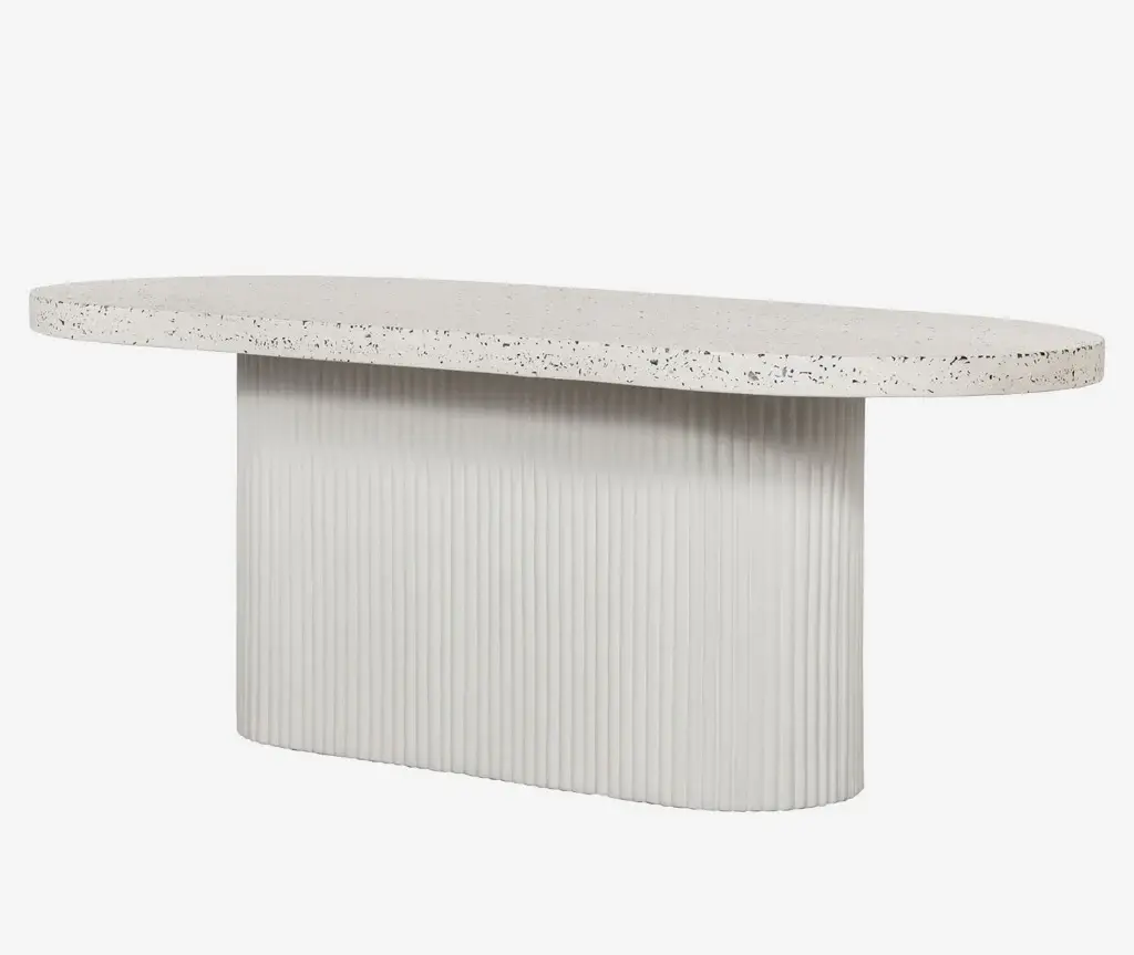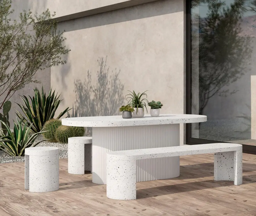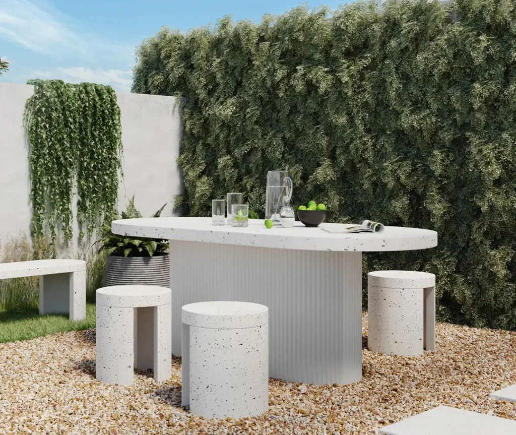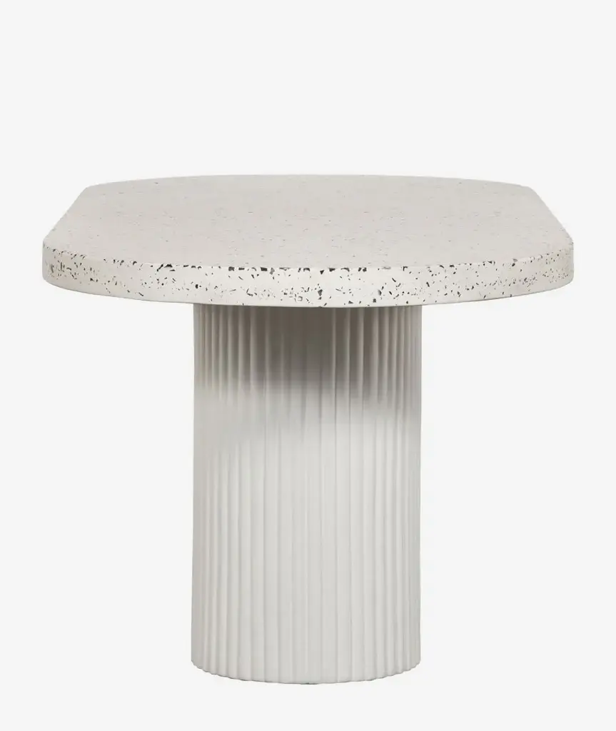 The foundation of beautiful happenings in your backyard, whether you’re casually enjoying the late afternoon sun, or dining late into the evenings. Perfect for an open-plan garden or patio setting, with spacious seating for 6, this outdoor dining table’s rounded geometric shape contrasts so well within an organic arrangement. Constructed in a unique concrete terrazzo composite, its foam core tabletop focuses on the natural beauty of minerals and adds visual texture with its ribbed, hollow base. A contemporary, ergonomic shape that will fit invitingly into any outdoor scene.