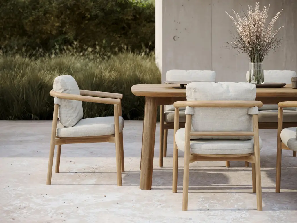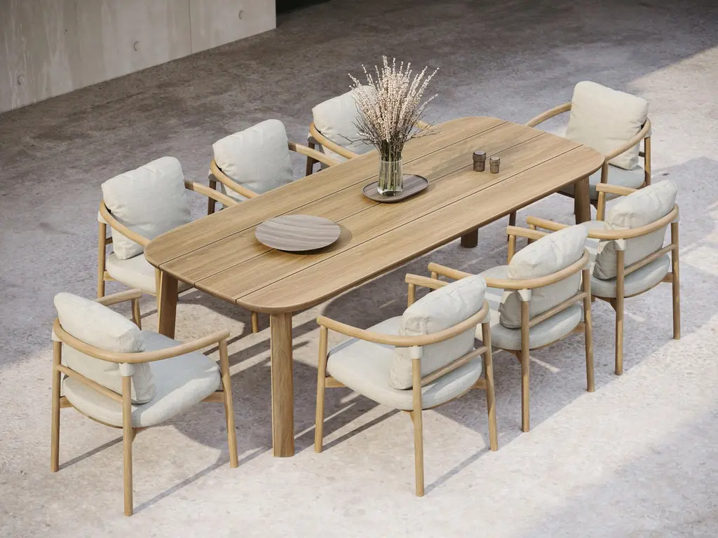 Lyora 250 FSC Teak Wood Oblong Dining Table For Eight by SNOCDimensions: D 110 x W 250 x H 77 cm.Materials: Teak wood.A delicate mid-century style, tempered by contemporary and eclectic incursions to create an elegant, but never flashy product. Simple lines, geometric shapes for a style that recalls functionality, but with class, to give every environment a touch of absolute uniqueness, elegance, and, why not, a pinch of history. The structure, entirely made of Teak wood, is embellished with fine workmanship to maximize its functionality and ergonomics. The collection is available in armchairs, two-seater and three-seater sofas with compact dimensions, as well as a modular unit featuring enveloping lines.SnocSince their foundation in 2004, SNOC’s history has been interwoven with that of international design. Each chapter written with care, each product reflecting its passion. The company understands that a real story exists behind each object and behind that story, a real person desiring something more. Their ever-developing methodology focuses on defining the core of a brand and utilizing those characteristics to help nurture its soul, aiding in forging real connections. This approach , results in their unique “work in progress” style: original, versatile solutions that in their signature blend of sound, vision and design best-suit every environment and situation, arousing a range of emotions on a daily basis as well as standing the test of time.Driven by functional research, an inclusive project and product culture, and deep care for the environment, we exist as the timeless yet present essence of outdoor furniture design elevating private and public space a like with thoughtfully presented, endlessly adaptive creations.