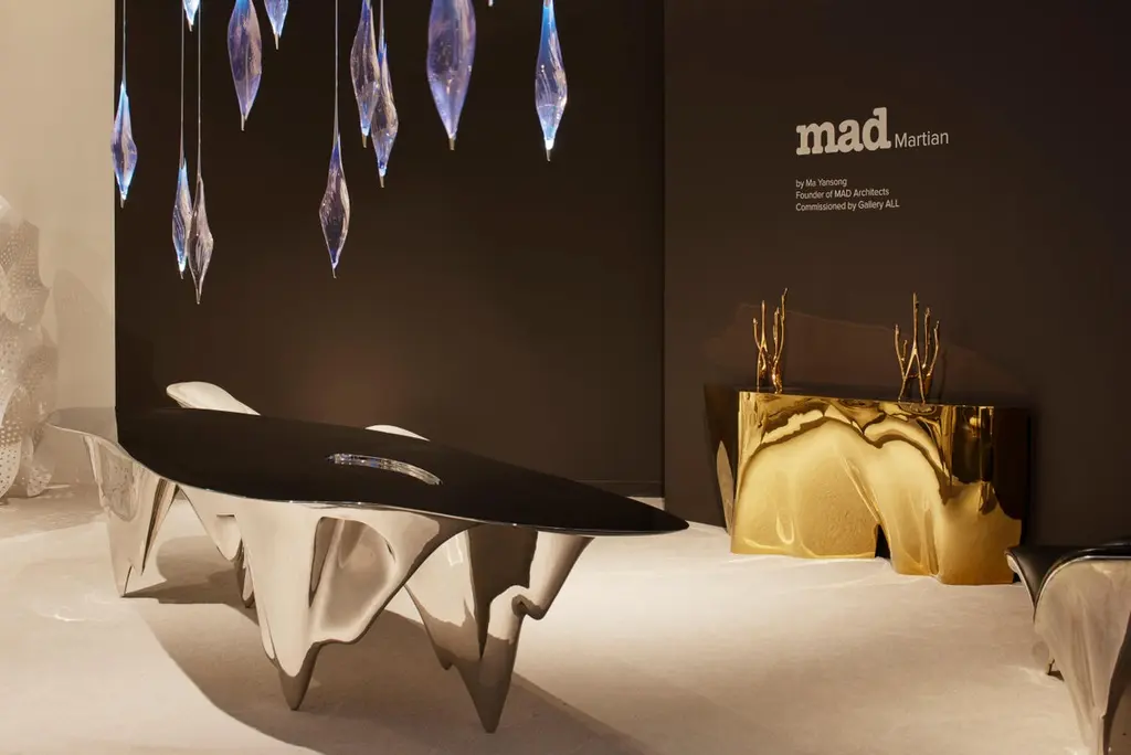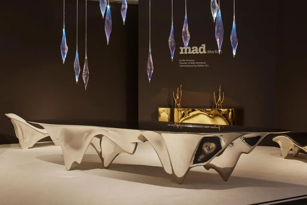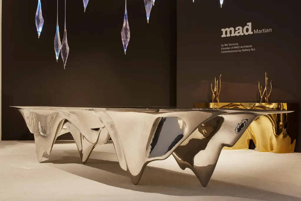 An inverted mountain range the dining table places the peaks of the Martian landscape at the centre of the communal domestic experience of the small colony. This epically large piece is made from CNC’d aluminum, a sophisticated manufacturing process that melds the exceptional digital modelling capabilities of MAD Architects with contemporary robotic fabrication techniques.The MAD Martian collection began with a question: What would the Chinese colonization of a Martian planet look like? This naturally led to more questions such as at what point does survival stop and architecture begin? Once survival is assured, what memory of Earth or love for their new home would these interplanetary colonizers recreate first? The MAD Martian collection is the result of Ma Yansong’s meditation on these issues.Ma is famed for his design philosophy of ‘Shanshui City’, which integrates elements of traditional Chinese landscape design and painting into large-scale urban architecture. The resulting forms are closely tied to elements of the natural environment, conveying both elegant and gnarly lines. With this collection, M continues to employ the Shanshui City design philosophy, putting the contours of the natural environment front and center of the design language, but transplanting it into a science fiction narrative."I have never been to the Mar what will we discover when we get there; red landscape, quiet horizon, frozen glaciers? Probably all is as beautiful, in its own way, as the Earth was thousands of years ago. I want to bring to Mars the Earth landscape, as I imagined it, in my room as a child.” Ma Yansong, founder of MAD Architects Ma conceived of the collection as being Noah Beyond The Ark. Timber, used to build the ark, saved the great Old Testament patriarch from the deluge. In MAD Martian, Ma reasoned that in the future, highly advanced materials will catapult those few lucky chosen ones into safe extra-terrestrial environments, beyond the apocalypse. To convey this IDEA, the first seven pieces in the collection were made using a combination of old and new techniques: advanced machining with hand-finishing and cutting-edge form making finished with artisanal detailing.The MAD Martian collection employs the design language of science fiction, established during the mid 20th Century. Traces of the 1960s Space Race aesthetic are visible in the suspension lights, whereas the candelabras and the fish tank take their cue in part from later masterworks such as Alienand Blade Runner."Sometimes I think Ma Yansong can talk to aliens. His architectural works are breathtakingly avant-garde in some way that makes the audience feel they stepped into another world. I challenged him to design a living space for Martians; he wants to make Martians feel on earth.” Wang Yu, co-founder of Gallery AllThis collection constitutes an ongoing series of in-house commissions by Los Angeles and Beijing-based Gallery All, whose focus is increasingly turning towards emerging and established Chinese designers. Gallery All works with creative director Lou Weis to develop narratives for many of these internally conceived and produced collections.The Creative and Production ProcessThis collection is the result of a two-year research and design development process. It started with a conversation between Yu Wang, co-founder and Director of Gallery ALL, and Ma about the theme of MAD Martian, and what a furniture collection of Chinese interplanetary pioneers would look like. On agreeing to produce the collection, the focus quickly turned to researching the history and current material language of science fiction movies, with specific reference to colonization of other planets and the ‘Space Odyssey,’ generally.Numerous discussions were had between the creative team at Gallery all, MAD architects, and consulting Creative Director Lou Weis about what this imagined small Community for Martian colonizers would desire for their new interior architectural world. As the astronauts started to understand the environment—the changes in the seasons, the different rise and fall of the sun, the emergence of distinct flora and fauna—Ma designed the decorative language of their interior spaces as a hybrid condition; nostalgia for Earth and a reflection of the Martian environment.As typologies emerged, it was decided that the collection would be made from a fluid, highly reflective metallic skin. This is representative of a desired future manufacturing context, delivering materials that not only endure extremely harsh environments, but physically adapt within them.The manufacturing process for the MAD Martian pieces has been conducted in China and Europe using advanced automated, robotic manufacturing (CNC, 3D printing, advanced mould-making) and artisanal skills, such as hand polishing across incredibly complex surfaces.Keywords: dining table, center table, table, stainless steel table