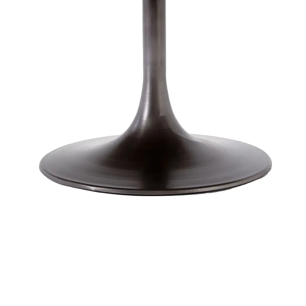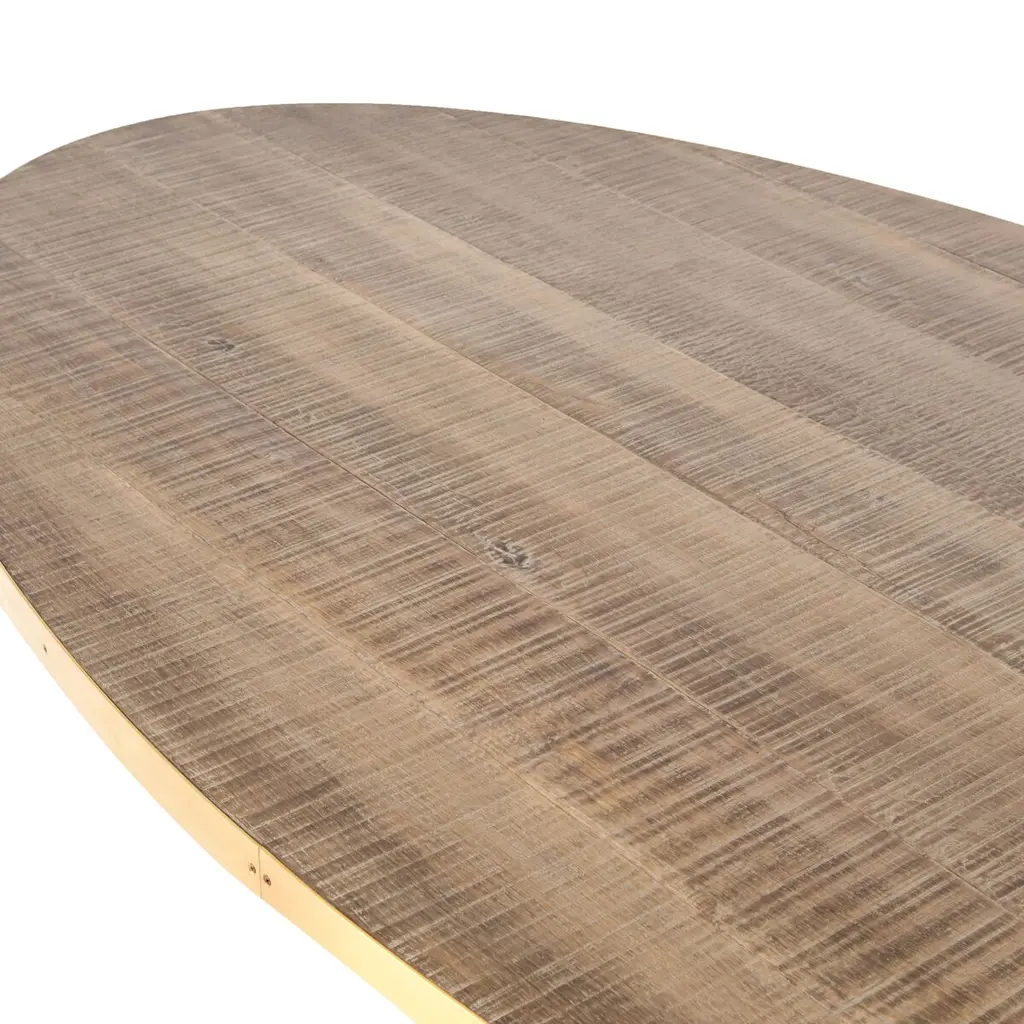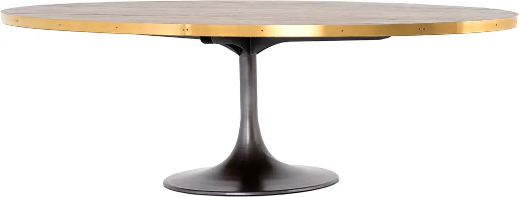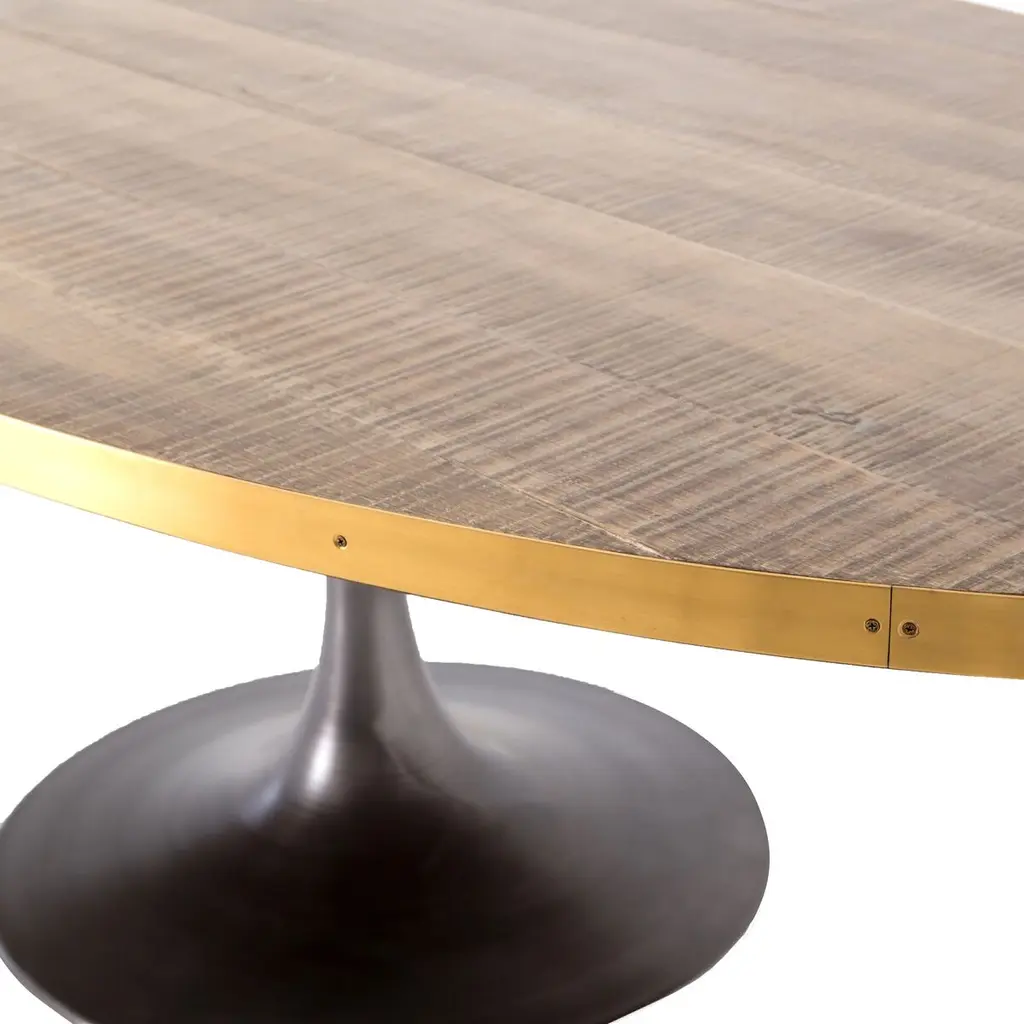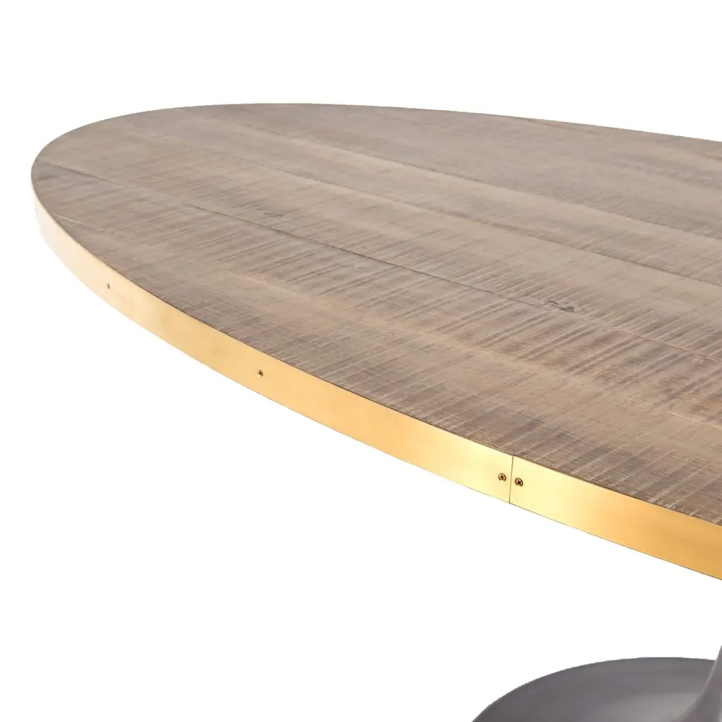 The iconic Tulip table is even more sophisticated when given an oak top banded with lustrous brass-finished steel. The wood's warm finish accentuates the wood's striking grain. Six feet wide, the table seats six people with stylish ease.