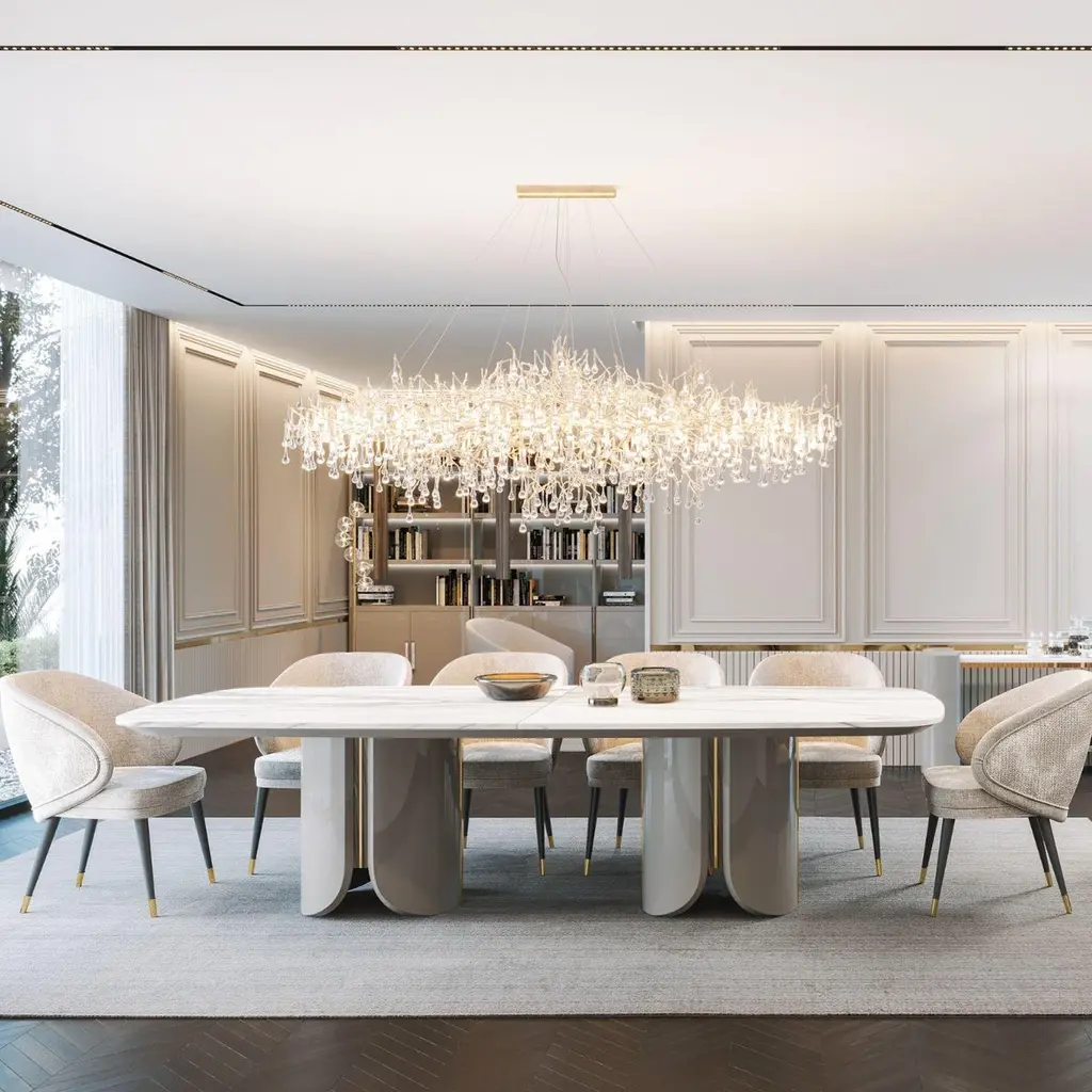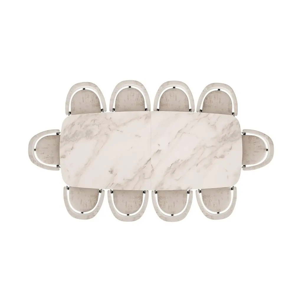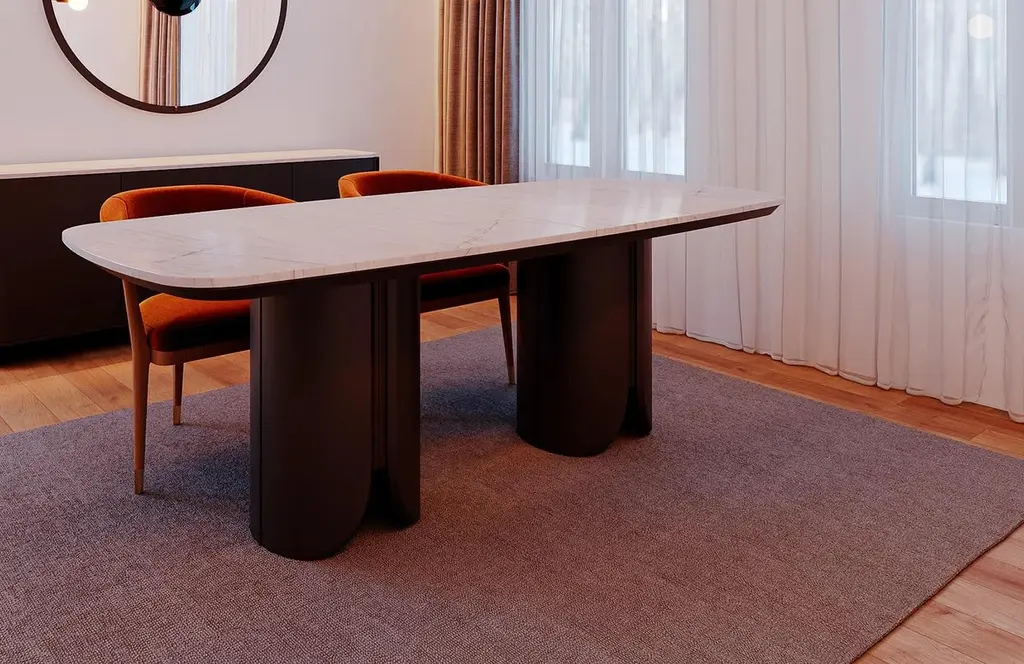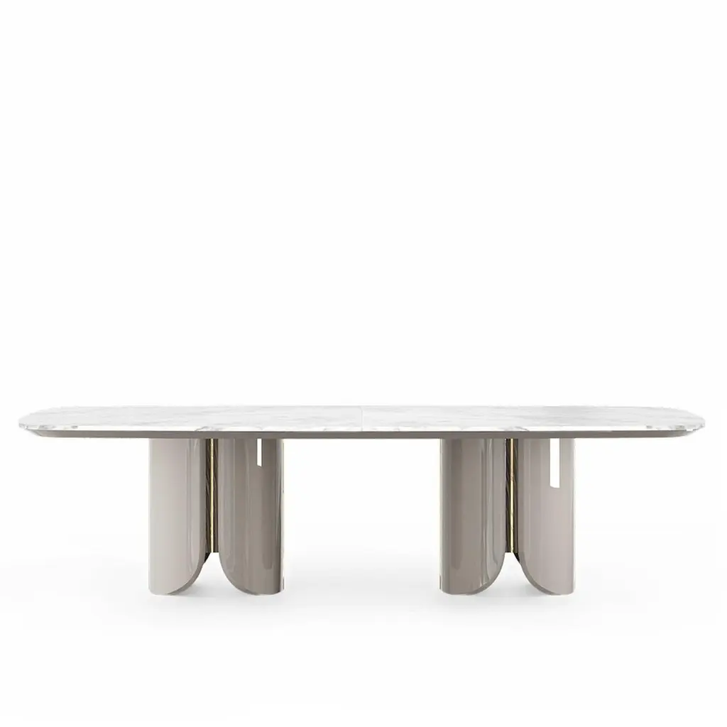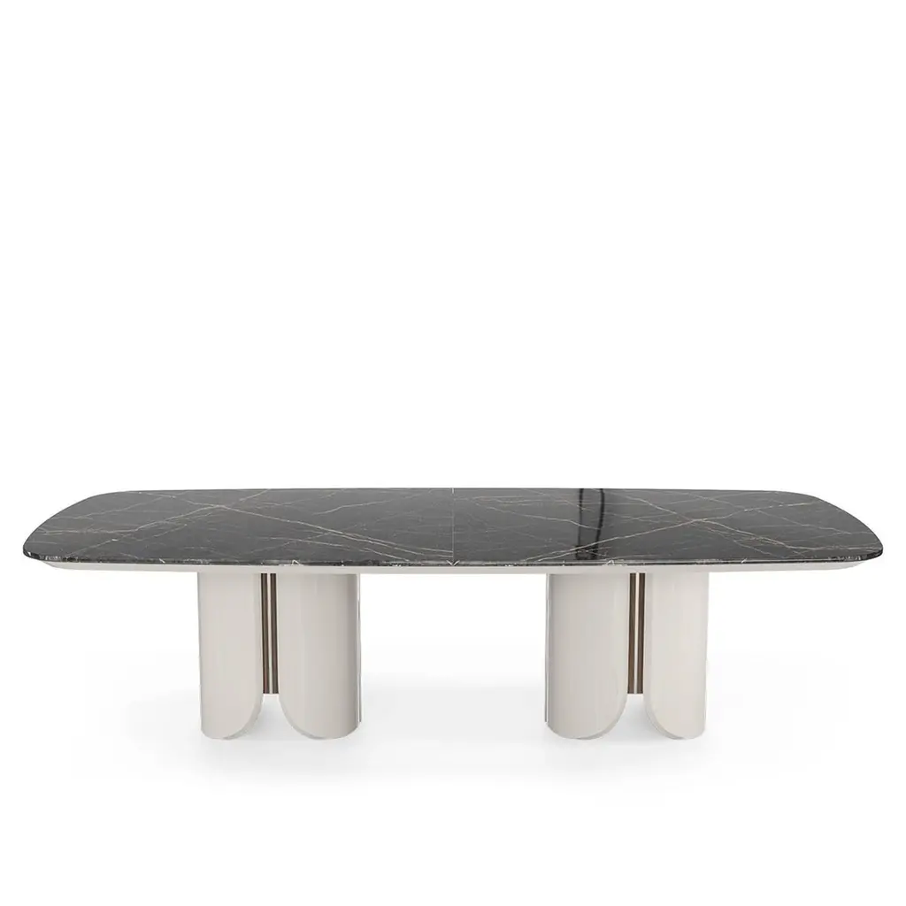 This dining table features a refined and contemporary design, blending luxurious materials with minimalist architecture. Its two sculptural legs are finished in a high-gloss lacquer, creating a sleek and modern base. The tabletop, crafted from natural stone, offers a durable and elegant surface with organic veining that adds sophistication.Enhancing its unique design, the table includes subtle wood and metal accents that introduce warmth and texture, balancing the cool tones of the lacquer and stone. Perfect for modern dining spaces, this piece serves as both a functional centerpiece and a statement of timeless design.We do our best to expedite production and to ship and deliver product within the listed lead time, however current lead times might be longer due to global shipping backlog and delays. These delays are out of our control and cannot be a reason to cancel an order.