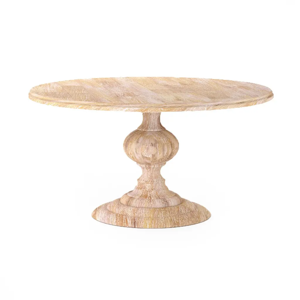 A round of classic farmhouse elegance. Stepped base, turned mango wood pedestal, and round top are wire-brushed and finished in a dark oak stain.