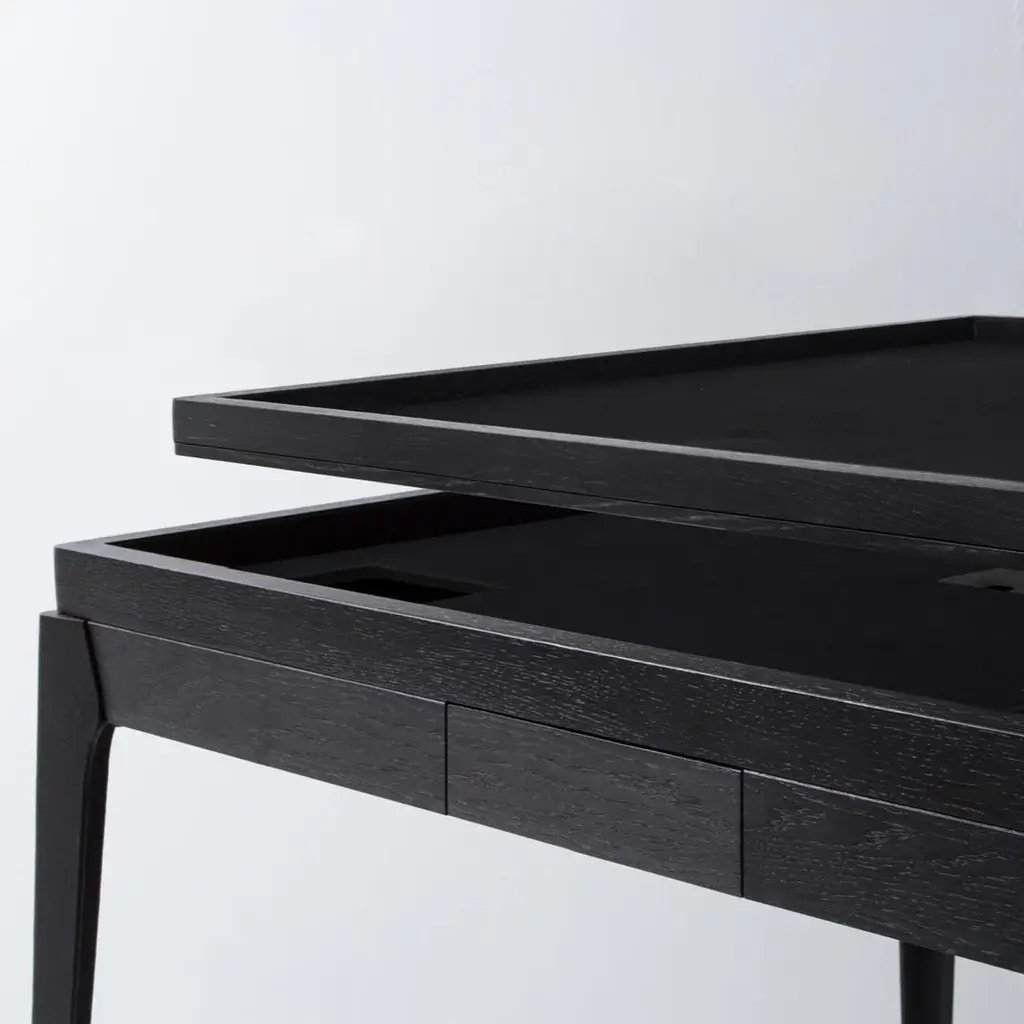 The Mahjong / Card Games Table from District Eight is a masterclass in versatility, designed for both game night and everyday living. Crafted from rich oak with sturdy cast-iron legs, it includes integrated drawers for game chips and dedicated drink placements. The clever flip-top design instantly converts the dedicated game surface into an elegant dining or work table, seamlessly blending industrial-luxe style with all-encompassing functionality for any modern space. Highlights: