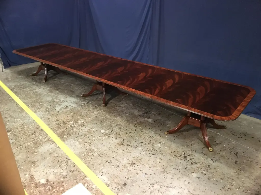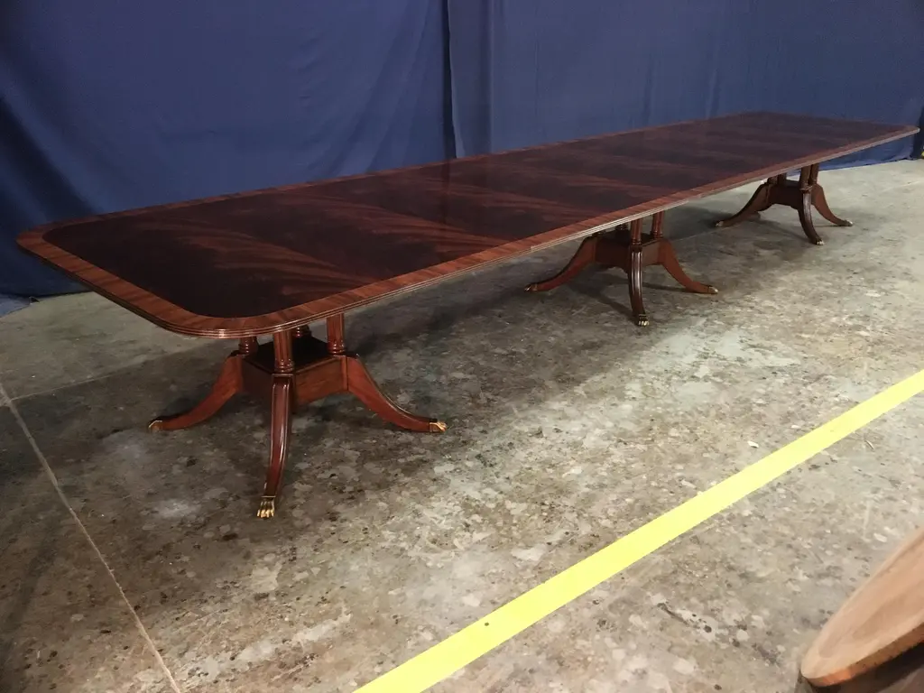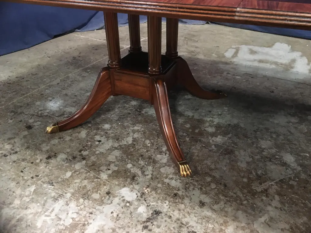 This is a made-to-order large traditional mahogany banquet/dining table made in the Leighton Hall shop. It features a field of slip-matched swirly crotch mahogany from West Africa and a Pau Ferro border. It has a hand rubbed and polished semigloss finish. The birdcage style pedestals have four columns with fluted legs which terminate with antique brass lions paw feet. Dimensions: 54 in. x 96 in. with three 48 in. Sections (total length with all three sections inserted is 240 in.).