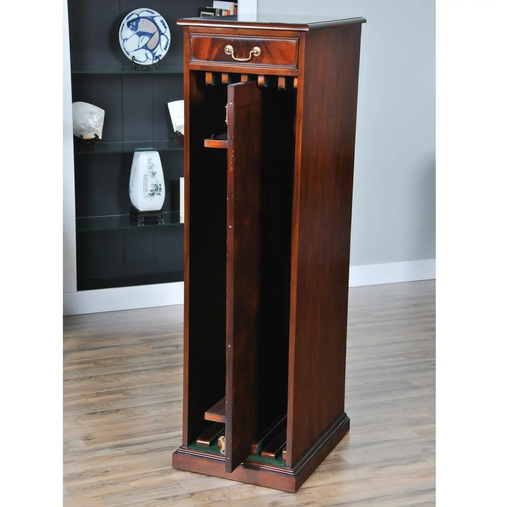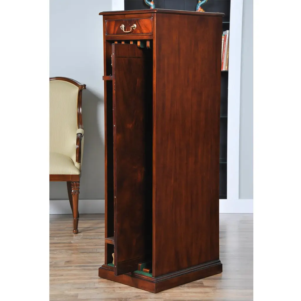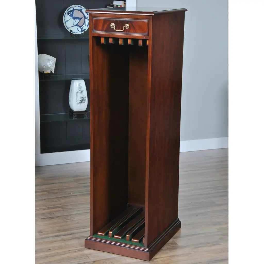 The Mahogany Dining Table Leaf Holder from our customers request file we developed a decorative place to store your table leaves when not in use. Ideal for a number of our different extension style dining tables. Capable of storing three skirted leaves this item works well with a variety of our dining tables including the following: NCMP103, NDRT025, NDRT030, NDRT035, NDRT052 and NDRT057, all of which can be viewed further on our site. The drawer on top adds some useful storage space.Measures 17″W x 22″D x 58″H