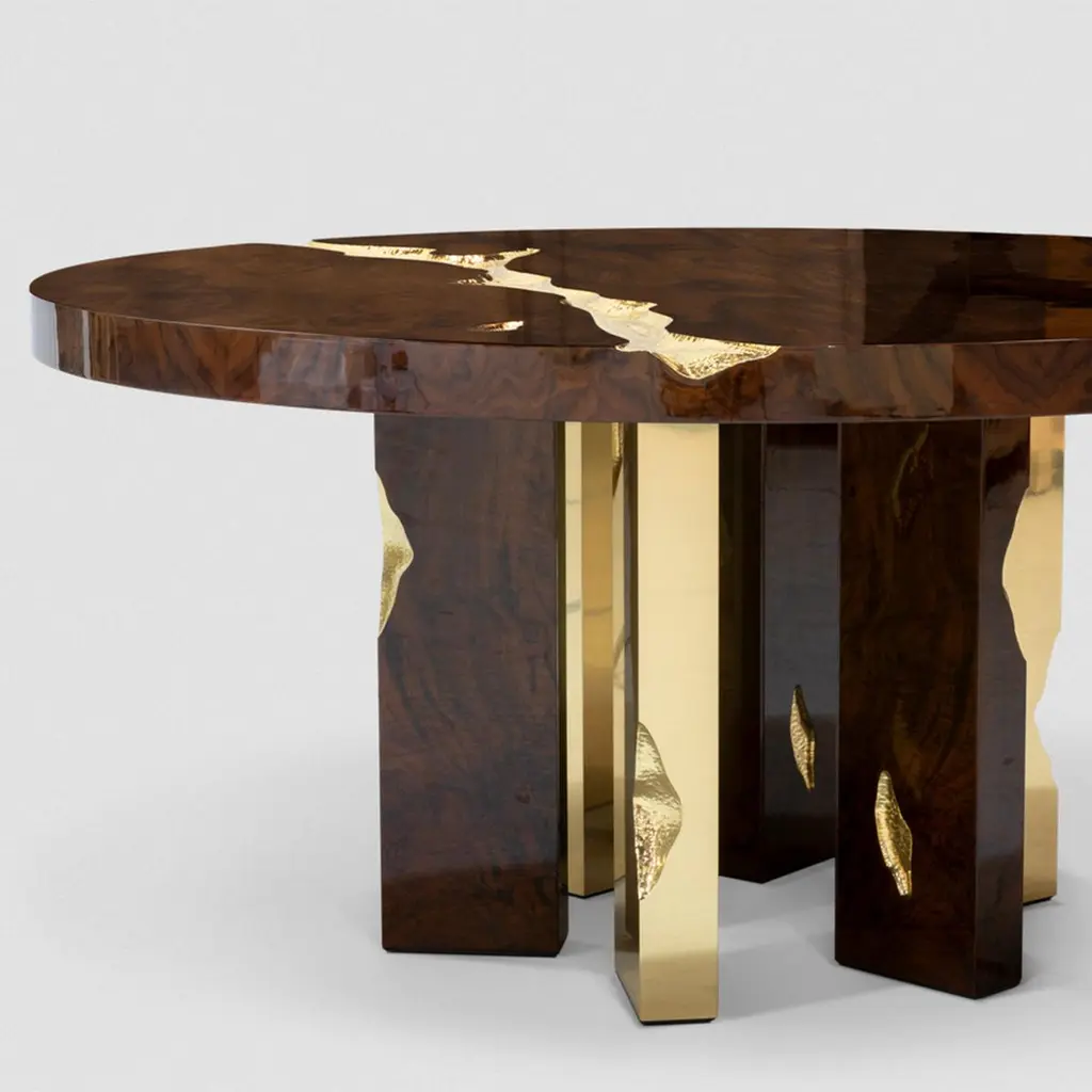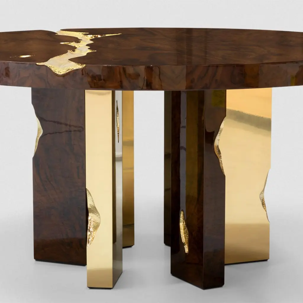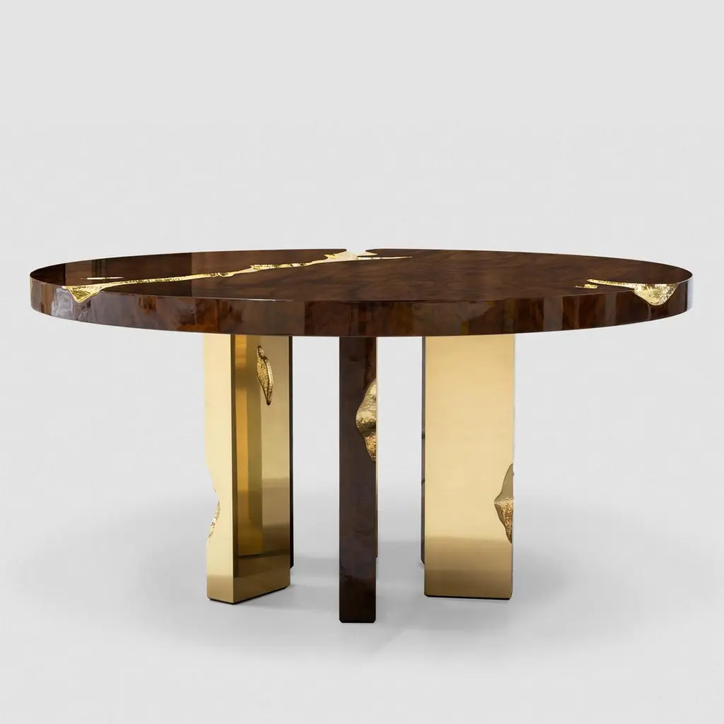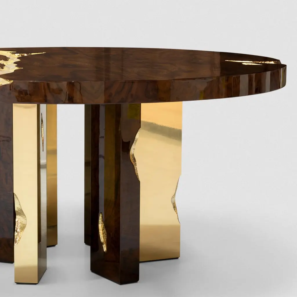 Dining table Majestic mahogany with structure in wood covered withmahogany veneer and with feet in polished solid brass and details insolid hammered polished brass.