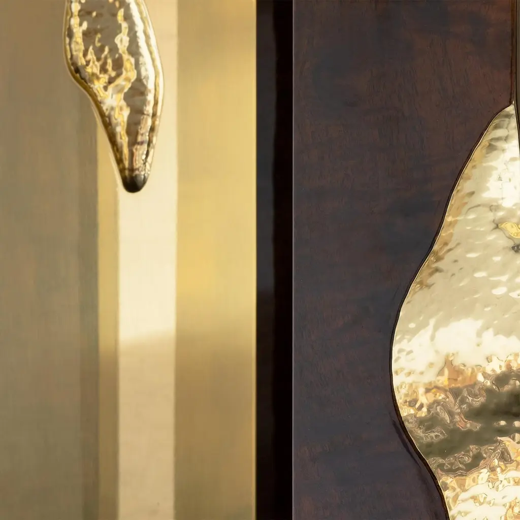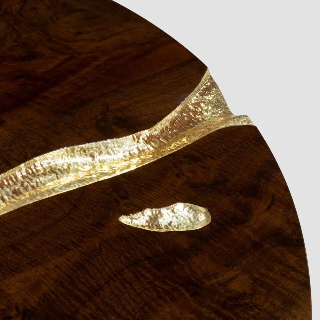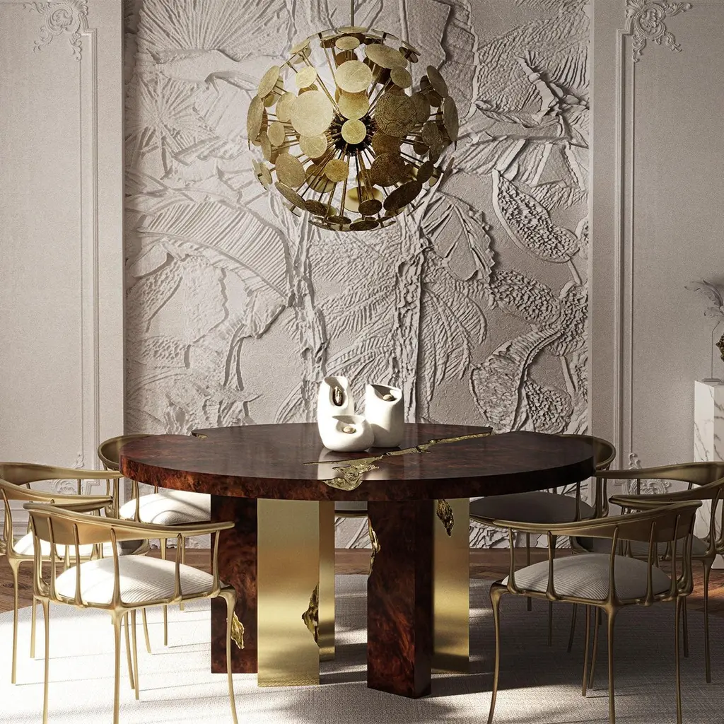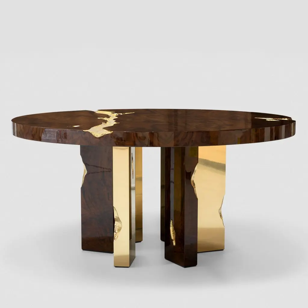 Dining table Majestic mahogany with structure in wood covered withmahogany veneer and with feet in polished solid brass and details insolid hammered polished brass.