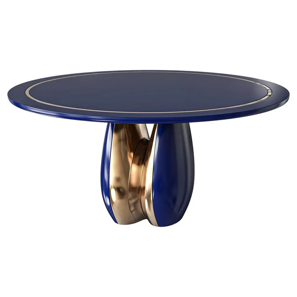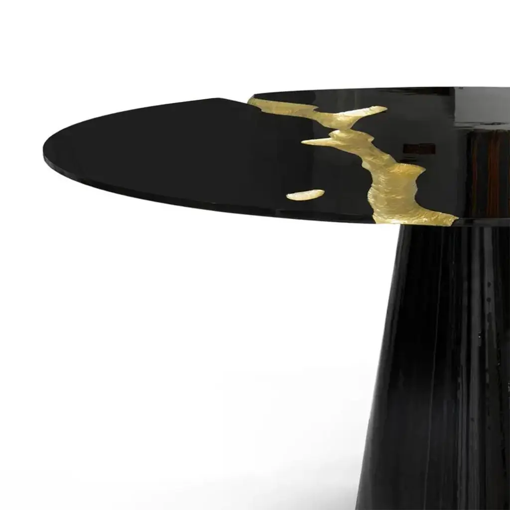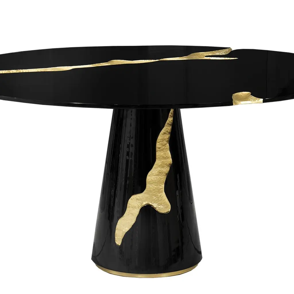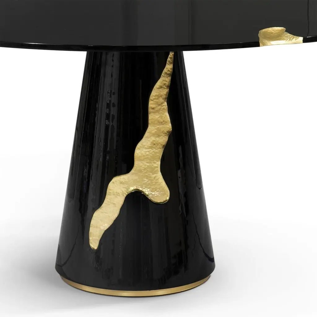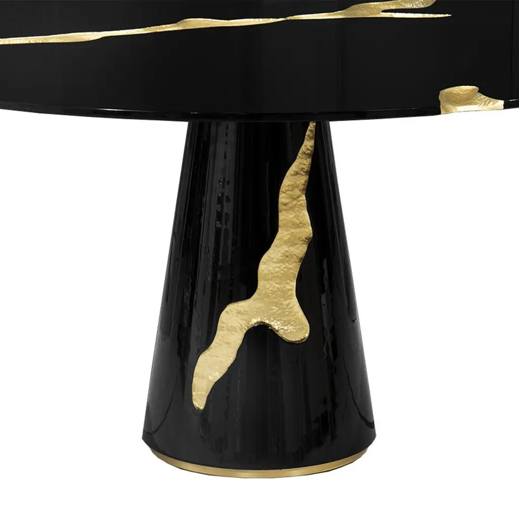 Dining table majestic round black made with mahogany woodin black lacquered finish. Top and base includes hand carved parts decorated with hand-crafted polished brass leaves.Also available in white lacquered finish.