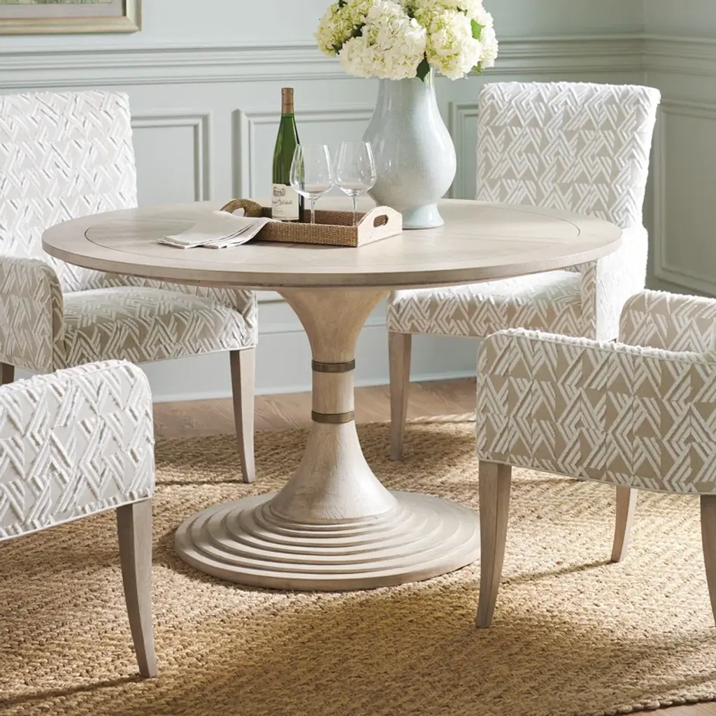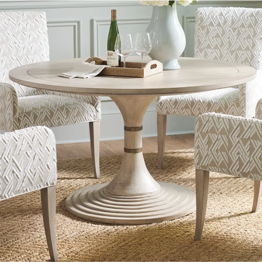 This dining table features an elegant hour-glass design, with two decorative metal collars on the pedestal and a contemporary waterfall detail on the base. The silhouette is ideal for use as a center table, or intimate dining for four.