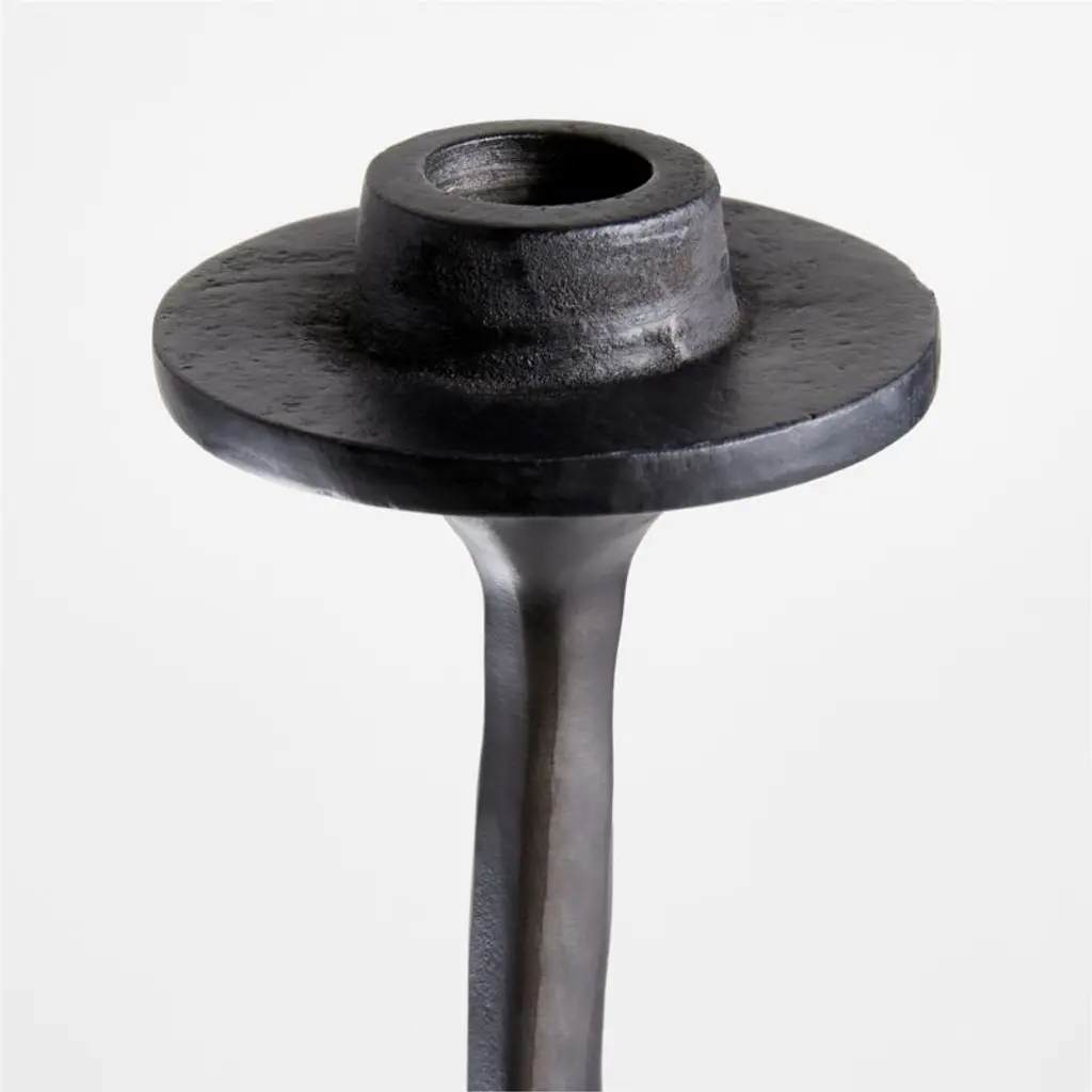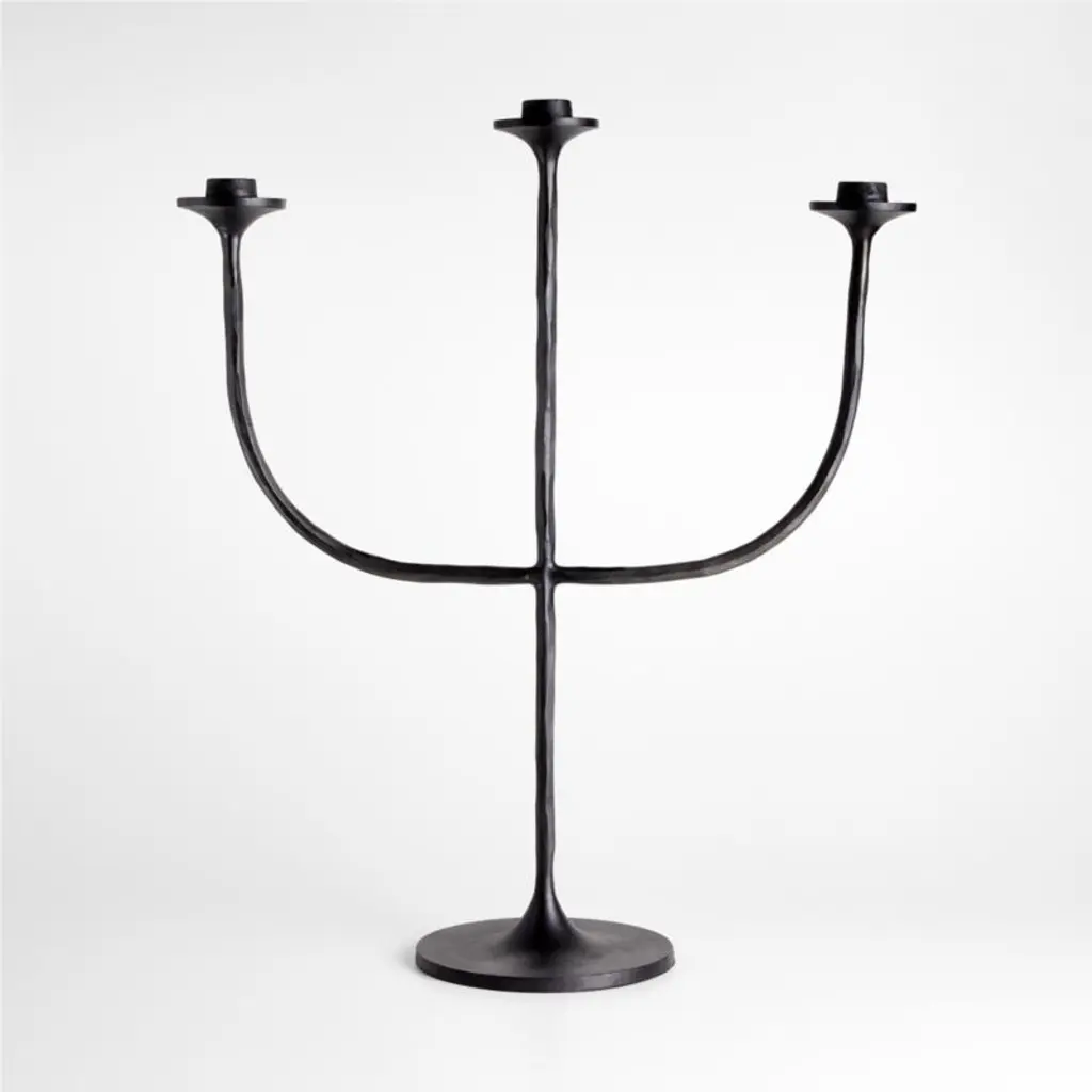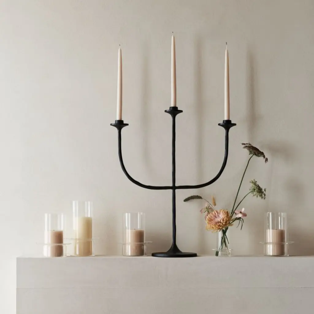 Our Maloy candelabra brings major drama to the table. Hand-hammered by skilled craftspeople, the black iron candle holder arcs a slender trident from its sturdy base to accommodate three taper candles. The look is timeless yet modern, substantial without being overpowering. We especially love a dining table set with two Maloy candelabras to create a glamorous mood.