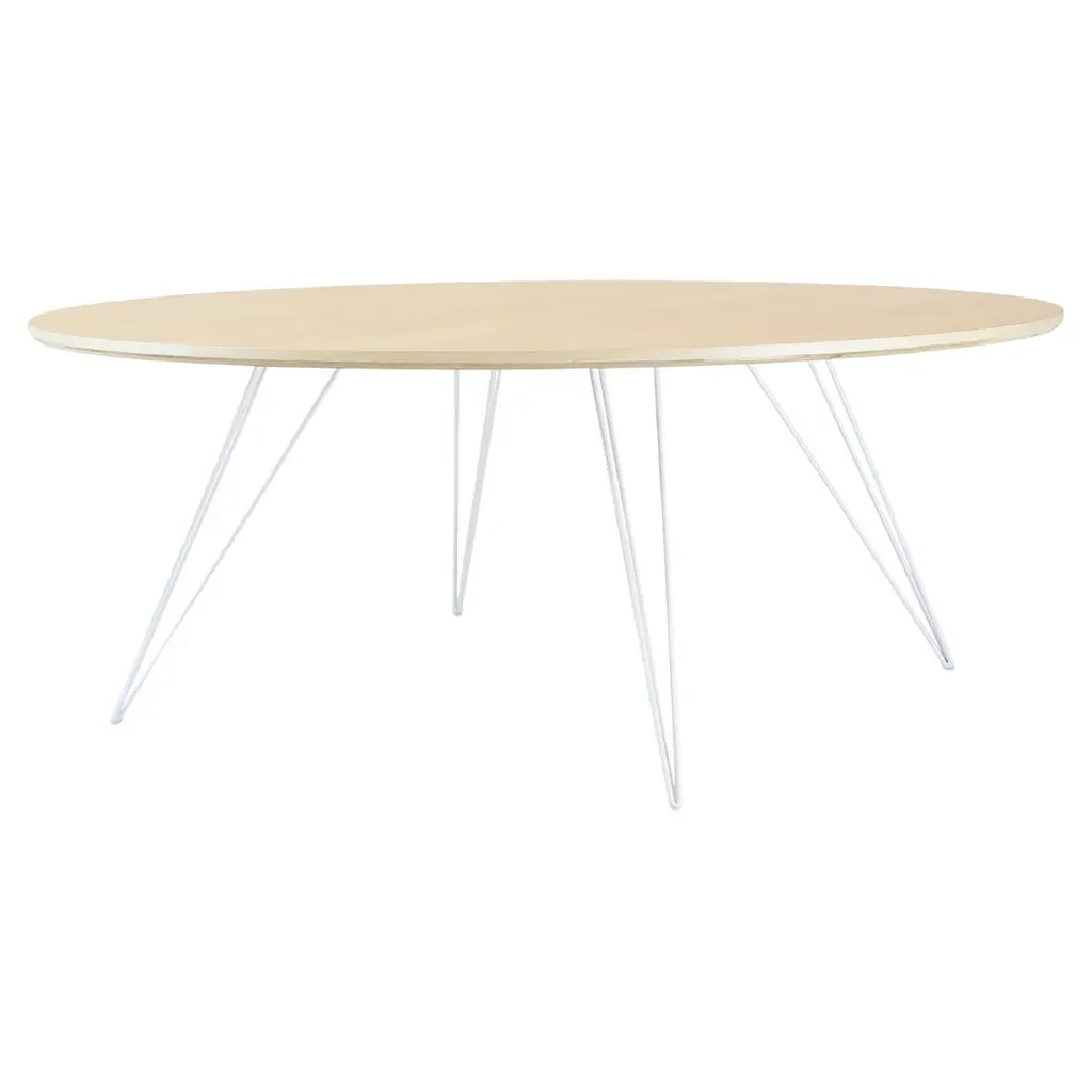 A thin, elegant and light table that can be customized to any shape, size and color desired. This handcrafted item perfectly blends industrial hairpin legs with a beveled wooden top. The irregular beauty of its natural wood combined with its simple elegant base creates a timeless, original design. This piece is offered in dinning and coffee heights as well as several shapes and sizes including large and small: rectangle, oval, square, and circle. Measures:- 40"x46".