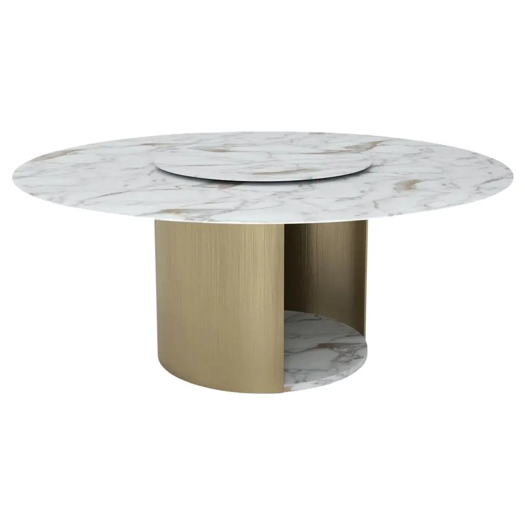 Marble Jack Round Dining Table by Dovain StudioDimensions: H 79 x Ø 120 cm.Materials: Estremoz white marble, metal.Dovain StudioCreative direction by Sergio Prieto, a Spanish artist-designer who was born in Talavera de la Reina in 1994. He dedicated himself to the world of painting professionally since he was 10 years old, and at 18 he began to study design. He has been working in different countries around the world, like China, Índia, France, Italy, Spain and Portugal, collecting experiences and knowledge that shaped his artistic vision from an early age. Now, he lives and works in Lisbon.One of his work’s priorities is the search for the expressive language of objects, creating emotions in those who see and feel his pieces. His artistic vision is printed on each piece of Dovain Studio bringing art, decoration and design, all together within the context of contemporary design culture.