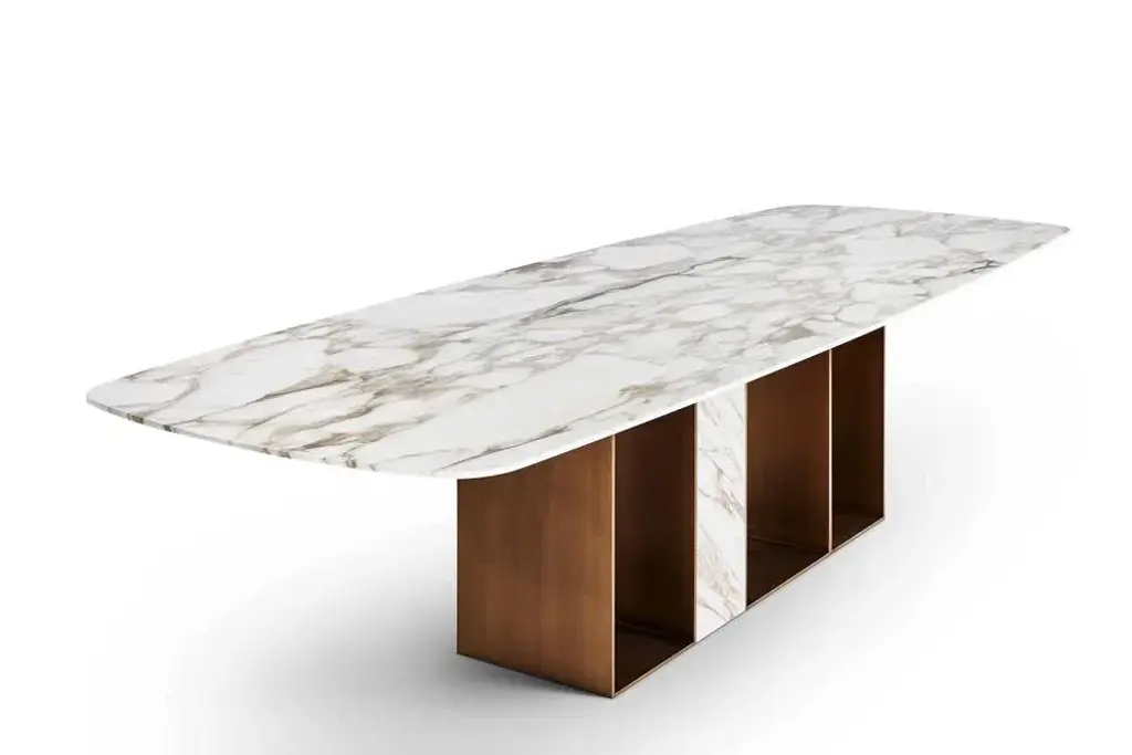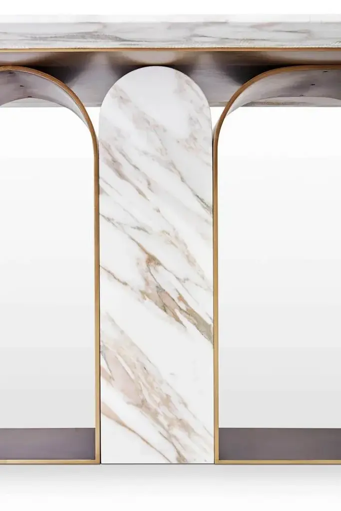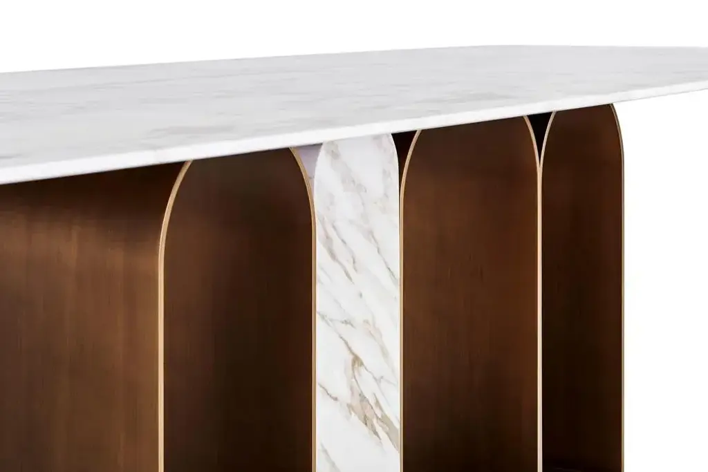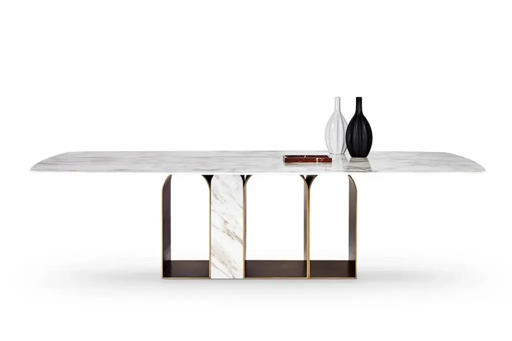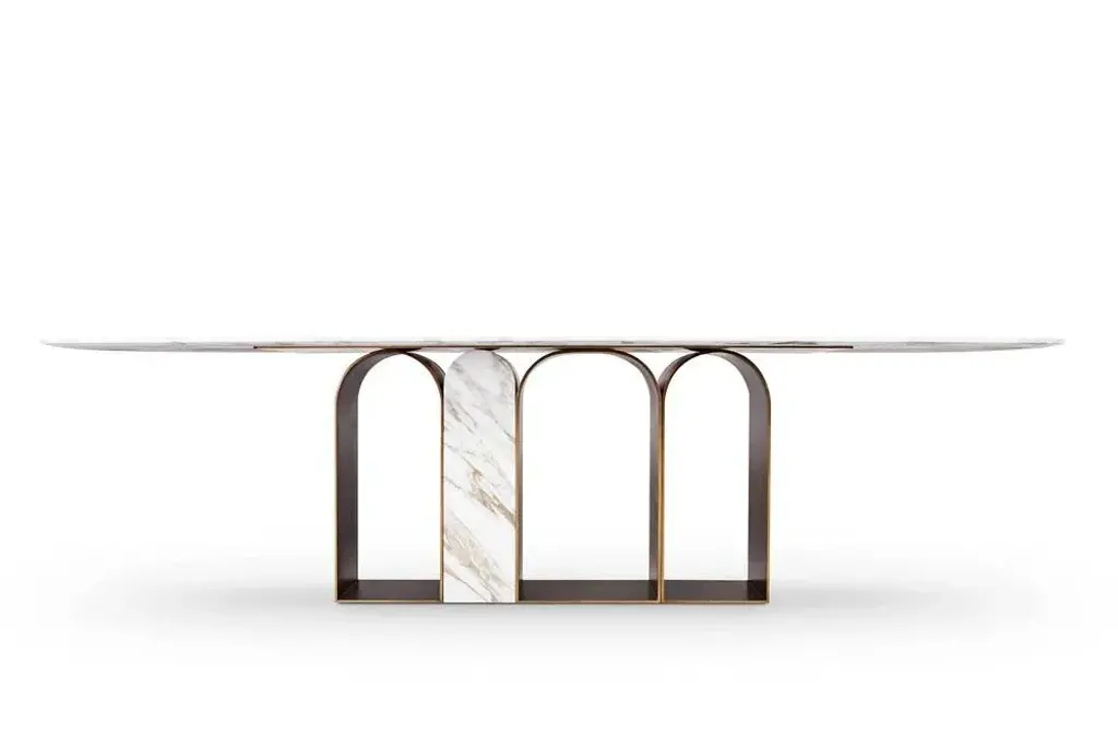Marble "planalto" dining table - giorgio bonaguro dimensions: d 110 x w 240 x h 74 cm materials: calacatta oro marble, satin brass available in other marbles and metal finishes. Collection of tables characterized by a sculptural base whose sinuous shapes recall the typical arches of brazilian modernist architecture, from the buildings built on the plateau of brasilia (the planalto central), to the outskirts of milan. The bases are made up of modular elements, which allow you to create tables of different lengths. They are made with top and solid base in marble in different finishes, and brushed metal structure. This piece is attributed to the mentioned designer/maker. It has no attribution mark and no official proof of authenticity, however it is well documented in design history. I take full responsibility for any authenticity issues arising from misattribution