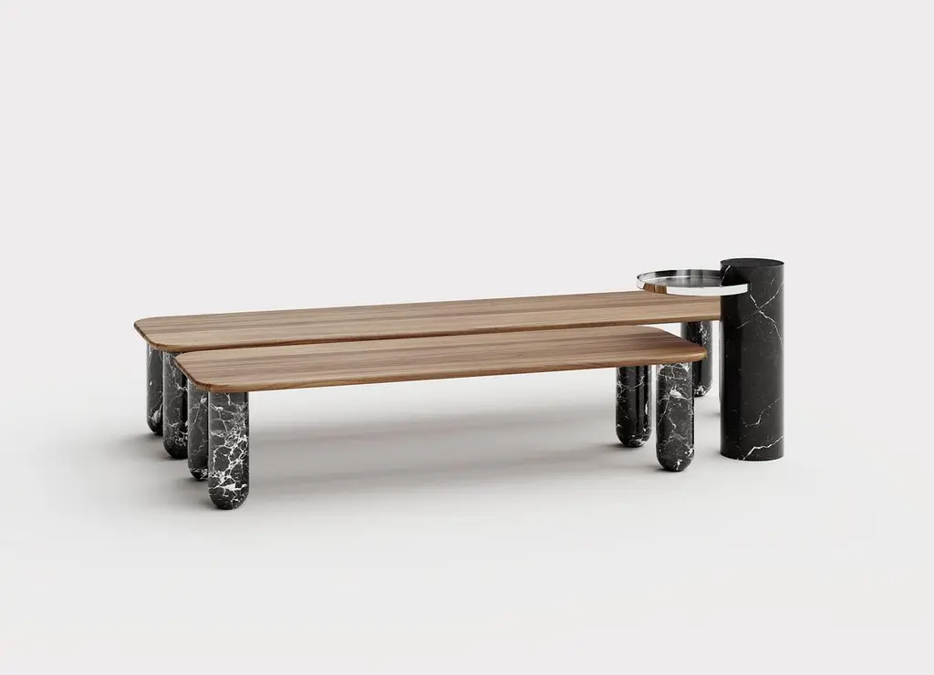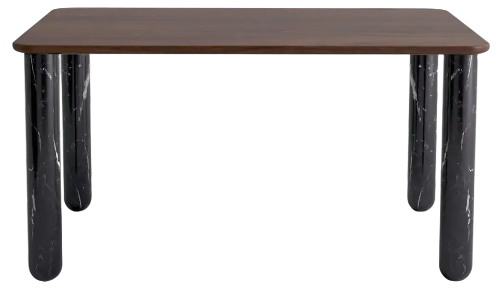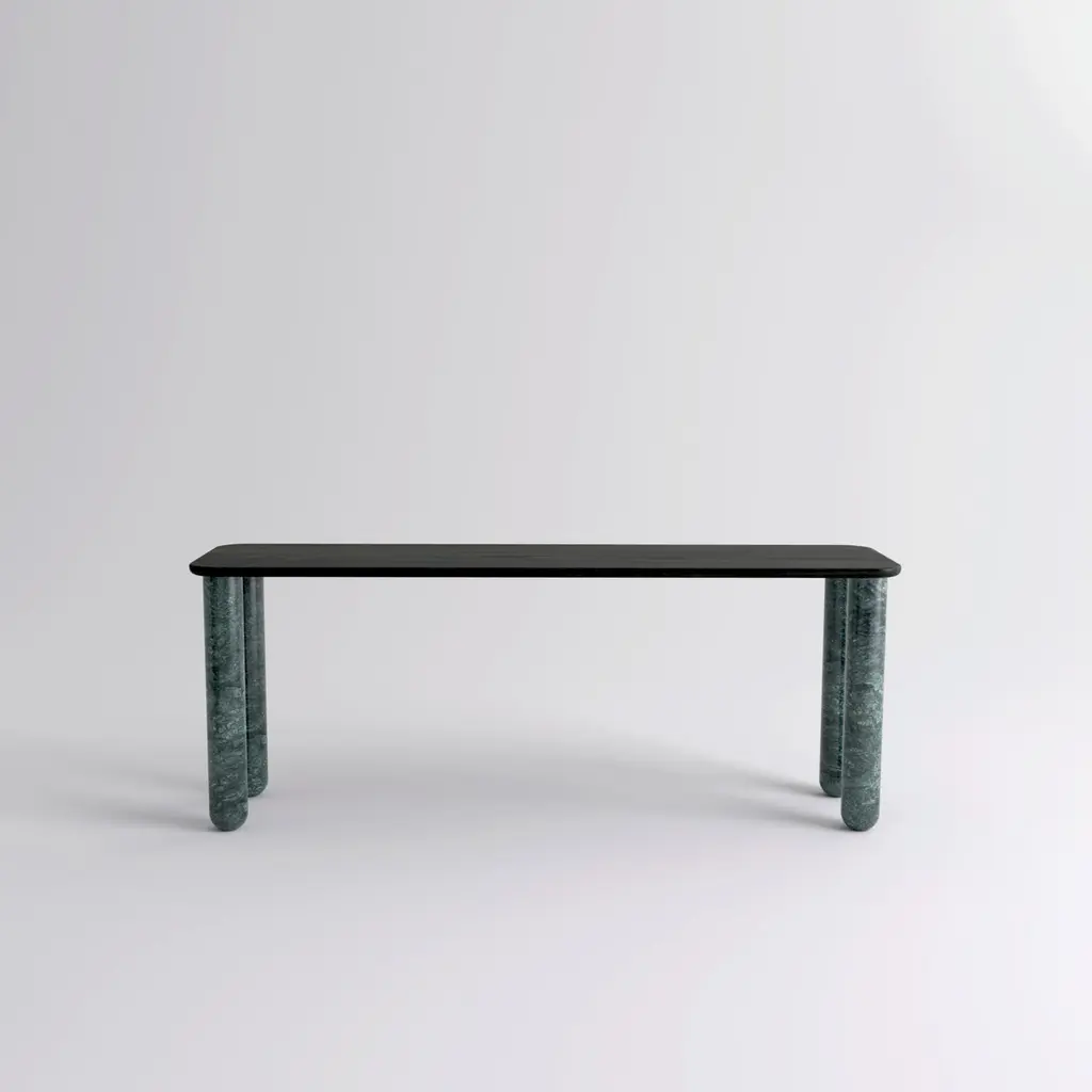 Marble "Sunday" dining table - Jean-Baptiste SouletieDimensions: 200 W x 50 D x 74.5 H cmMaterials: marble, walnut Different finishes and sizes are availableSunday is a family of dinner tables, coffee tables and consoles with a simple and sculptural design. The mix of heavy marble legs and a thin solid wood top creates an interesting contrast while the rounded edges and generous proportions provide a comforting feeling.Sunday is all about the materials: 3 marbles and 2 woods are available in the collection.Sunday comes in a wide variety of dimensions and 2 different marble legs heights to perfectly fit your interior whether you need a small coffee table, a large one, a console, or even a dinner table that will seat 10 guests on a friendly Sunday lunch.Jean-Baptiste Souletie is the Co-founder of the furniture editor La Chance with Louise Breguet. He studied in India, worked for a merchant bank in London (where he designed their new offices), before working for an investment fund (where he redevised the graphic chart), and in the strategic department of a luxury goods company in Paris. He returned to his first loves, architecture and furniture, when he founded La Chance in 2012.