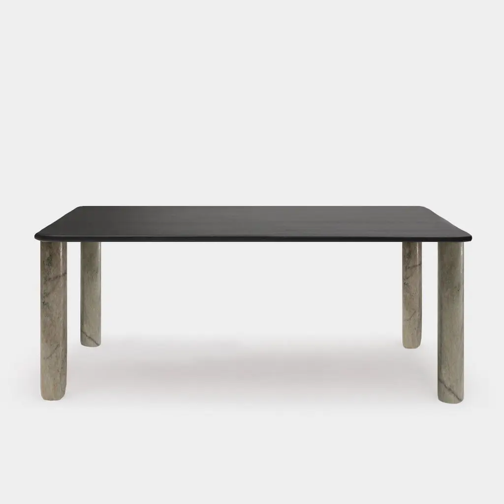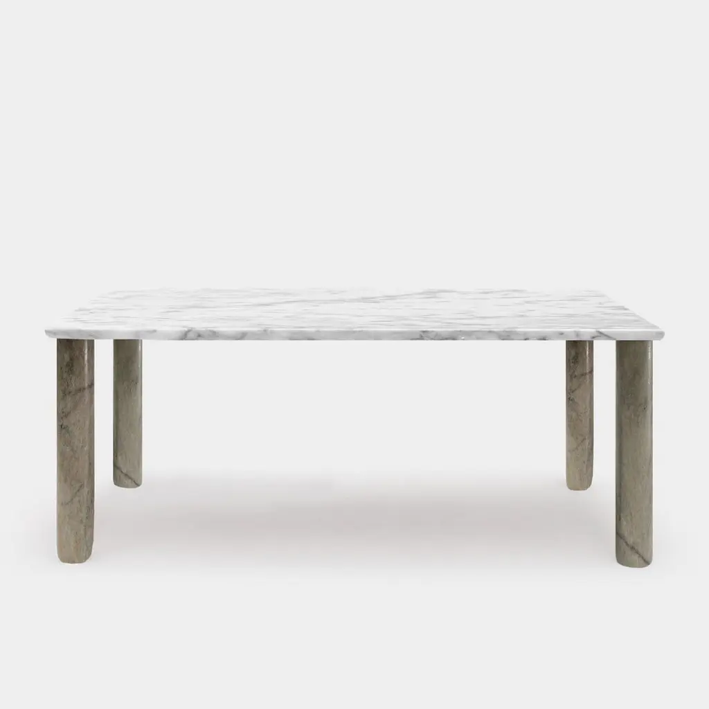 Marble "Sunday" dining table, Jean-Baptiste Souletie.Dimensions: 200 W x 100 D x 74.5 H cm.Materials: marbleDifferent finishes and sizes are availableSunday is a family of dinner tables, coffee tables and consoles with a simple and sculptural design. The mix of heavy marble legs and a thin solid wood top creates an interesting contrast while the rounded edges and generous proportions provide a comforting feeling.Sunday is all about the materials: 3 marbles and 2 woods are available in the collection.Sunday comes in a wide variety of dimensions and 2 different marble legs heights to perfectly fit your interior whether you need a small coffee table, a large one, a console, or even a dinner table that will seat 10 guests on a friendly Sunday lunch.Jean-Baptiste Souletie is the Co-founder of the furniture editor La Chance with Louise Breguet. He studied in India, worked for a merchant bank in London (where he designed their new offices), before working for an investment fund (where he redevised the graphic chart), and in the strategic department of a luxury goods company in Paris. He returned to his first loves, architecture and furniture, when he founded La Chance in 2012.