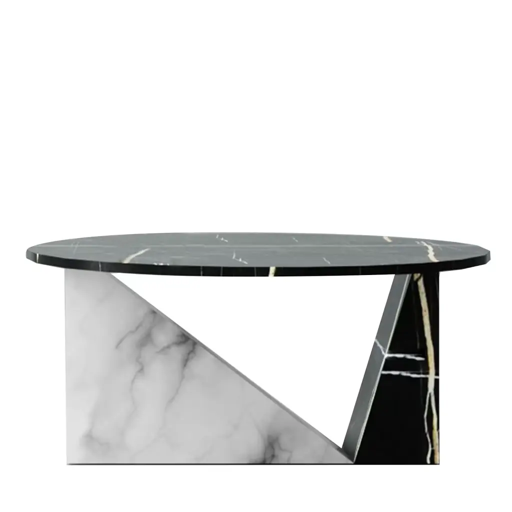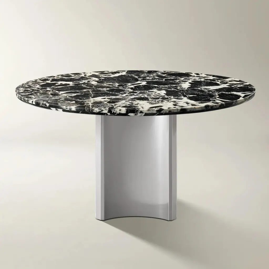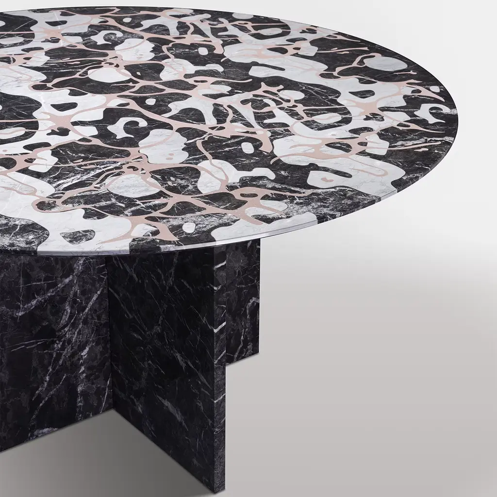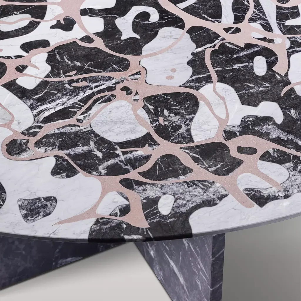 Round dining table in Carnico grey and white Carrara marble with marble marbling graphics in earth-colored cement designed by Zanellato/Bortotto. Table legs in Carnico grey in a cross structure.