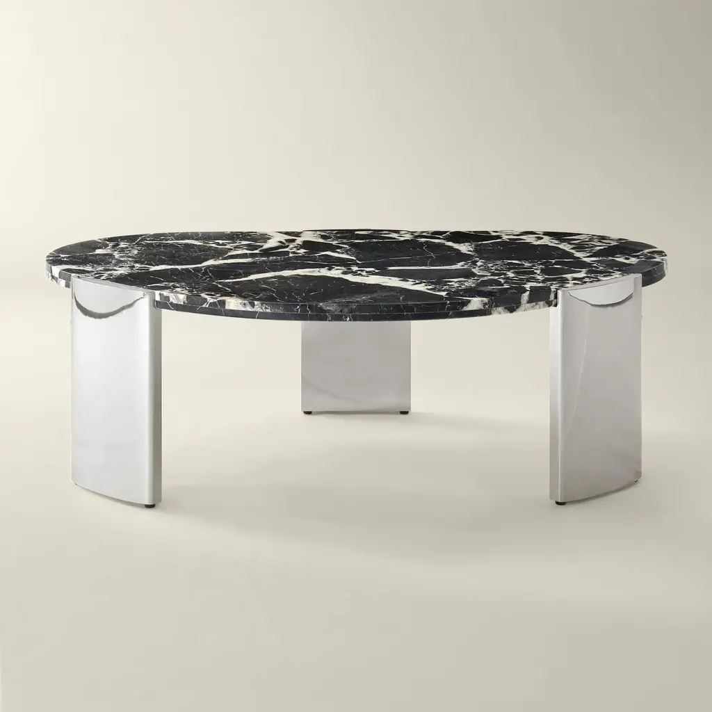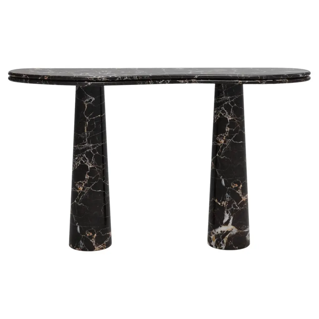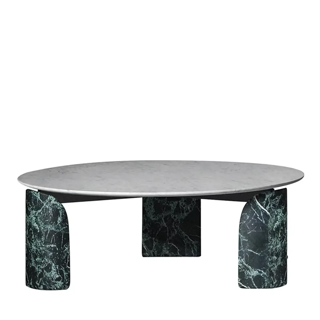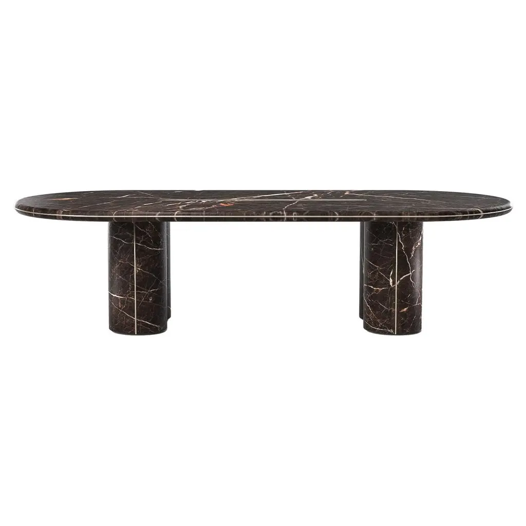 Round dining table in Carnico grey and white Carrara marble with marble marbling graphics in earth-colored cement designed by Zanellato/Bortotto. Table legs in Carnico grey in a cross structure.