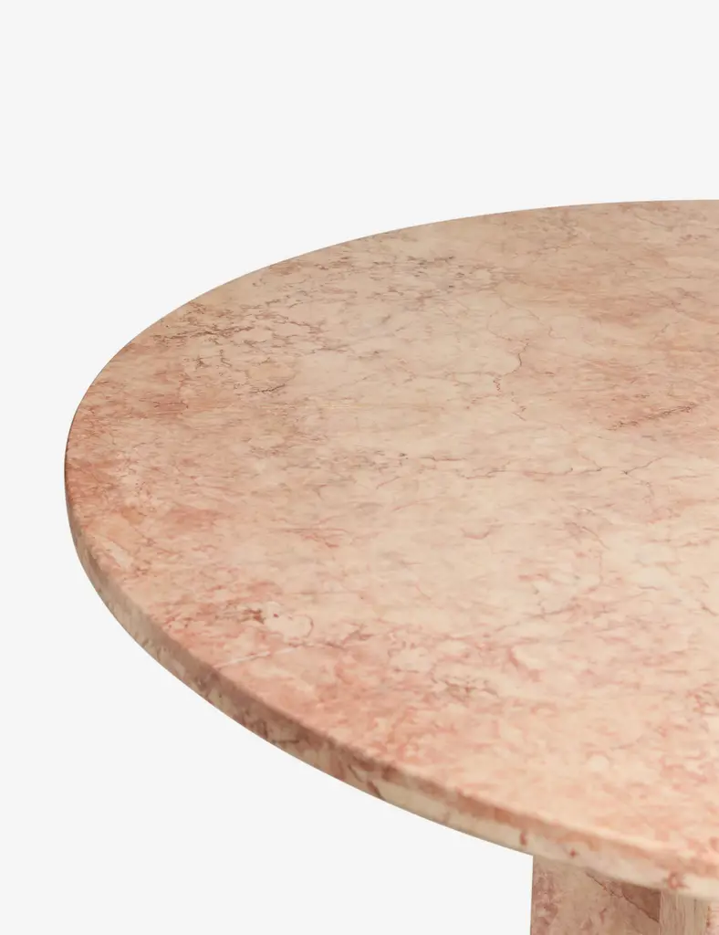 A bold profile cut from marble makes this table an instant focal point. An angular pedestal base supports the round top, shaping a silhouette that feels both grounded and refined. The result is a dining table that imbues sophistication through its striking form and rich mineral tones.