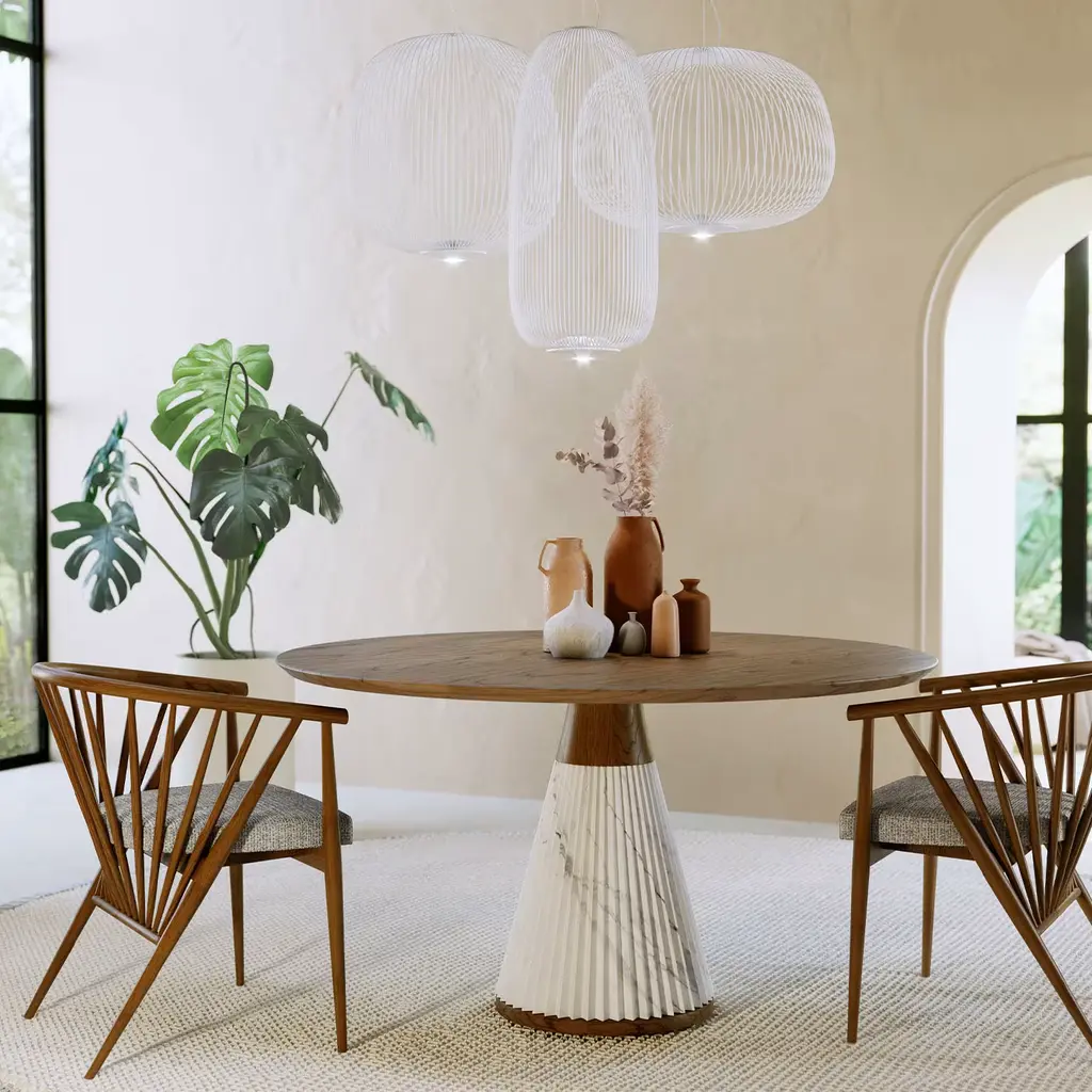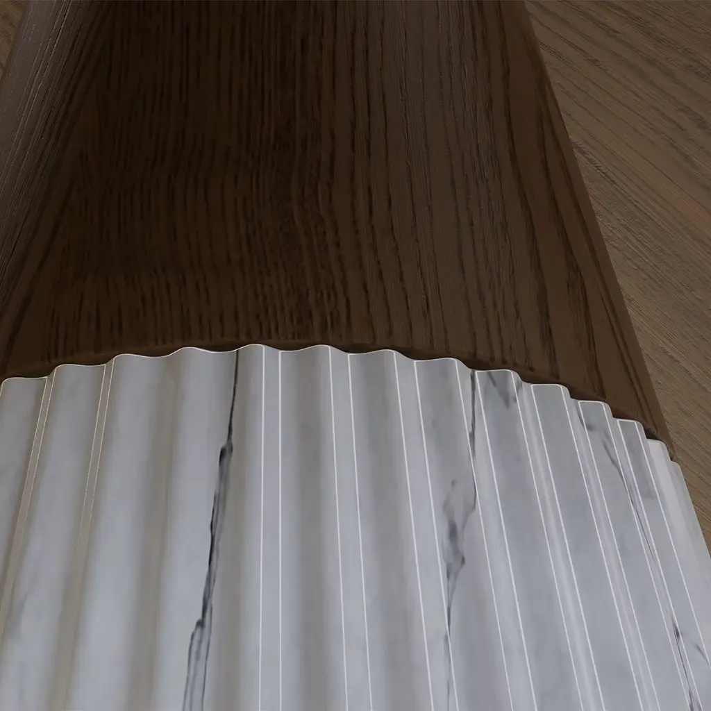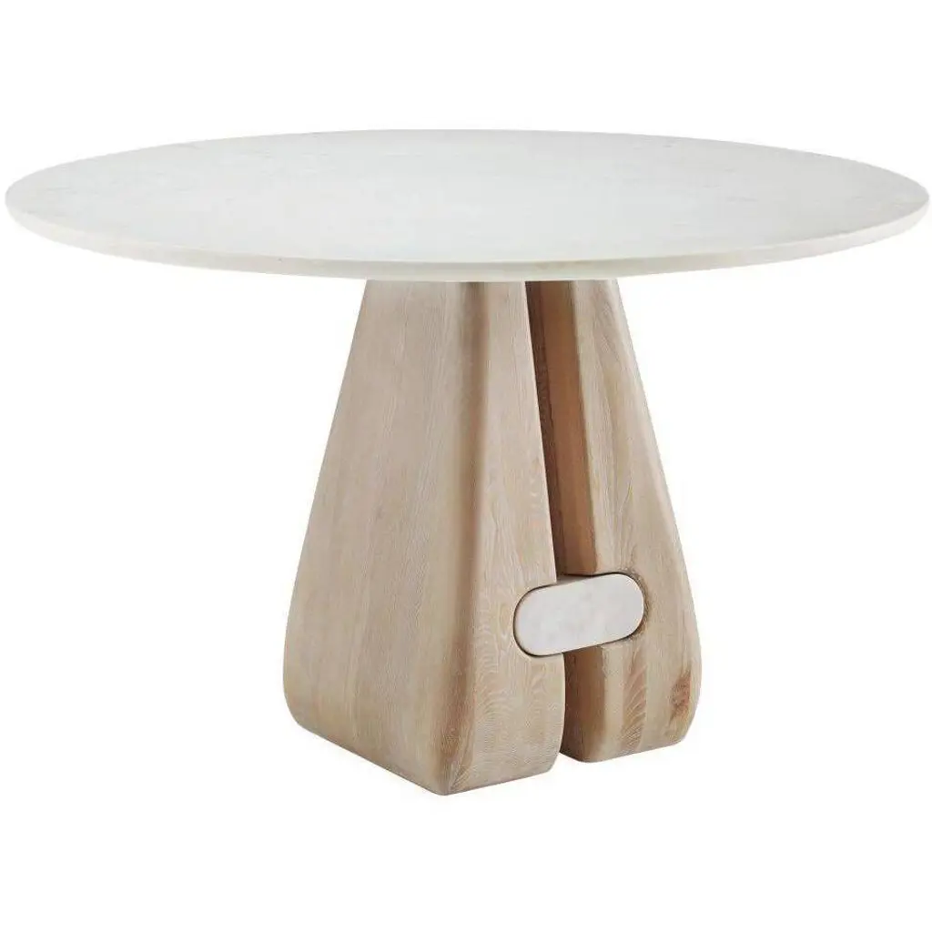 An iconic design of contemporary sophistication, this gorgeous round table by Libero Rutilo will add a refined and elegant accent to a modern living or dining area. Handmade of ash wood, the round top rests on a conical base made of pleated white marble. Please consult the Concierge for further details.