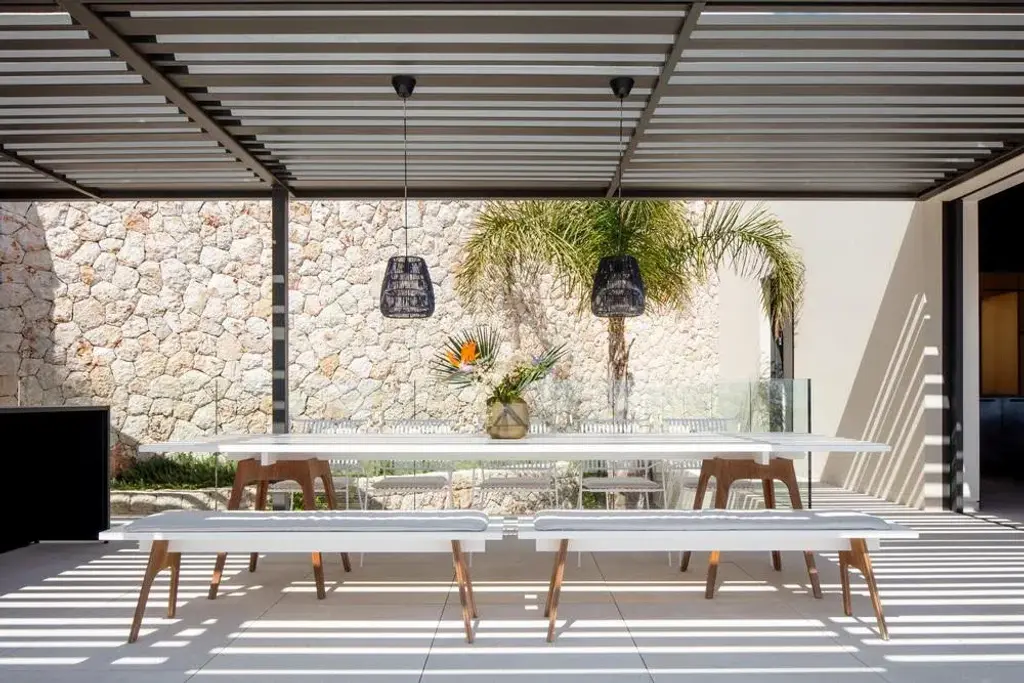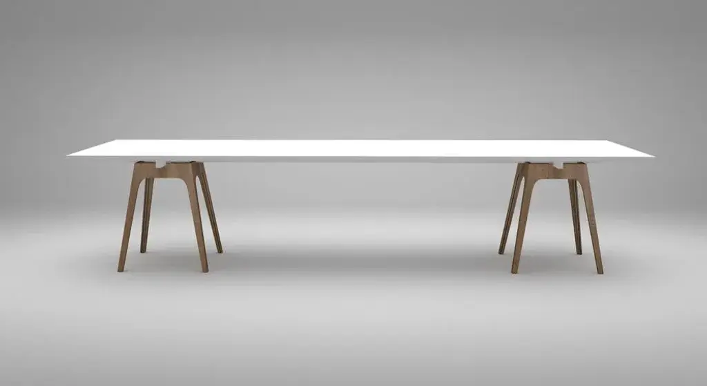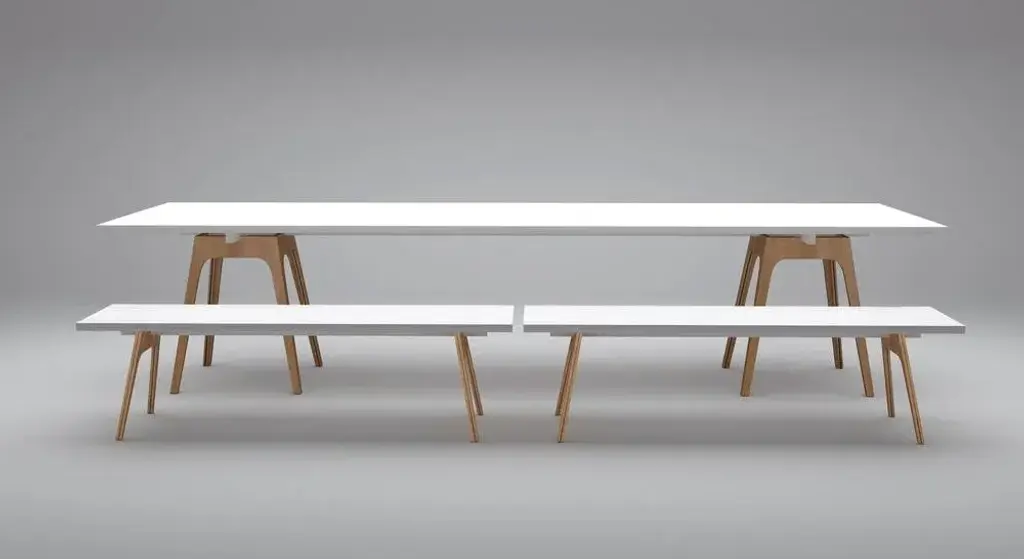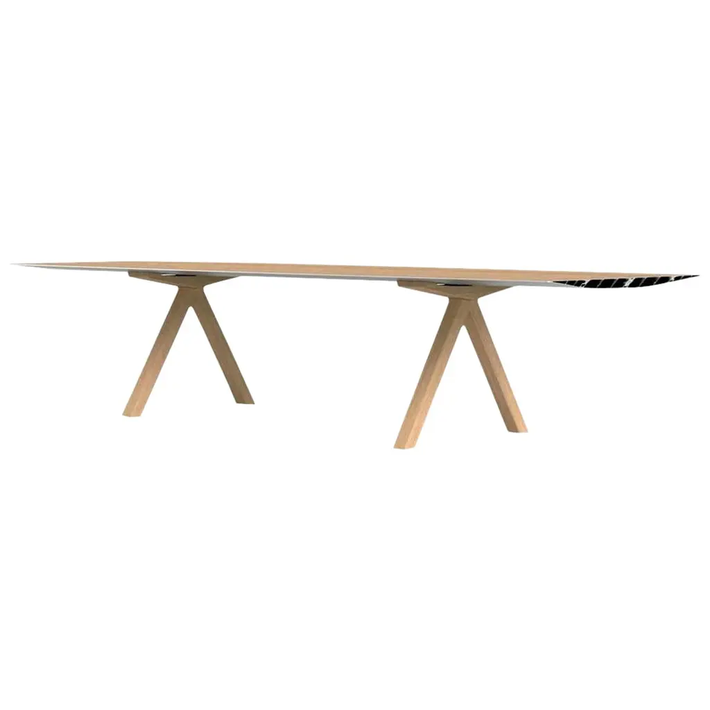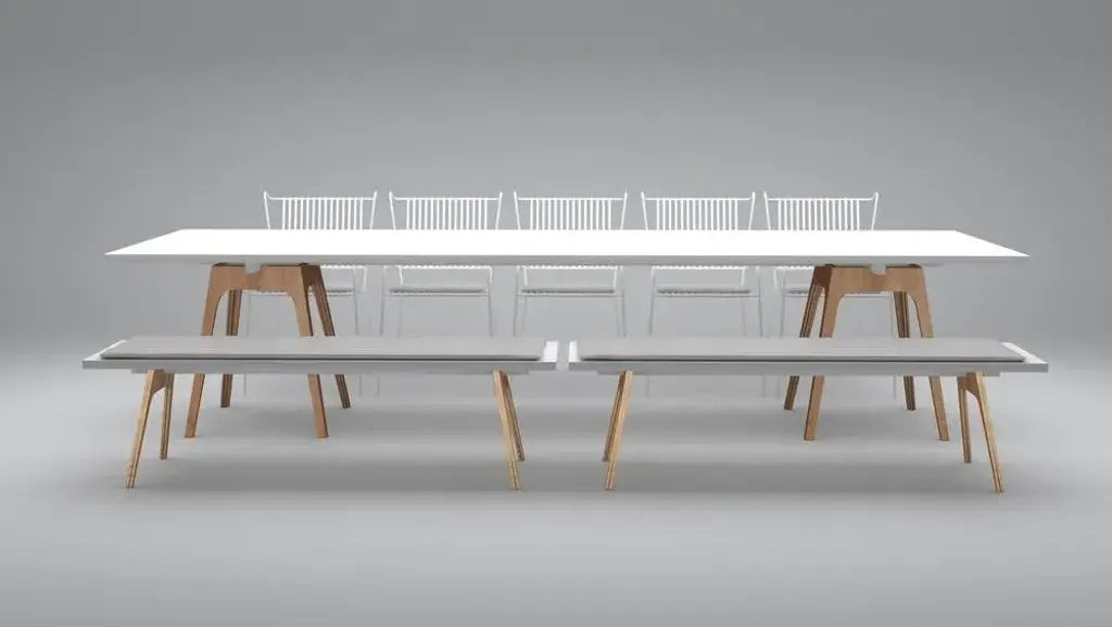 Marina white dining table by cools collection handmade. Dimensions: d 100 x w 340 x h 75 cm. Materials: legs: teak/dibond. Tabletop: spruce with corrosion resistant boat paint. Table top & bench top available in black or white. Please contact us. An extra large dining table for memorable times with your loved ones. Characterized by its elegant simplicity and powerful presence, the marina table is made of high-quality wood. The white or black table top is set upon two teak wood blocks, with an intelligent underconstruction that doesn't require screws and stabilizes the table. It is made for indoor/outdoor use. A special boat lacquer protects the wood from the weather. You can find a cozy seat on the optional benches, which can be combined with the capri chairs or other beautiful chairs of choice.