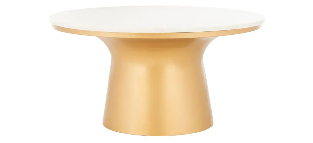 The epitome of transitional style, the Marlowe Table is chic but easily pairs with other interior styles. It's wide 54" tabletop provides ample space for dining, and the unique conical base features warm brass accents along the bottom, creating intrigue. Ships In 4-5 Weeks Brass accents White Terrazzo stone top and base This image is for illustrative purposes only. The colors shown are accurate within the constraints of lighting, photography, and the color accuracy of your screen.