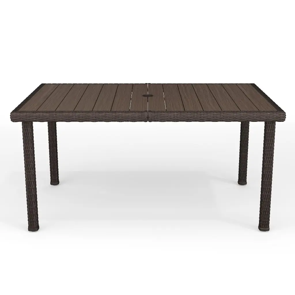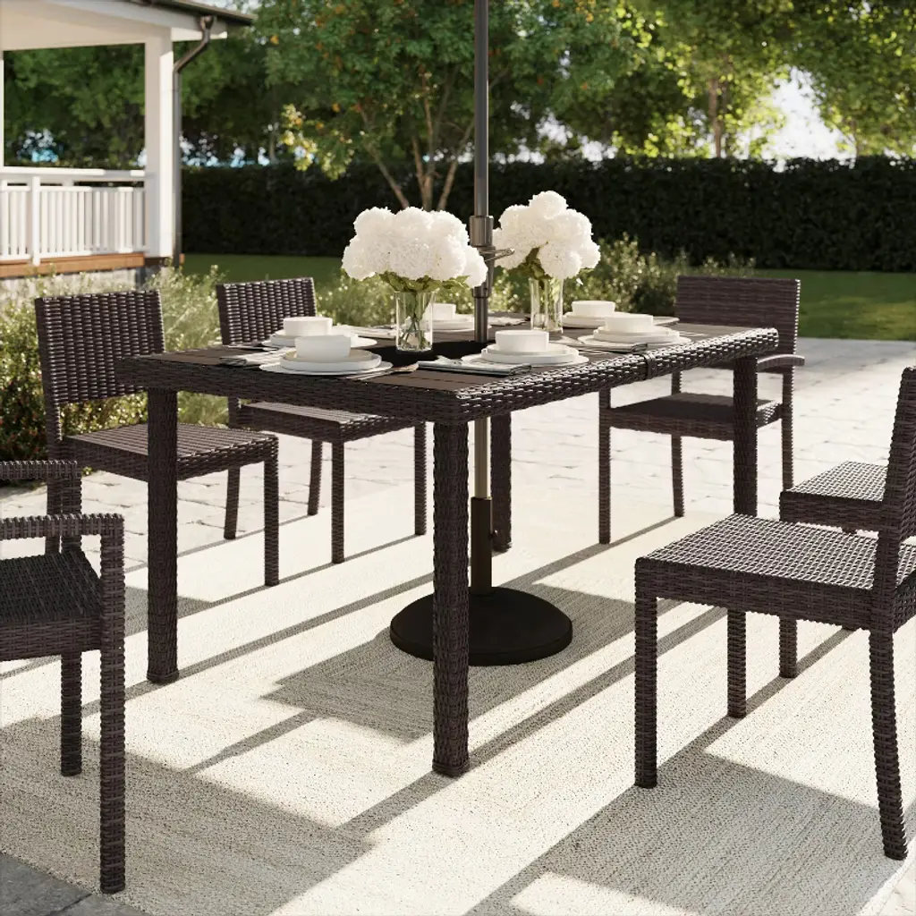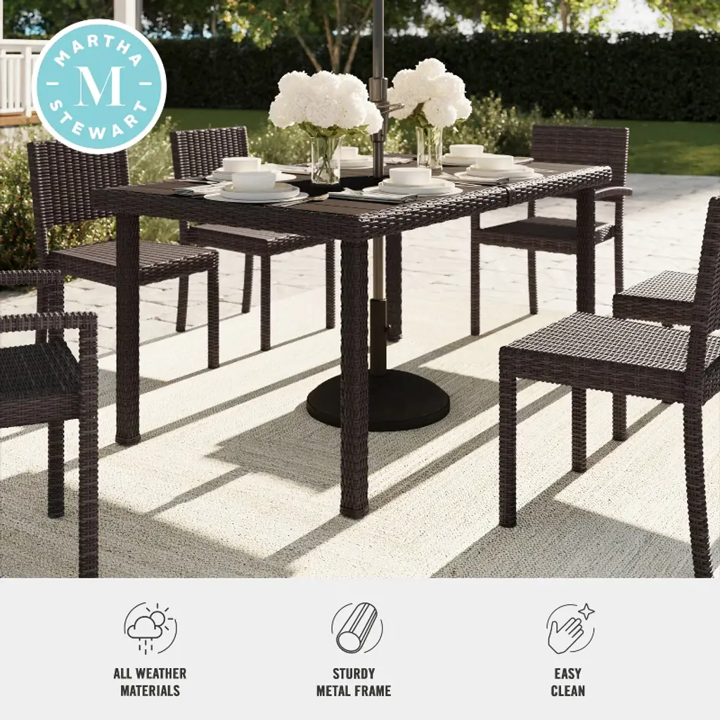 Refresh your patio space with the chic style of this Martha Stewart Bedford Patio Table. Sturdily built, this versatile patio table seats six and is the ideal companion for reading al fresco, enjoying cocktails with friends, or simply relaxing. This wicker table boasts a faux wood top and adjustable floor glides for a level dining surface while you make the most of sunny days or starlit evenings. An umbrella hole makes it easy to complement this indoor-outdoor dining table with your preferred patio umbrella (not included). Part of our Bedford collection, this table pairs wonderfully with the coordinating pieces allowing you to craft a custom collection that fits your entertaining needs. Setup is simple with tools included and step-by-step instructions while upkeep is just as easy.