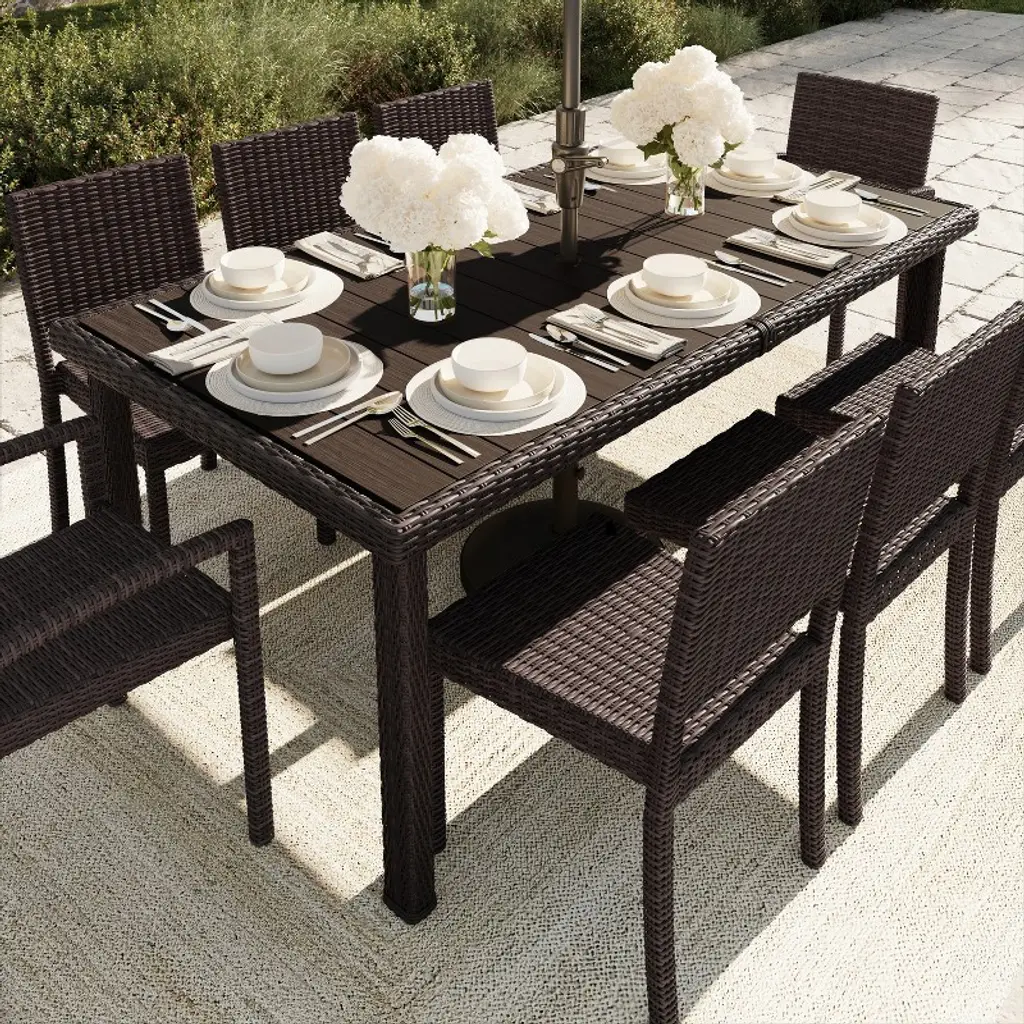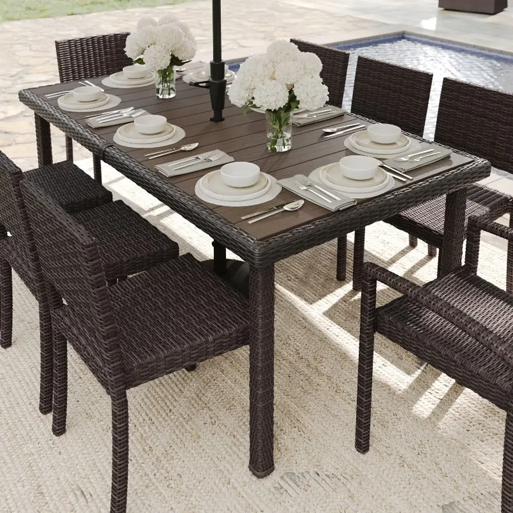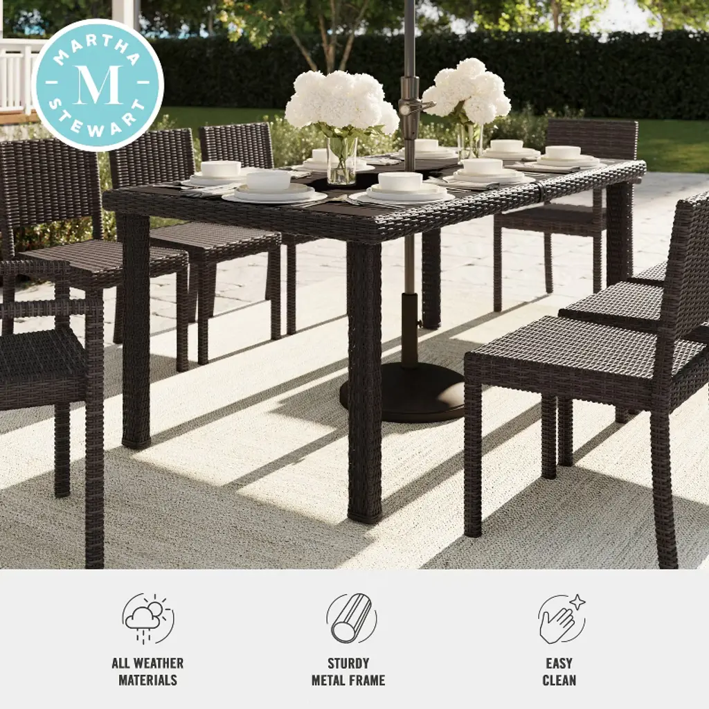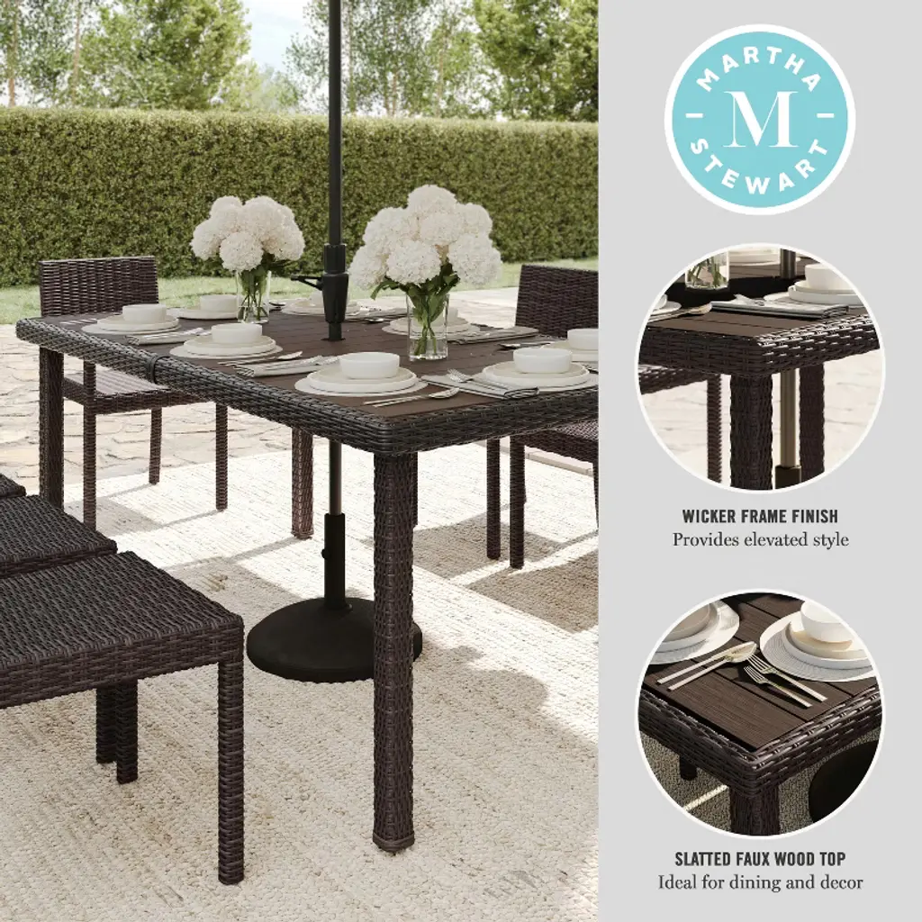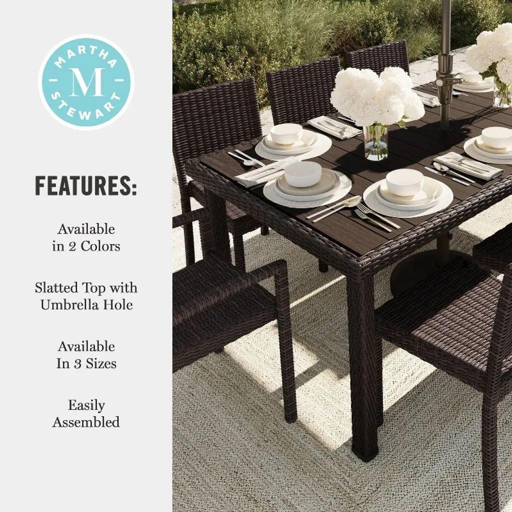 Refresh your patio space with the chic style of this Martha Stewart Bedford Patio Table. Sturdily built, this versatile patio table seats eight and is the ideal companion for reading al fresco, enjoying cocktails with friends, or simply relaxing. This wicker table boasts a faux wood top and adjustable floor glides for a level dining surface while you make the most of sunny days or starlit evenings. An umbrella hole makes it easy to complement this indoor-outdoor dining table with your preferred patio umbrella (not included). Part of our Bedford collection, this table pairs wonderfully with the coordinating pieces allowing you to craft a custom collection that fits your entertaining needs. Setup is simple with tools included and step-by-step instructions while upkeep is just as easy.