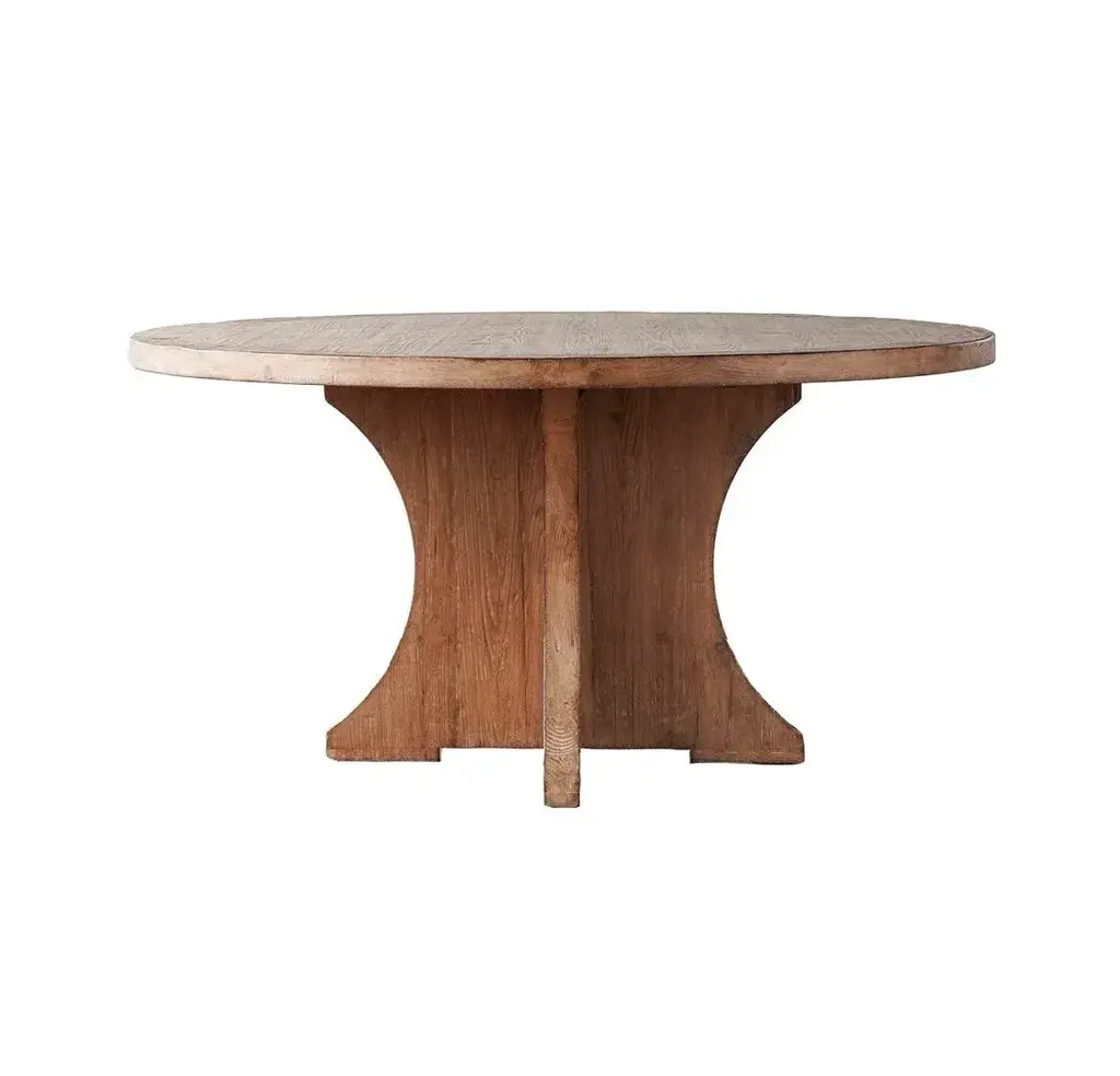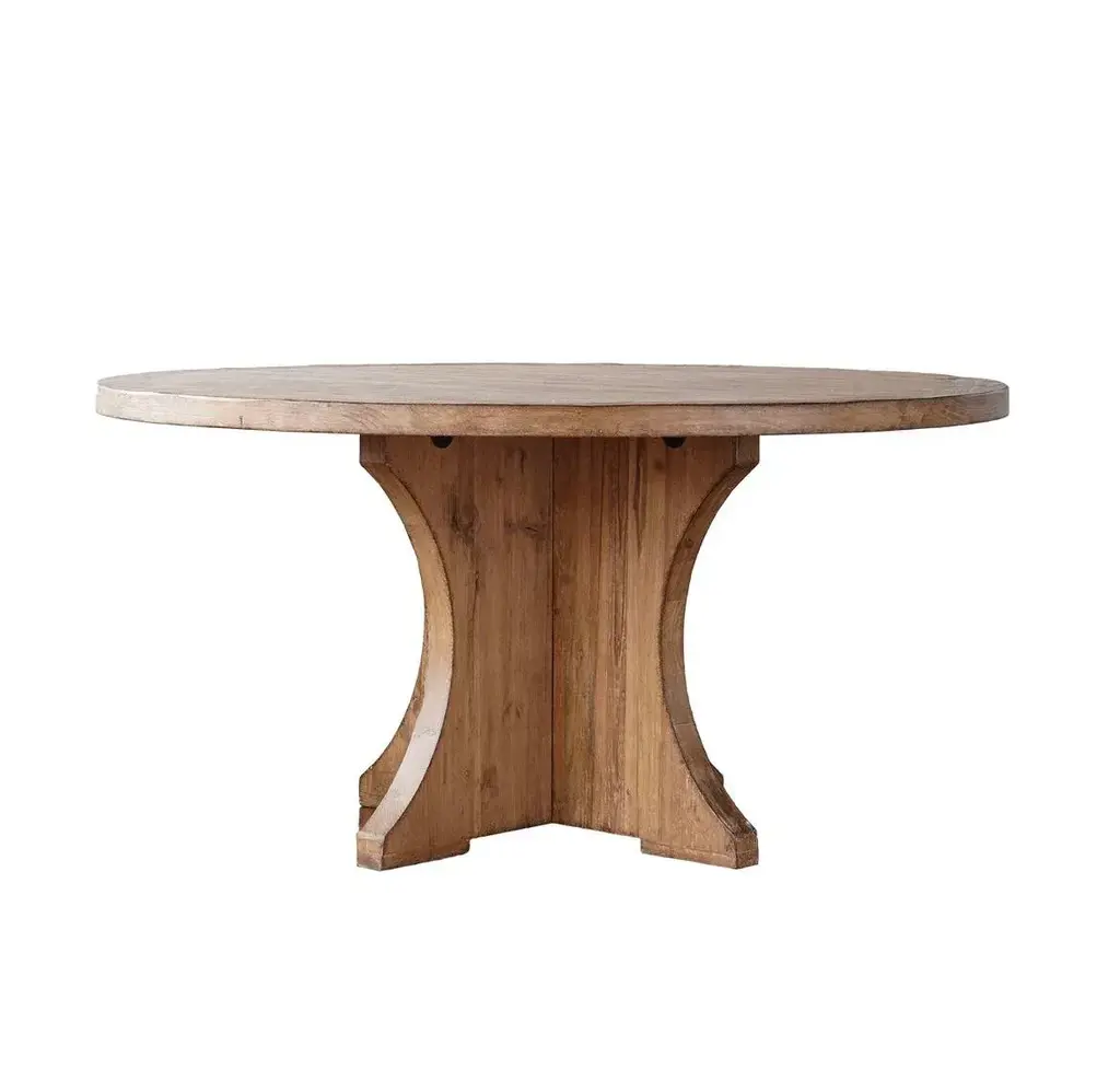 New item The Bridge Hampton Collection sings with symmetry and curvy appeal. The Bridge Hampton Dining Table, Round has interlocking, cross-shaped legs. Each leg has a half-moon cut-out that transforms the look. The Bridge Hampton Dining Table, Round comfortably seats eight and is made of upcycled pine wood with an antique natural finish.