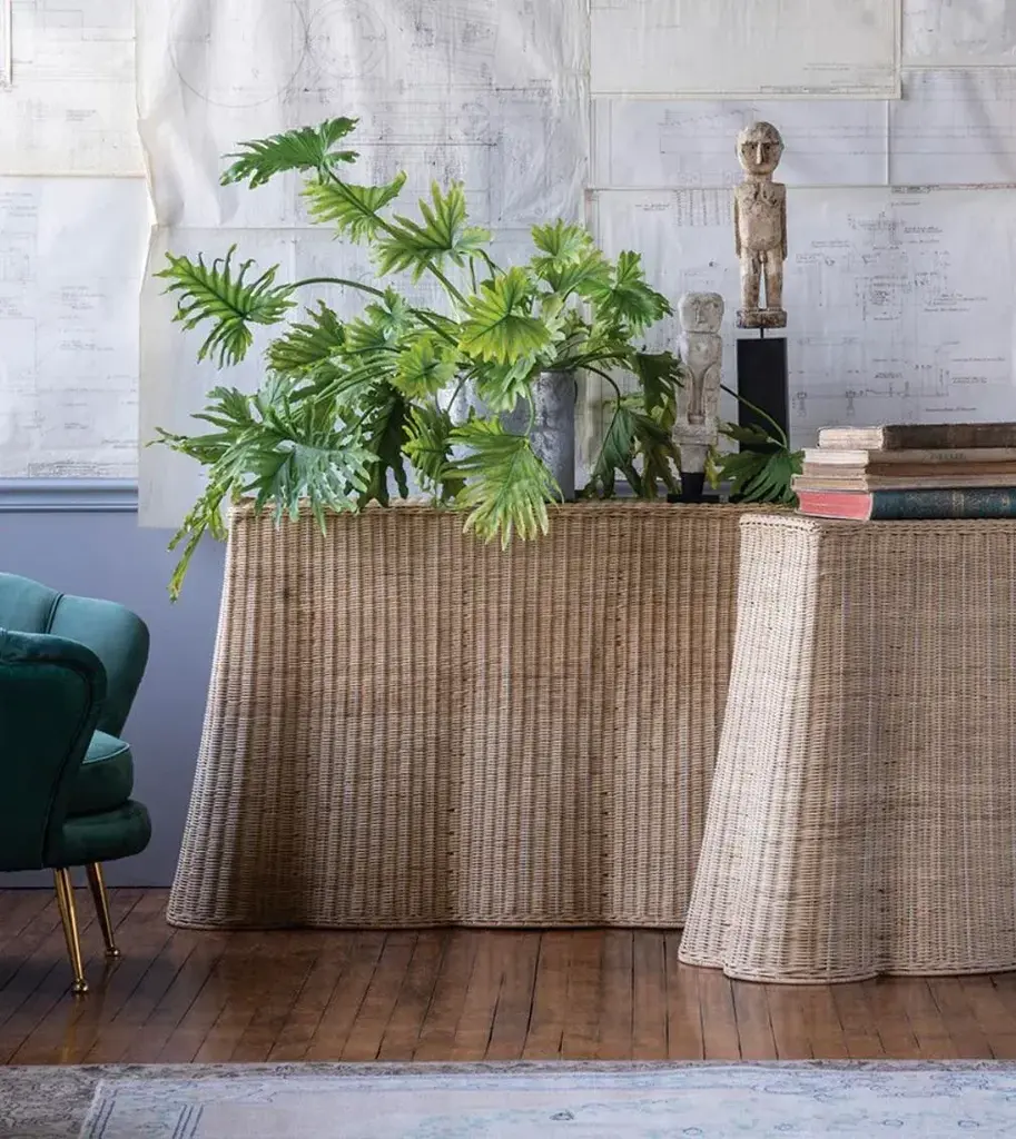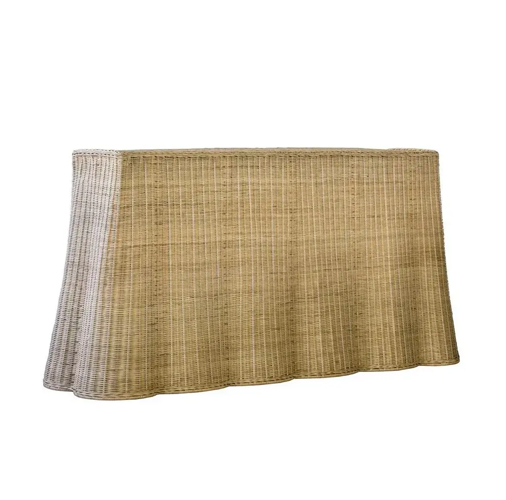 New Special Order Item. Table is an alluring option with its supple, top-to-floor design. Made of a natural rattan frame and weaving, the Console Table has the illusion of flowing fabric without the fuss. The rattan console table works beautifully behind a couch, in a three-season room or dining room.