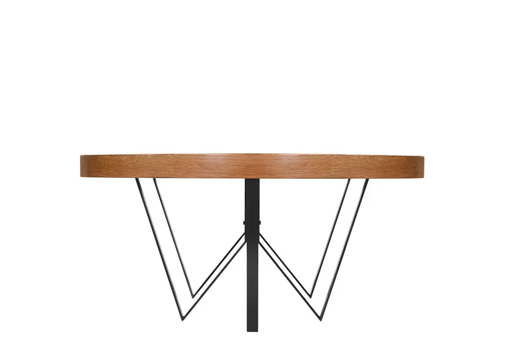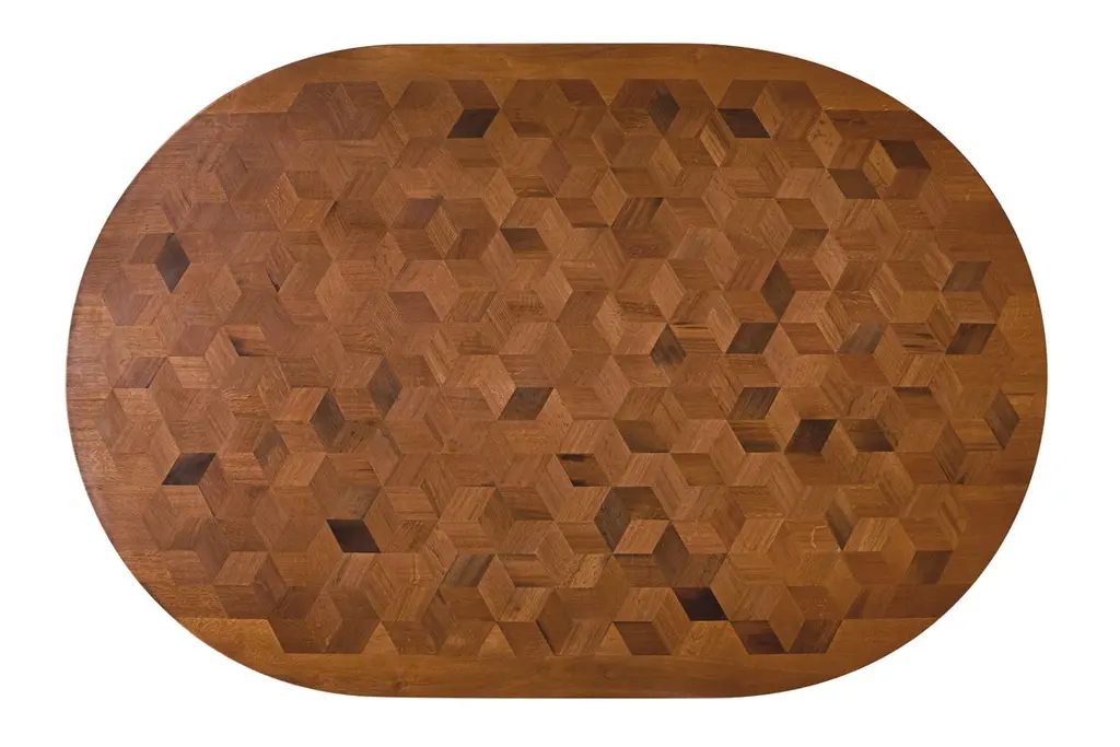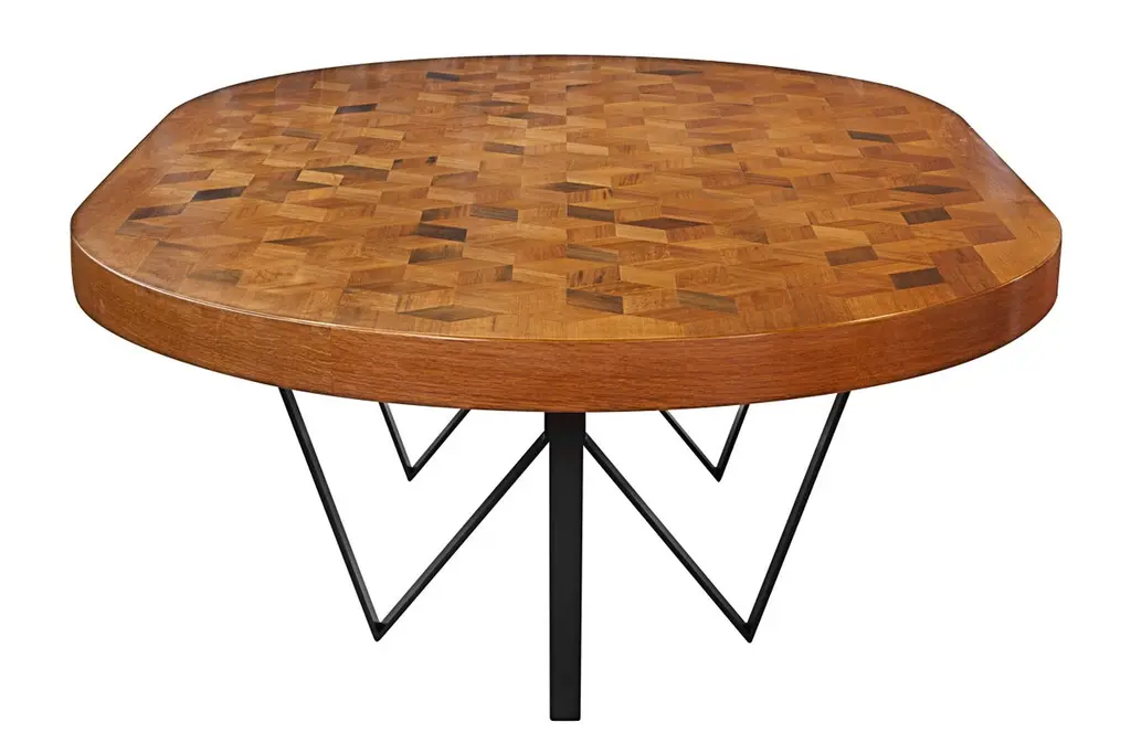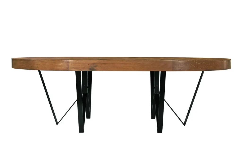 Maurits Reclaimed Oak Oval Dining Table by Fred and JuulDimensions: D 160 x W 295 x H 78 cm.Materials: Reclaimed oak and black metal.Available in round or stadium shape. Also available in different materials. Custom sizes, materials or finishes are available. Please contact us.Inspired by the work of Escher and marquetry, with Maurits we want to prove that a table doesn’t have to be antique to be an impressive testimony of craftsmanship. The solid Oak table top, inlaid with 222 rhombi , and the iron legs, composing a delicate inverse coronation, together form a unique contemporary piece that gives our artisans the opportunity to put their mentors’ legacy to use.Fred&Juul, short for Federico Minarelli and Julie Janssen, are two architects who decided working as architects isn’t for them. It was when designing custom furniture for their clients and developing it with the amazingly skilled local artisans that they truly found joy in their work. So, in 2012 they decided to solely focus on that and launched their first lighting and furniture collection. With the exception of the renovation of the old Tuscan farmhouse that would become their home and studio, a labor of sorrow, but mostly love (see the result on the press page!).What sets them apart is how they see and use their materials of choice: bronze, brass, wood and stone. Their designs value the inherent nature of these materials and how they are meticulously crafted, like the grainy, clouded surface of their Raffaele light in sandcast brass or the juxtaposed Oak grains in the marquetry of their Maurits table. Starring all these aspects in the story of a piece, is what makes it unique and last.Over the years they have increasingly worked with interior designers on custom pieces for high end projects all over the world, thanks to their attention for detail, refined aesthetic sense and collaboration with the best highly specialized craftsmen Tuscany has to offer.