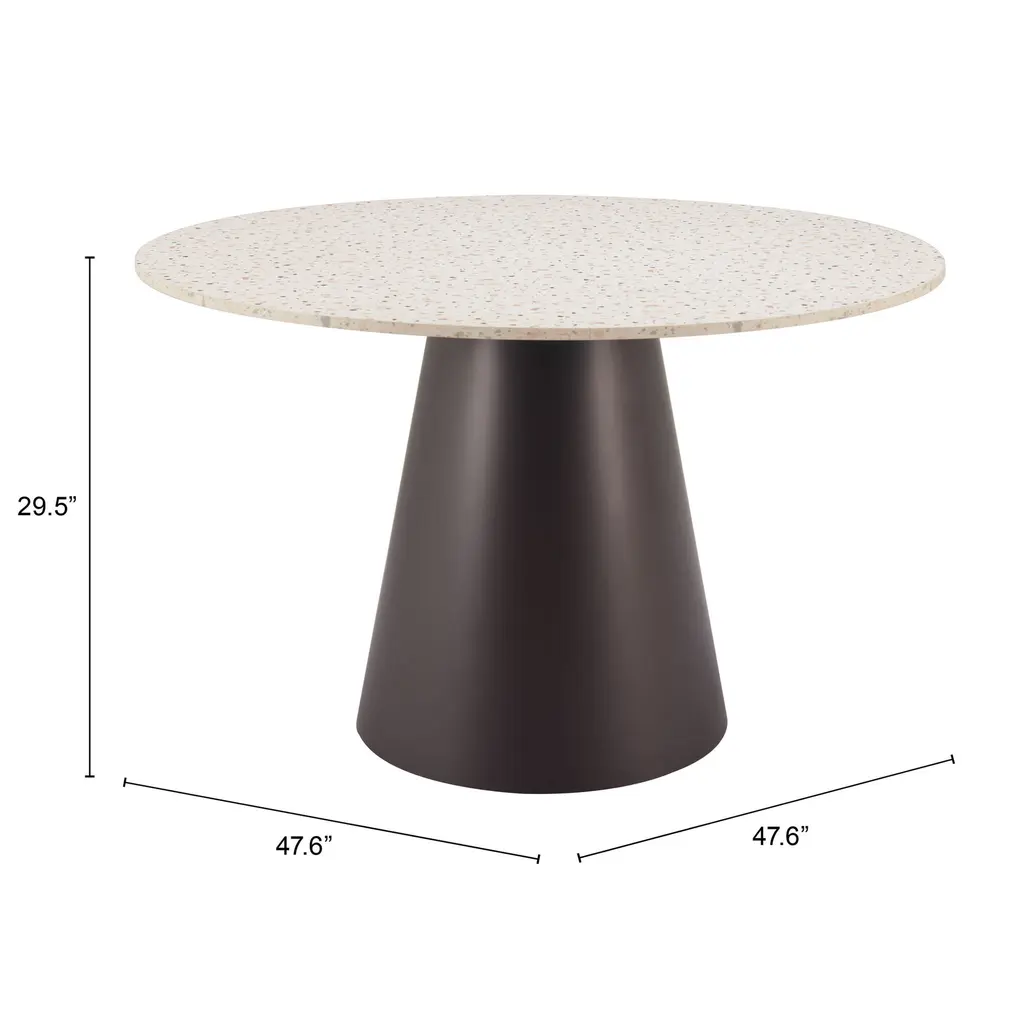 Contrasting a beautifully speckled round faux-terrazzo top with a tapered bronze pedestal, the Maven dining table is sturdy, stylish, and space saving. A versatile complement for an array of modern side chairs, this sleek contemporary table seats up to four in modern kitchens and dining nooks. Maven's mixed-material versatility enriches any setting to make everyday meals feel special.