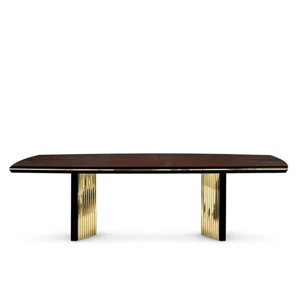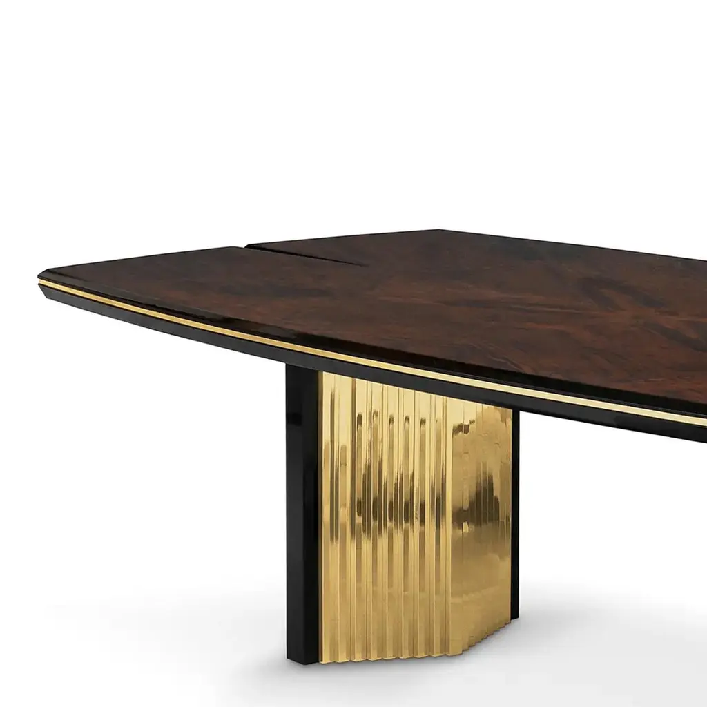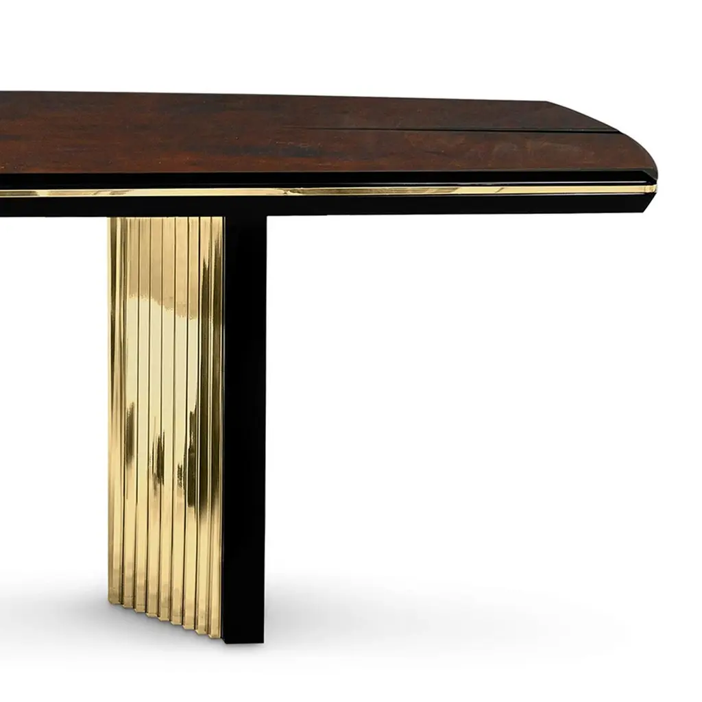 Dining Table Maxima Walnut with wooden walnut lacqueredtop and structure and with gold plated solid polished brasstrim. With gold plated solid polished brass on base.