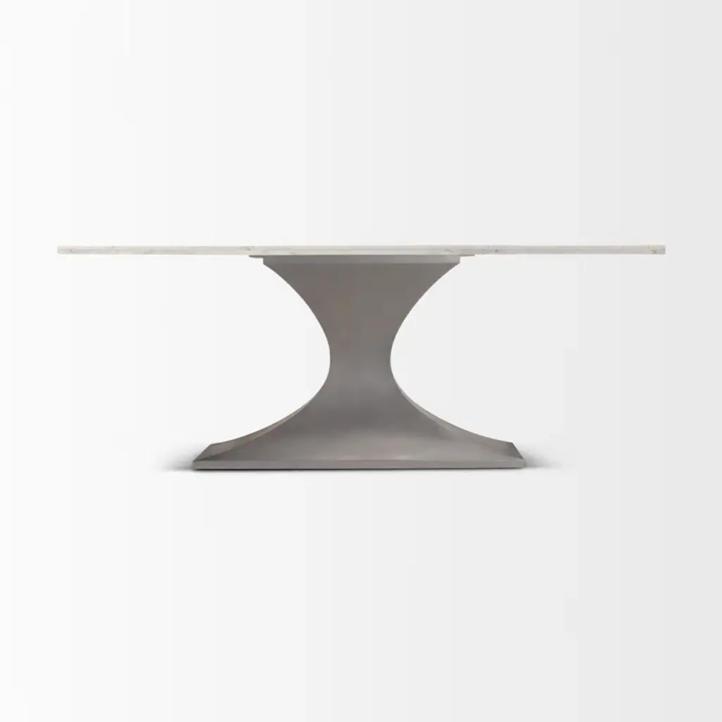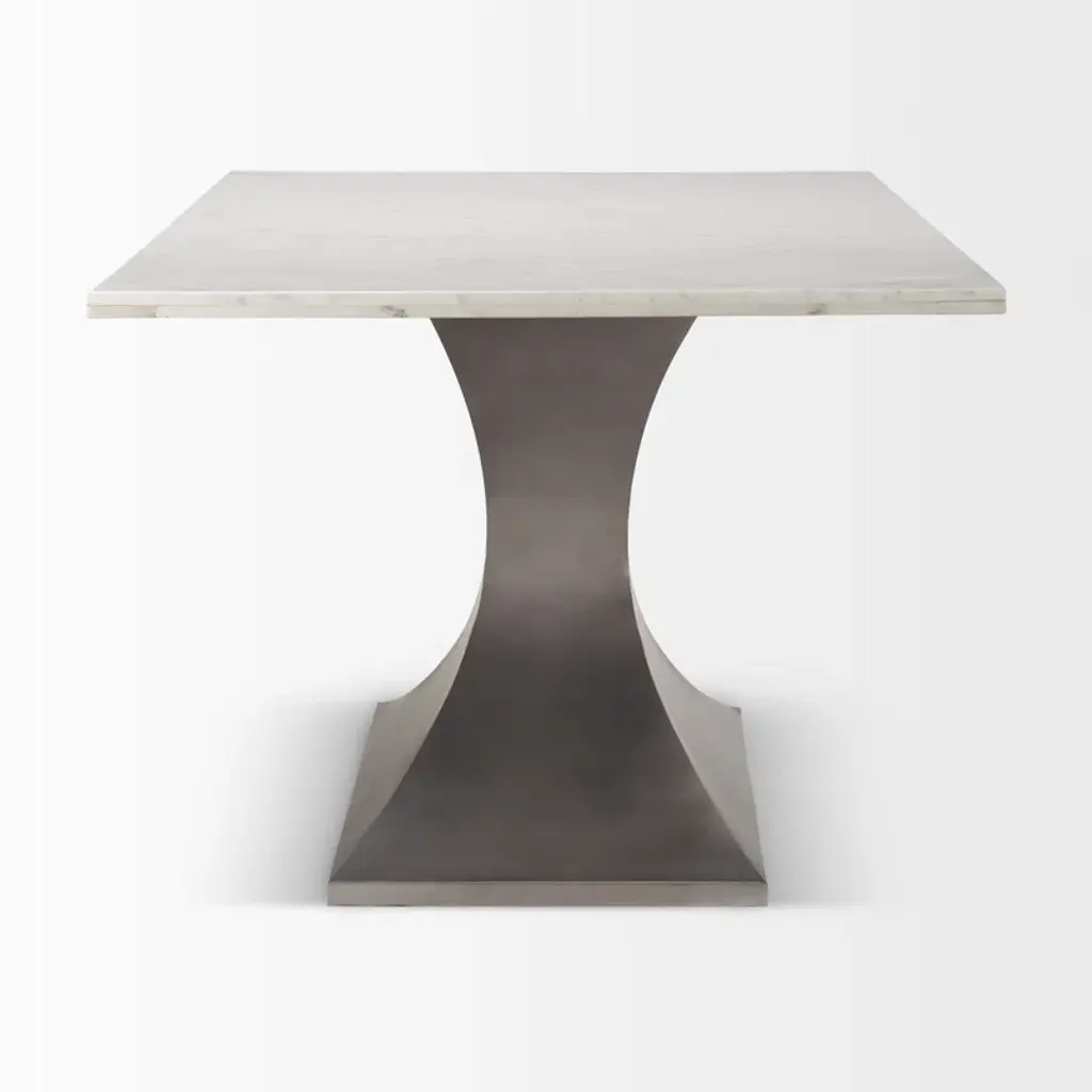 Invite family and friends around this dining table to enjoy lots of good times and delicious food. It features an eye-catching iron pedestal base that highlights dynamic curves that hint at an hourglass silhouette. A bold black finish contrasts with the rectangular table top for an effortless mod vibe we love. Measuring just under 80" wide, it can accommodate up to six people, so cozy, casual get-togethers are definitely on the docket in the future.