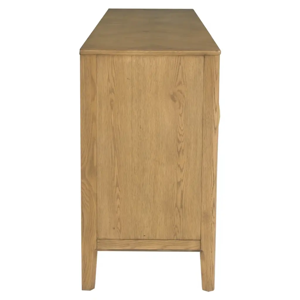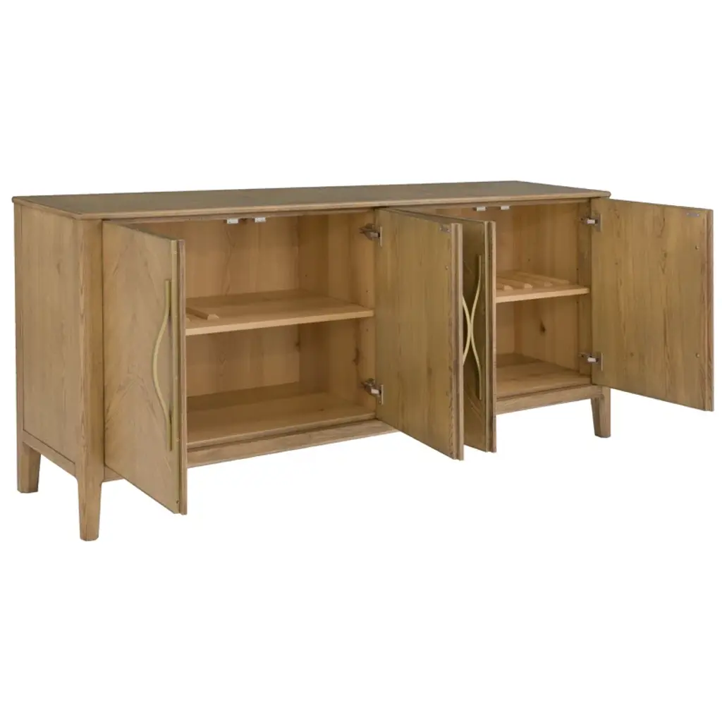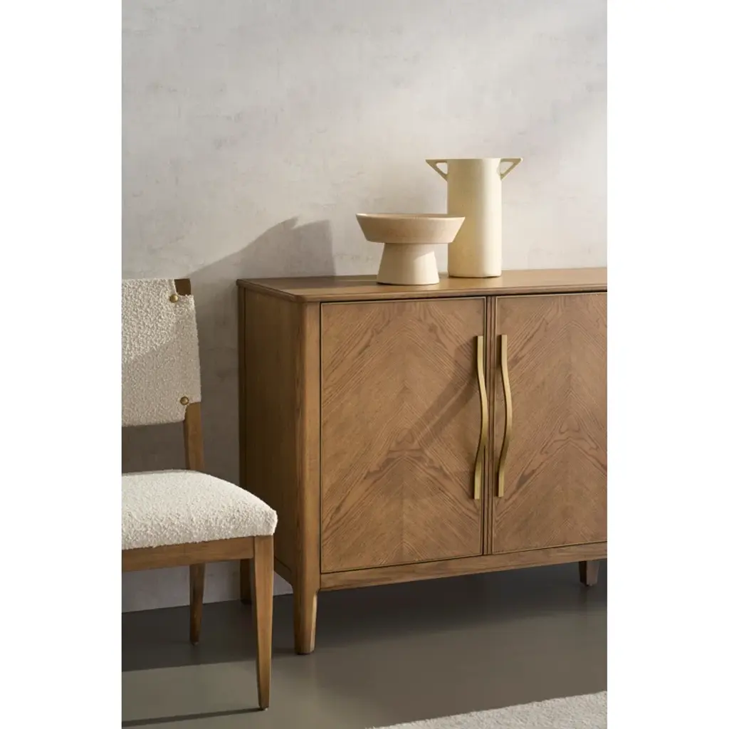 Inspired by mid-century design, our Maxwell collection features clean lines paired with rounded corners to create a modern yet timeless aesthetic. crafted from hand-selected oak solids and veneers, the Maxwell dining collection consists of a dining table. Credenza, armchair, and side chair. special features include a dining table extending from 78" to 118", chairs covered in cream bouclé and punctuated with large brass nail detail on seat backs, and a solid brass handle on the credenza.