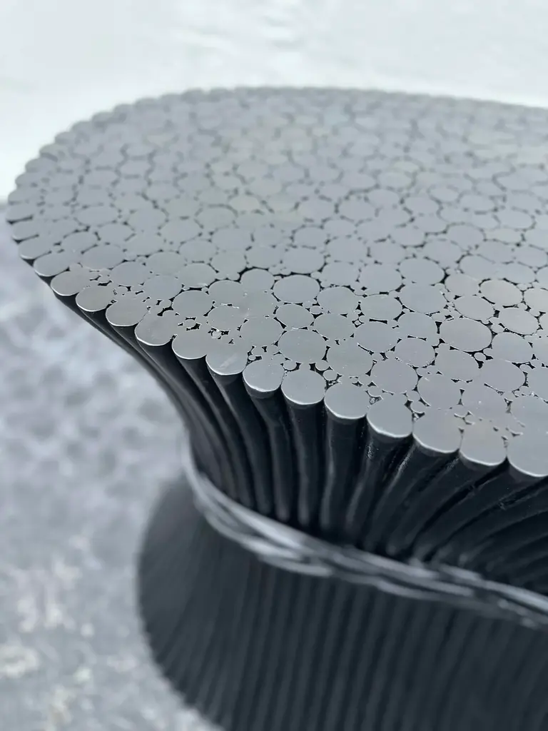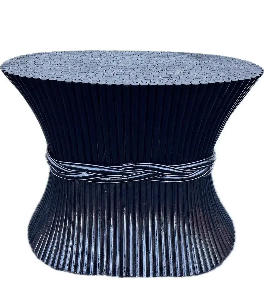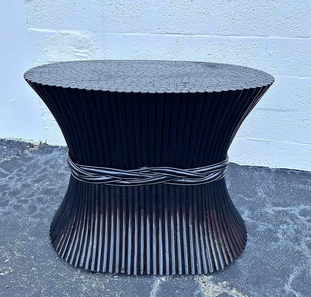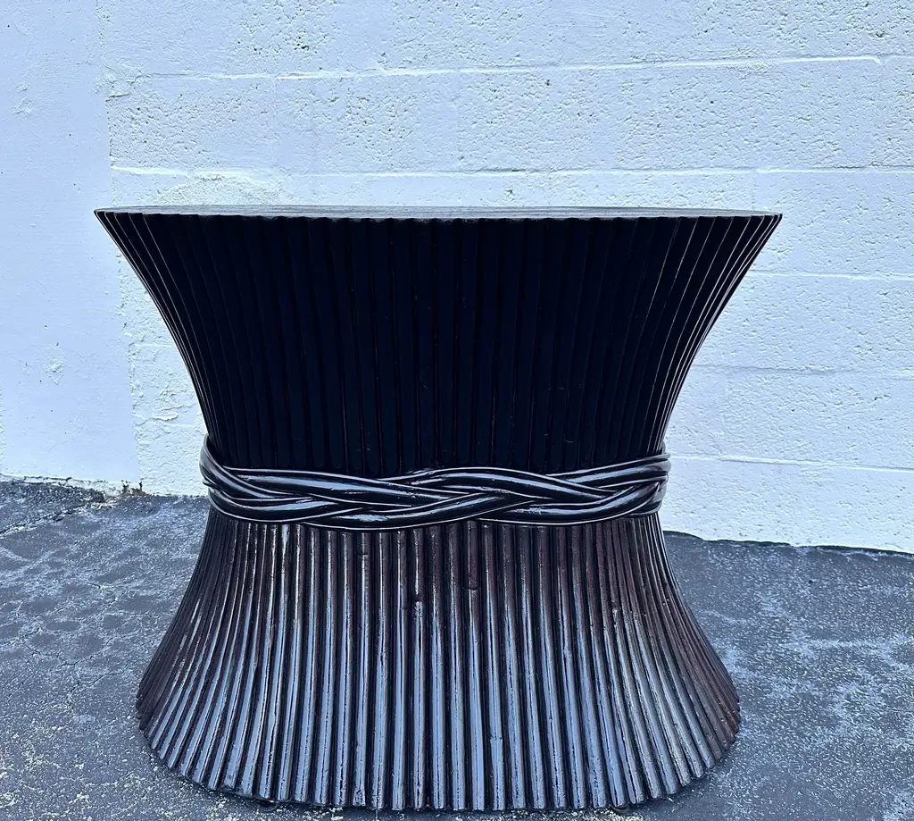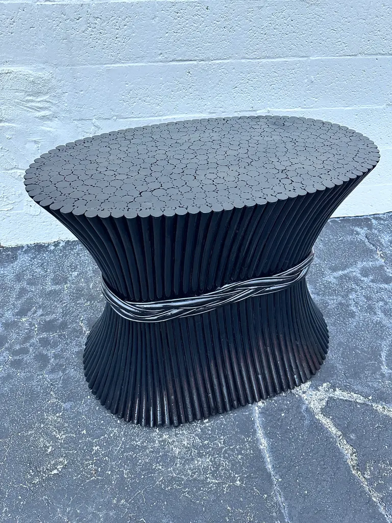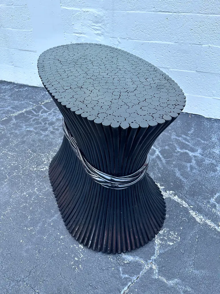 Organic modern sheaf of wheat bamboo dining table base or foyer table attributed to McGuire circa 1970s Inspired by nature the table shows organic shape like sheaf of wheat taper with a band. Finish with a black lacquered,it was with a 86” oval glass top with 8 chairs,you can customize a glass top to fit your needs smaller or larger it’s a spectacular base. There’s no name attaché to it but I notice all of this type of table base don’t have it.