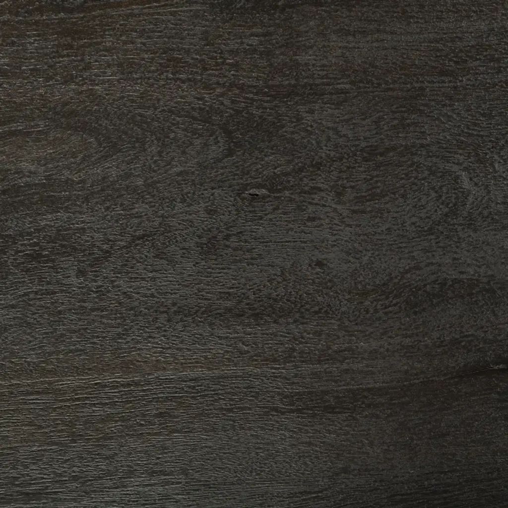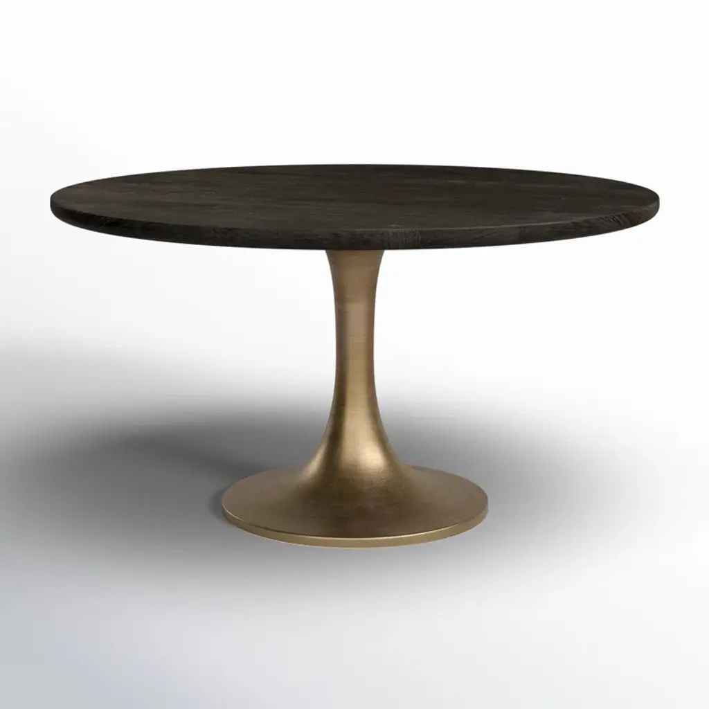 This table in an remarkable round dining table with a matte black tapering solid iron base, with a solid Indian mango wood top with a dark weathered teak finish, that looks amazing in almost any room.