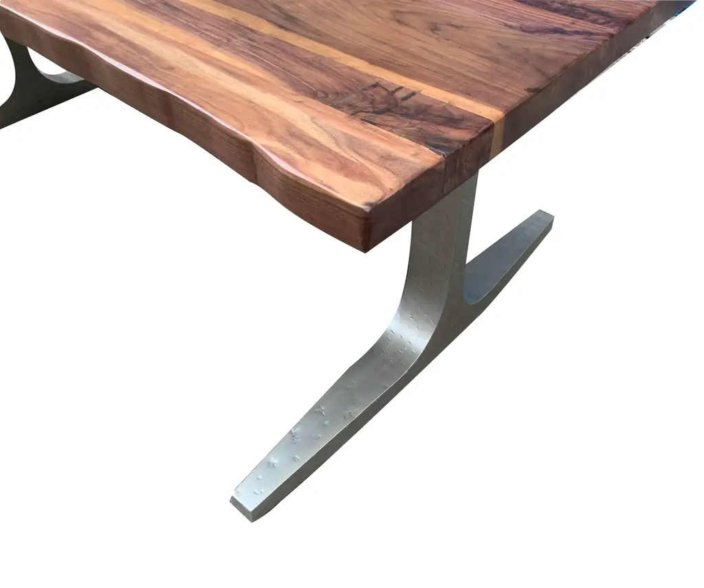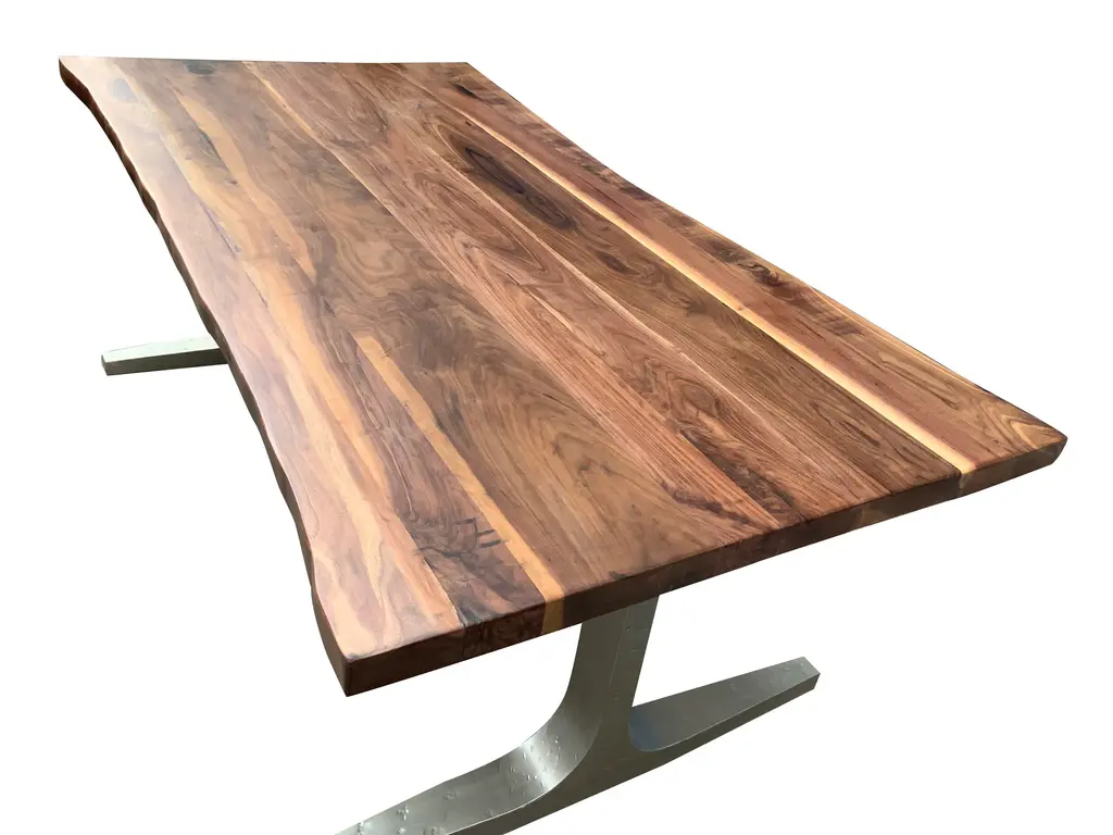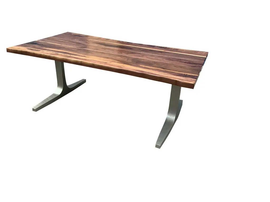 Modern mid century style solid walnut dining table. The table top is 2’’ thick. The bases are iron with a silver finish with gold highlights. The table has a free form design. The table has a natural light walnut finish. The table is heavy and well made.