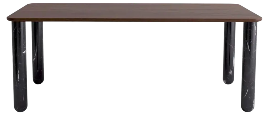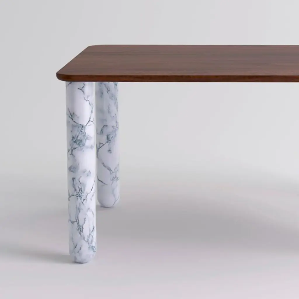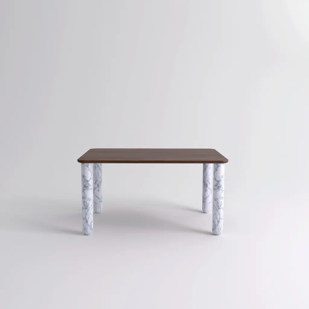 Medium Walnut and White Marble "Sunday" dining table, Jean-Baptiste SouletieDimensions: 150 W x 100 D x 74.5 H cmMaterials: white Pele de Tigre marble legs, walnut wood top.Different finishes and sizes are availableSunday is a family of dinner tables, coffee tables and consoles with a simple and sculptural design. The mix of heavy marble legs and a thin solid wood top creates an interesting contrast while the rounded edges and generous proportions provide a comforting feeling.Sunday is all about the materials: 3 marbles and 2 woods are available in the collection.Sunday comes in a wide variety of dimensions and 2 different marble legs heights to perfectly fit your interior whether you need a small coffee table, a large one, a console, or even a dinner table that will seat 10 guests on a friendly Sunday lunch.Jean-Baptiste Souletie is the Co-founder of the furniture editor La Chance with Louise Breguet. He studied in India, worked for a merchant bank in London (where he designed their new offices), before working for an investment fund (where he redevised the graphic chart), and in the strategic department of a luxury goods company in Paris. He returned to his first loves, architecture and furniture, when he founded La Chance in 2012.