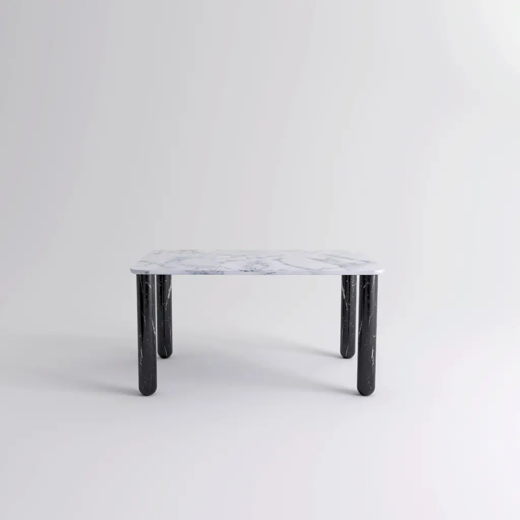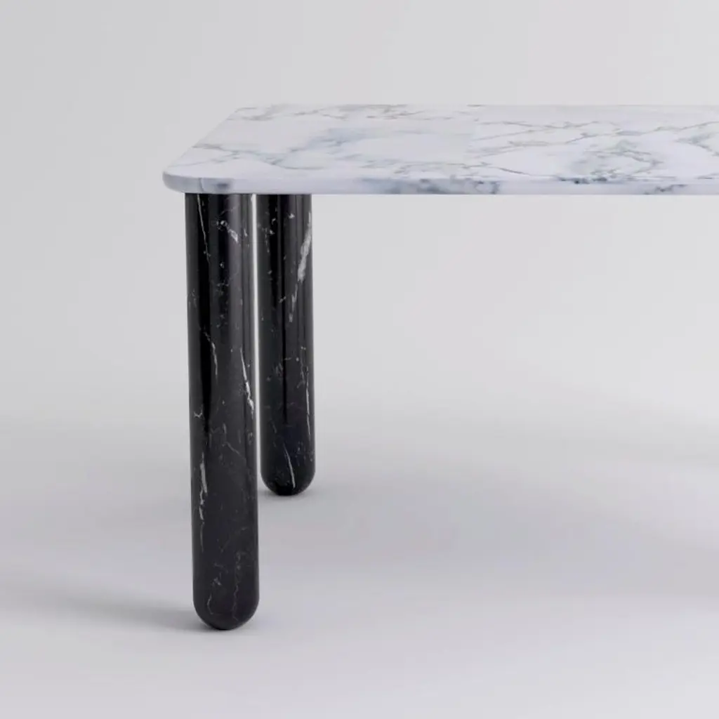 Medium white and black marble "Sunday" dining table, Jean-Baptiste Souletie.Dimensions: 150 W x 100 D x 74.5 H cm.Materials: black Marquina marble legs, white Pele de Tigre marble top.Different finishes and sizes are available.Sunday is a family of dinner tables, coffee tables and consoles with a simple and sculptural design. The mix of heavy marble legs and a thin solid wood top creates an interesting contrast while the rounded edges and generous proportions provide a comforting feeling.Sunday is all about the materials: 3 marbles and 2 woods are available in the collection.Sunday comes in a wide variety of dimensions and 2 different marble legs heights to perfectly fit your interior whether you need a small coffee table, a large one, a console, or even a dinner table that will seat 10 guests on a friendly Sunday lunch.Jean-Baptiste Souletie is the Co-founder of the furniture editor La Chance with Louise Breguet. He studied in India, worked for a merchant bank in London (where he designed their new offices), before working for an investment fund (where he redevised the graphic chart), and in the strategic department of a luxury goods company in Paris. He returned to his first loves, architecture and furniture, when he founded La Chance in 2012.