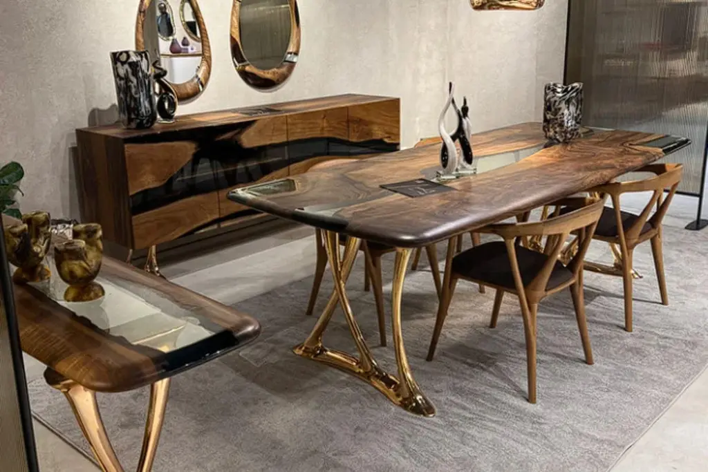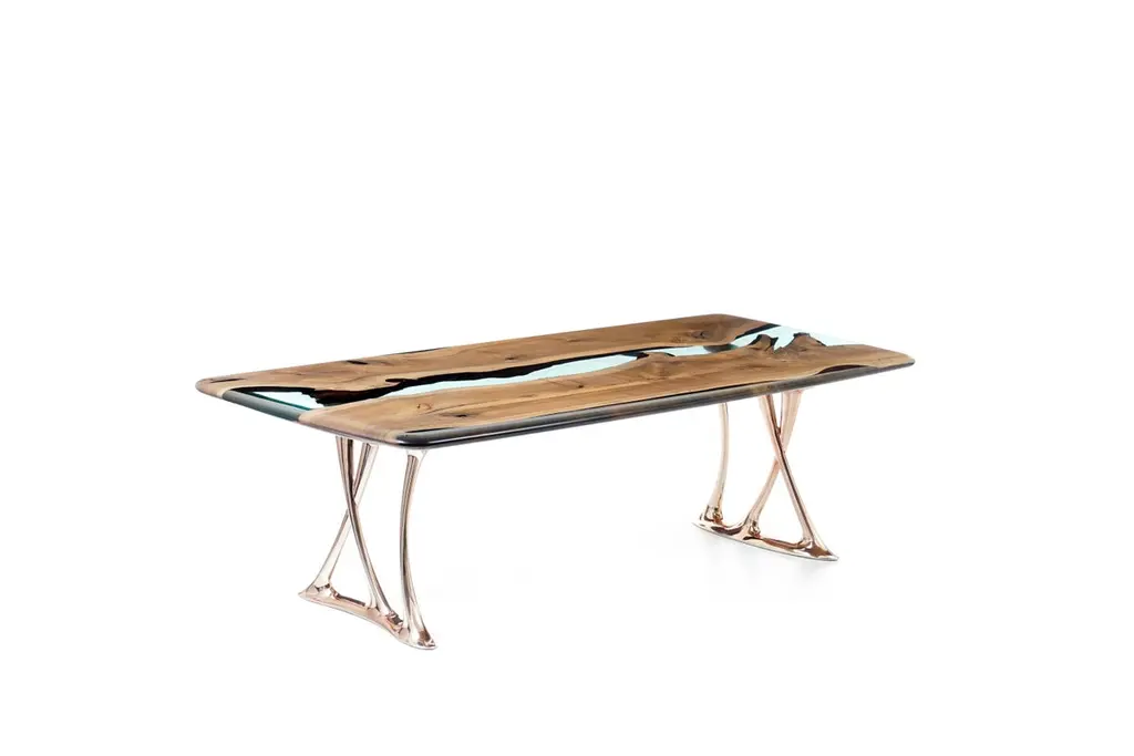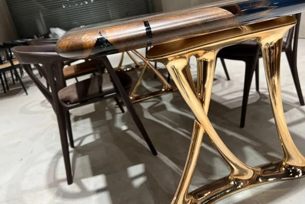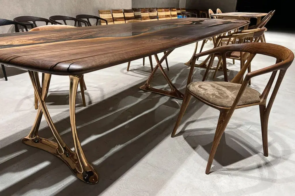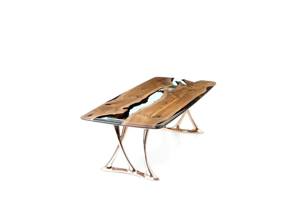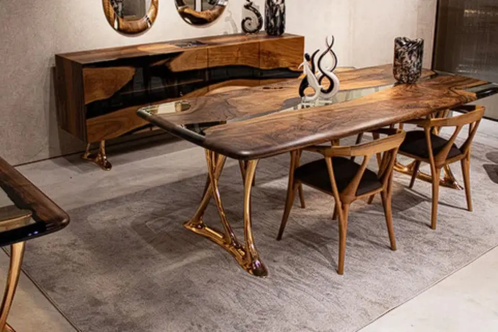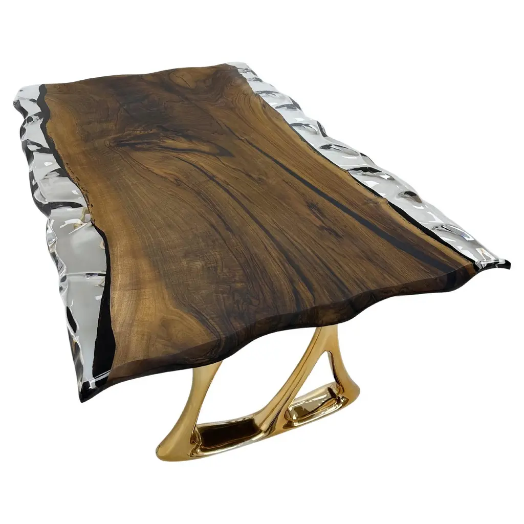 Enhance your dining experience with the exquisite Medma Dining Table, a meticulously crafted masterpiece made from the finest walnut wood with elegant gold-plated aluminum legs. This magnificent piece of furniture is designed to make a bold statement in any home, boasting a smooth and polished surface that is coated with crystal-clear resin epoxy for a stunning finish. The Medma Dining Table is the epitome of luxury, expertly crafted to create an elegant and sophisticated ambiance in your dining room. Its unique design and exceptional quality make it a perfect addition to any upscale home or business. Treat yourself and your guests to an unforgettable dining experience with the Medma Dining Table.Our products are customizable and made to order with varying materials and finishes. Please note that the cost may vary depending on the level of customization. Lead time will be confirmed upon inquiry.