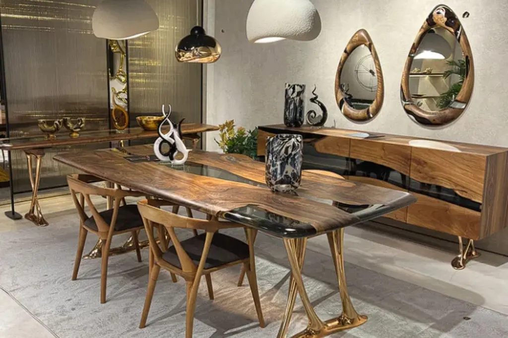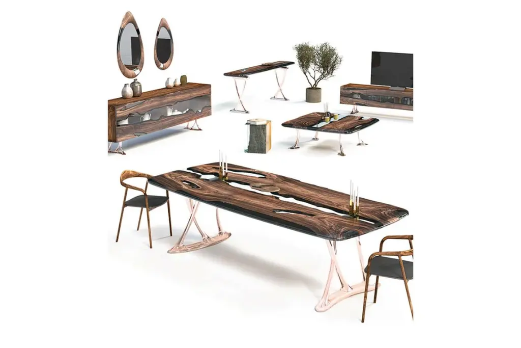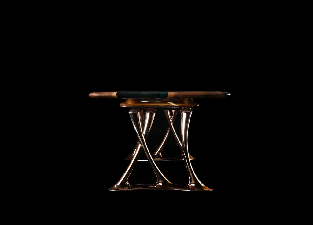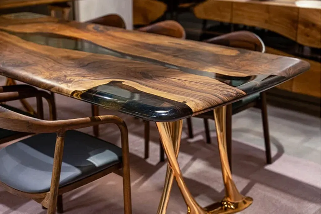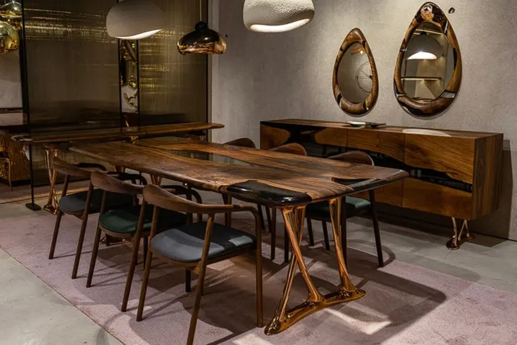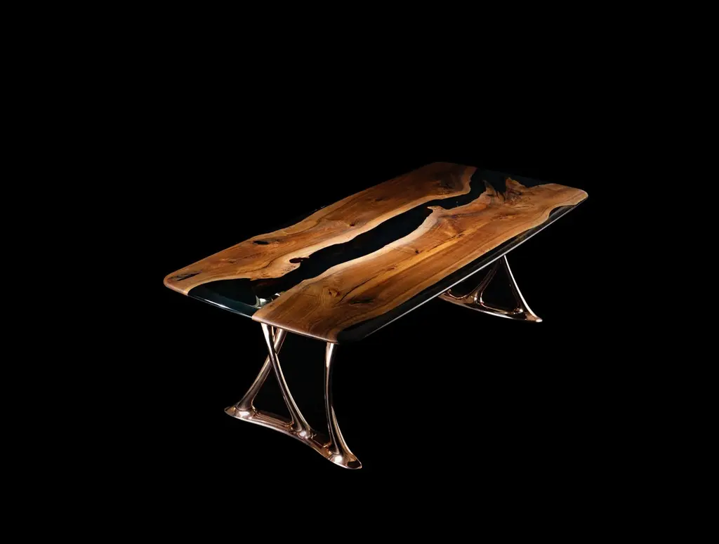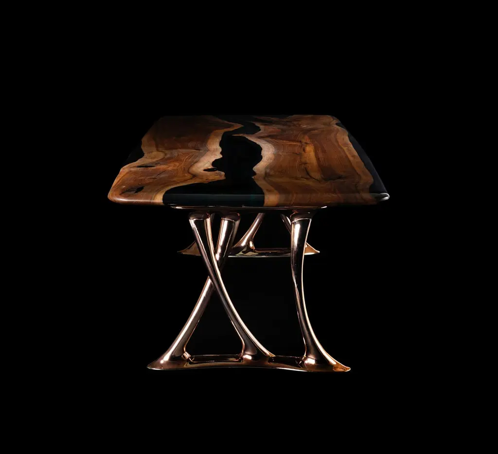 Enhance your dining experience with the exquisite Medma Dining Table, a meticulously crafted masterpiece made from the finest walnut wood with elegant gold-plated aluminum legs. This magnificent piece of furniture is designed to make a bold statement in any home, boasting a smooth and polished surface that is coated with crystal-clear resin epoxy for a stunning finish. The Medma Dining Table is the epitome of luxury, expertly crafted to create an elegant and sophisticated ambiance in your dining room. Its unique design and exceptional quality make it a perfect addition to any upscale home or business. Treat yourself and your guests to an unforgettable dining experience with the Medma Dining Table.Our products are customizable and made to order with varying materials and finishes. Please note that the cost may vary depending on the level of customization. Lead time will be confirmed upon inquiry.