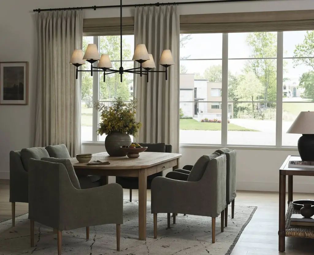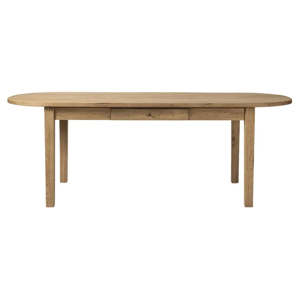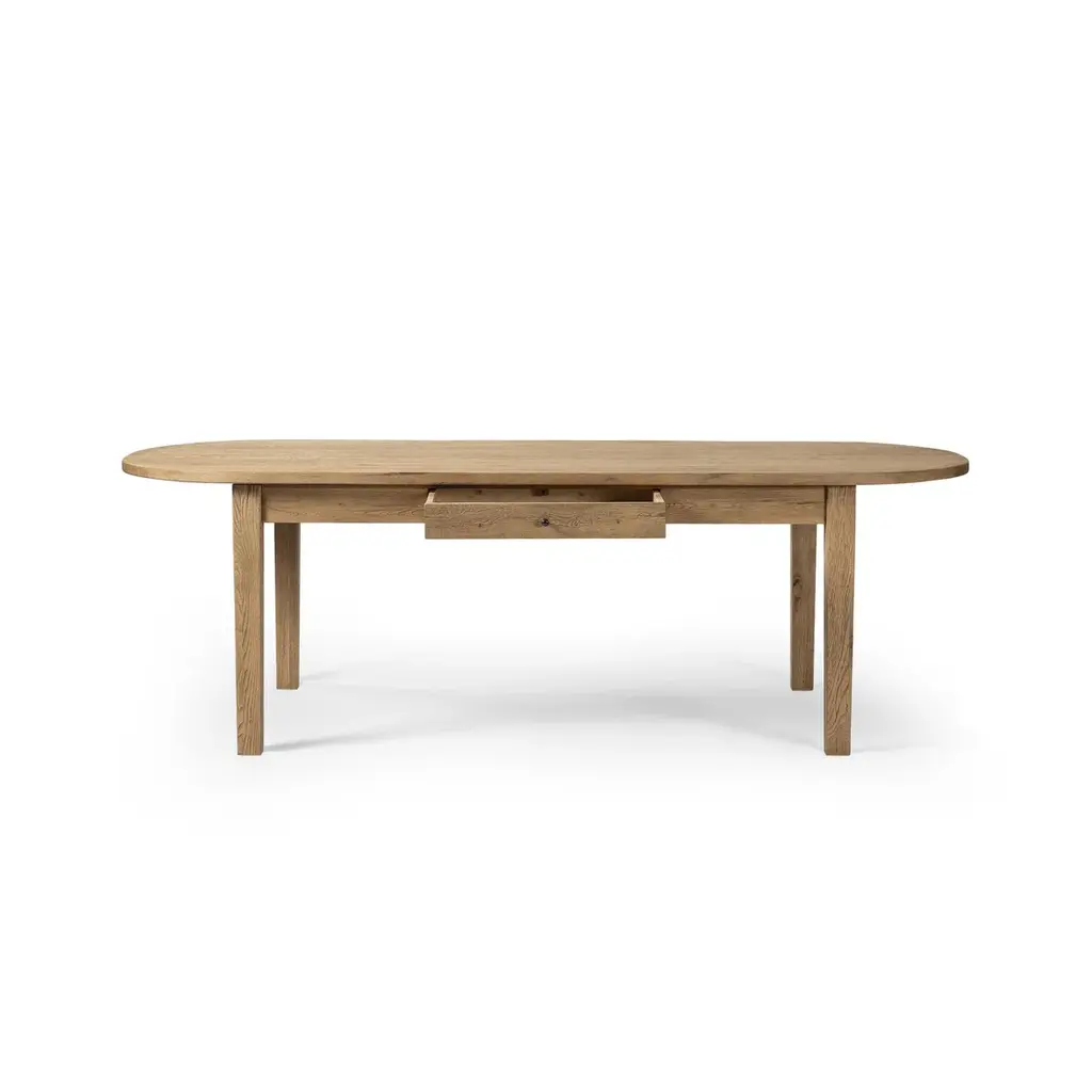 Made from solid oak with a light, worn finish, an oval-shaped dining table features elevated foot detailing in brushed aluminum, plus wire-brushing for an antiqued look. Inspired by antique harvest tables, center drawers on each side are ready to store silverware or small linens. A design collaboration by Amber Lewis and Four Hands. This item has limited online distribution and may not be sold on websites without prior approval. Visit the FAQ page in our Help Center for more details.
