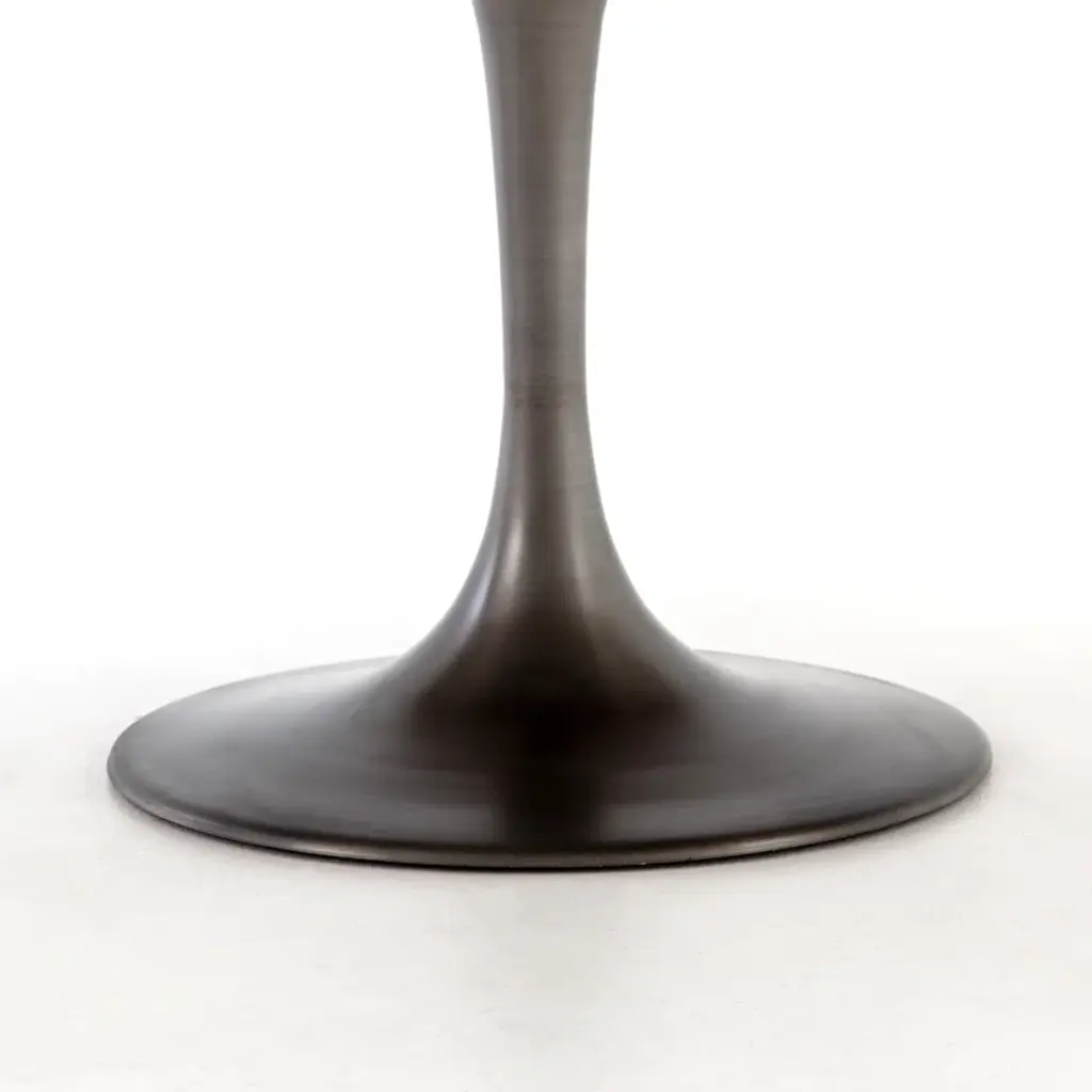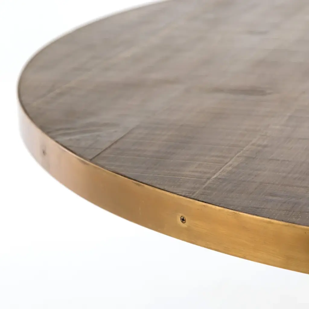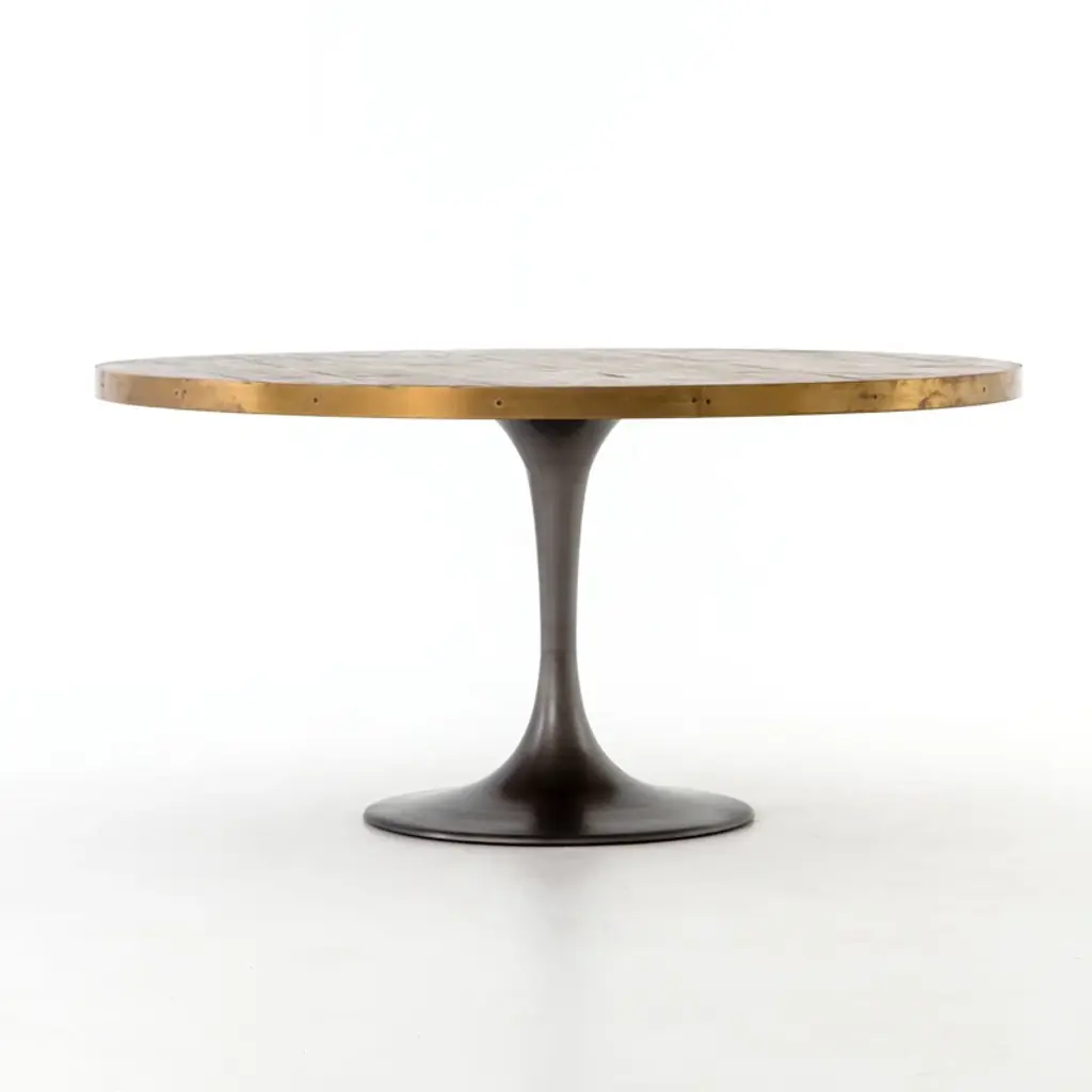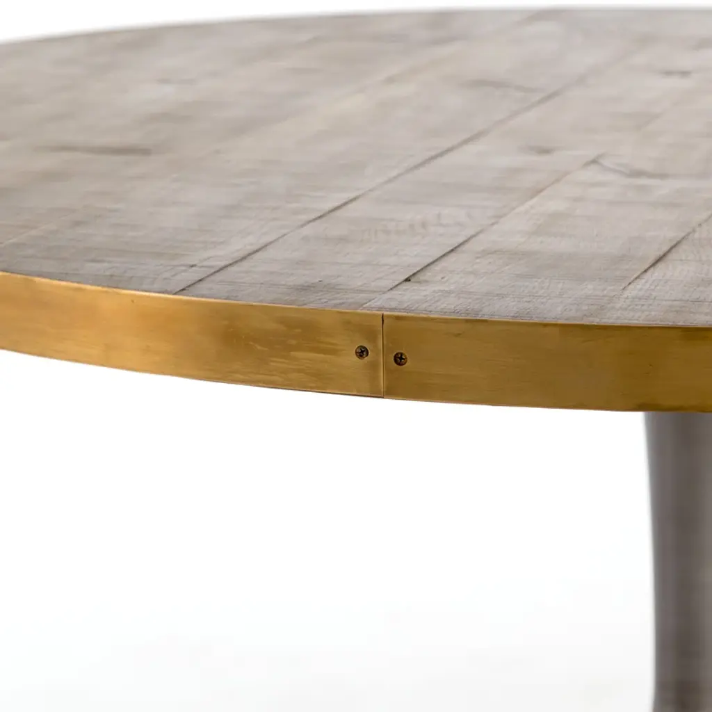 Give your decor mid-century modern appeal with the stunning washed oak veneered Melchior Solid Oak Dining Table Table that features an hourglass-shaped base with a brushed brass finish. As the beautiful herringbone pattern of this round dining table shows, veneers are very suitable for marquetry. High-quality veneer lasts longer than solid wood which warps or cracks over time.