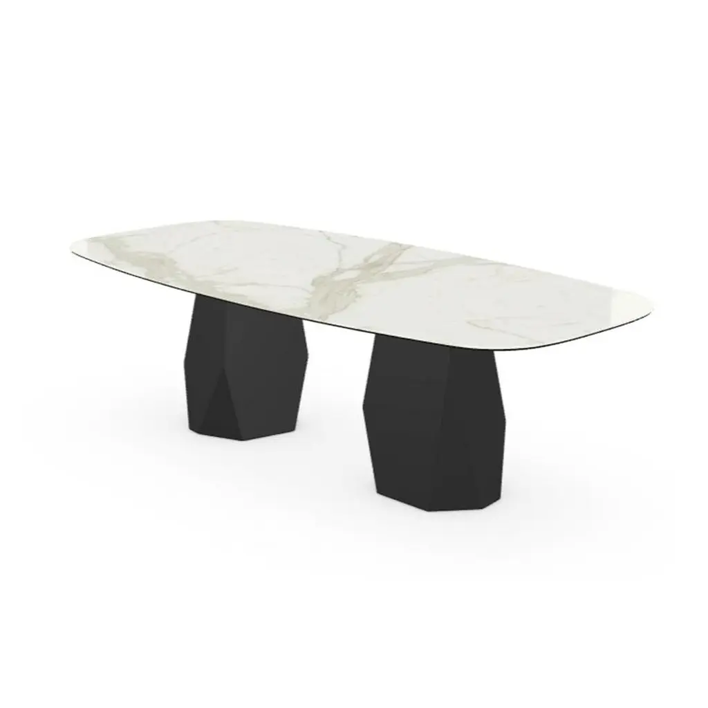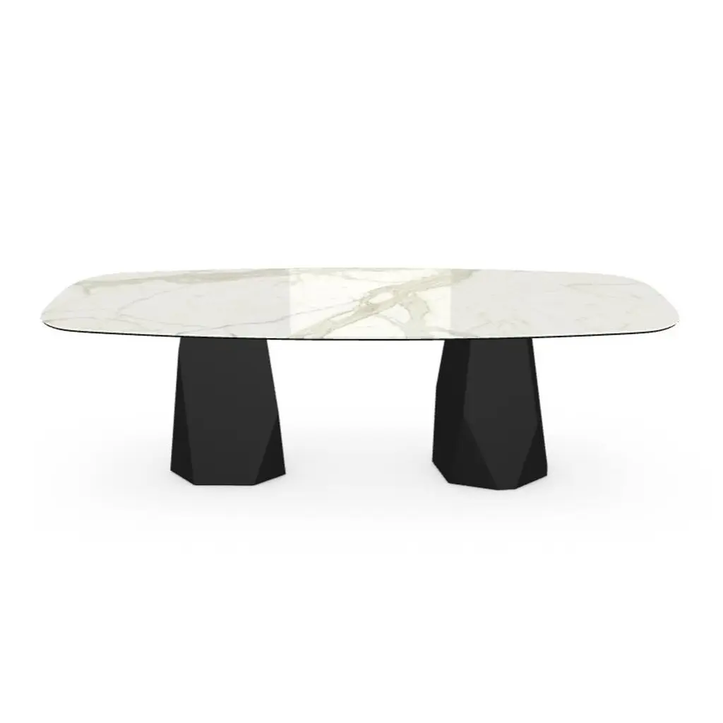 Menhir Two Bases, Dining Table With Calacatta Ceramic Top On Black Metal Base