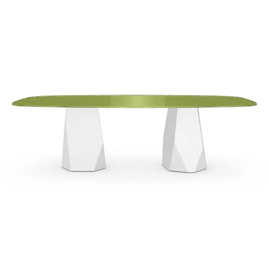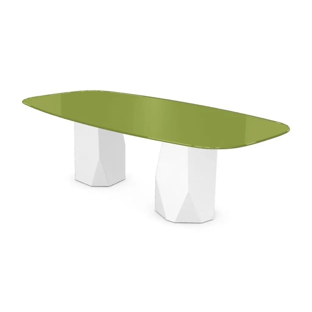 Menhir Two Bases, Dining Table With Green Glass Top On Metal Base