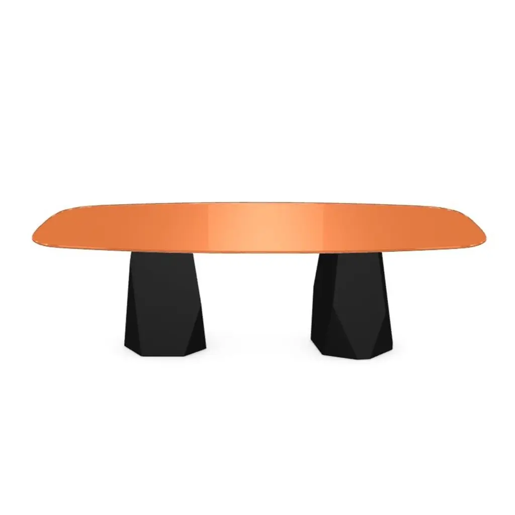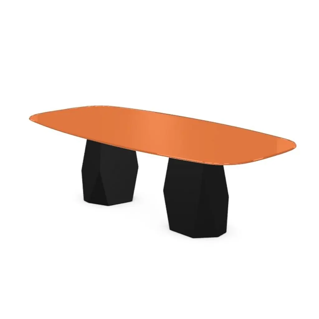 Menhir Two Bases, Dining Table With Orange Glass Top On Black Metal Base