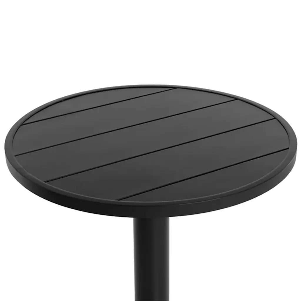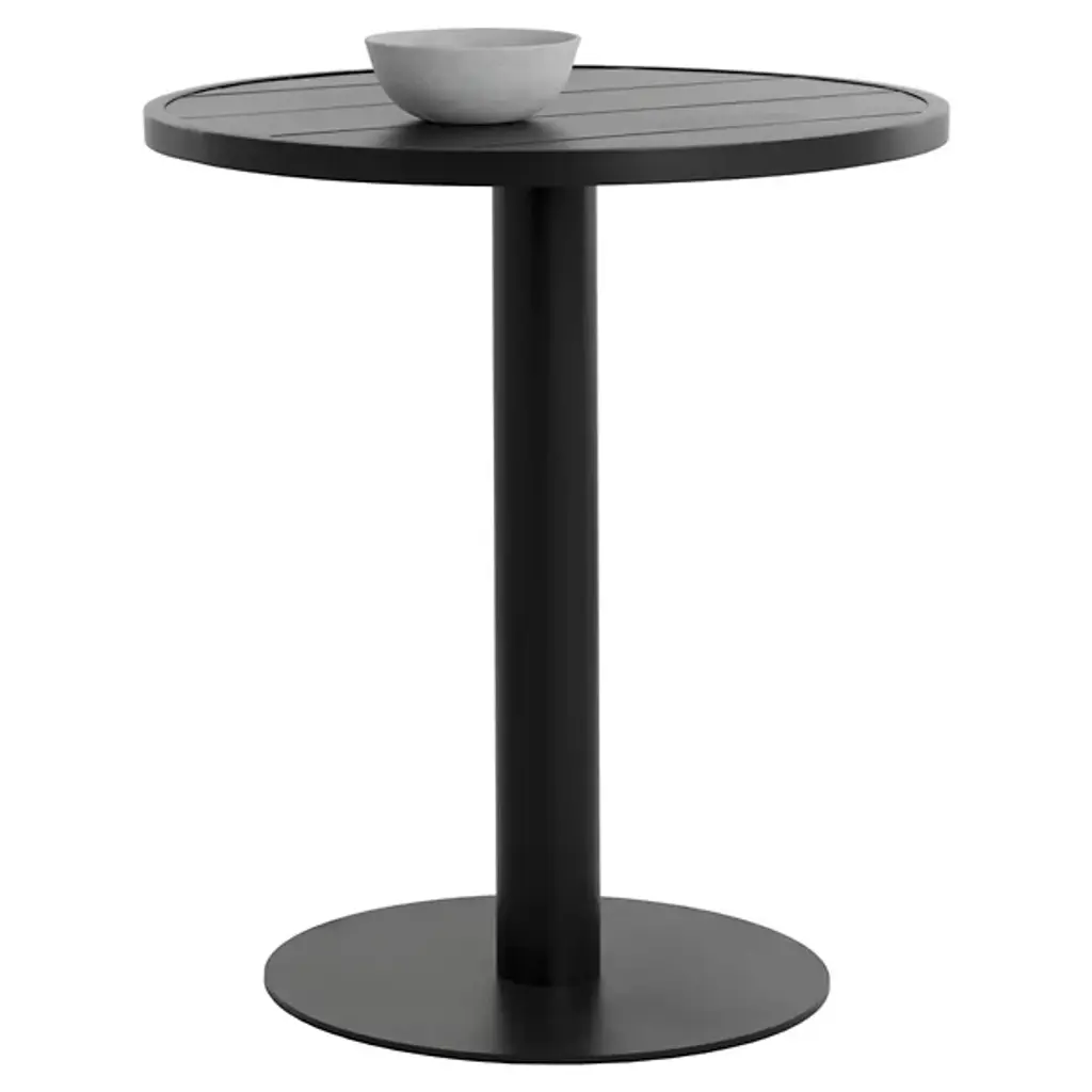 The Merano Indoor/Outdoor Bar Table from Sunpan offers a contemporary twist on timeless design, combining sleek form with functional elegance. Its smooth curves and rounded silhouette create a modern aesthetic, making it a stylish addition to any indoor or outdoor space. Crafted from durable black powder-coated aluminum, it features a slatted tabletop that adds texture and practicality. This table blends clean lines with classic charm for a versatile and refined dining solution.