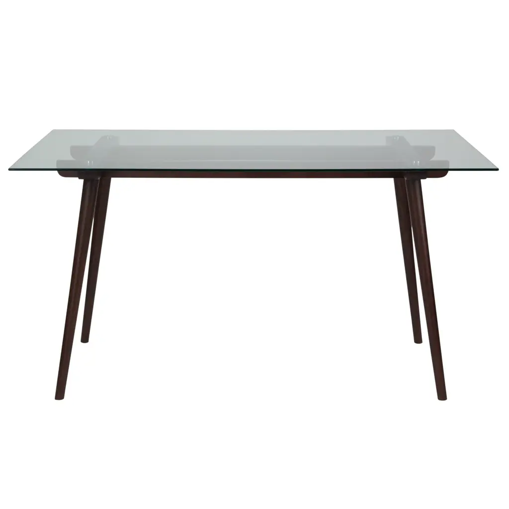 When you want a modern, up to date look for your eat-in kitchen, breakfast nook or smaller dining room give this mixed media standard height dining table a try. The pairing of a clear glass top with the solid beechwood frame gives this contemporary rectangular dining table a cultivated look that will match any decor. The transparent glass top lends an open airy feel to your space and contrasts beautifully with the dark espresso finish. The sturdy beechwood frame and 8mm thick tempered glass top are ultra strong to hold up to 330 lbs. static weight capacity. Fixed glides on the feet will protect your flooring from damage due to accidental movement or when you want to rearrange your space. No need to worry about spills, this table cleans up easily with a solvent and water based cleaner such as foam to leave this piece looking pristine after every meal. Assembly is under 30 minutes with the included tools for quick set up and use. Gather family and friends around this chic, rectangular dining table that can seat up to 6 people for a great meal, game night or to just hang out.